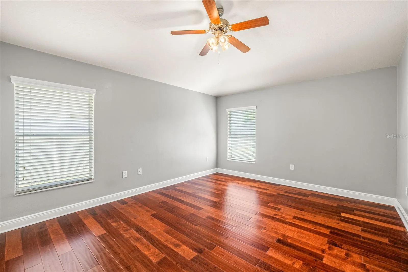 - Ceiling Fans(s), Thermostat, Primary Bedroom Main Floor, Split Bedroom, High Ceilings, Stone Counters, Solid Wood Cabinets