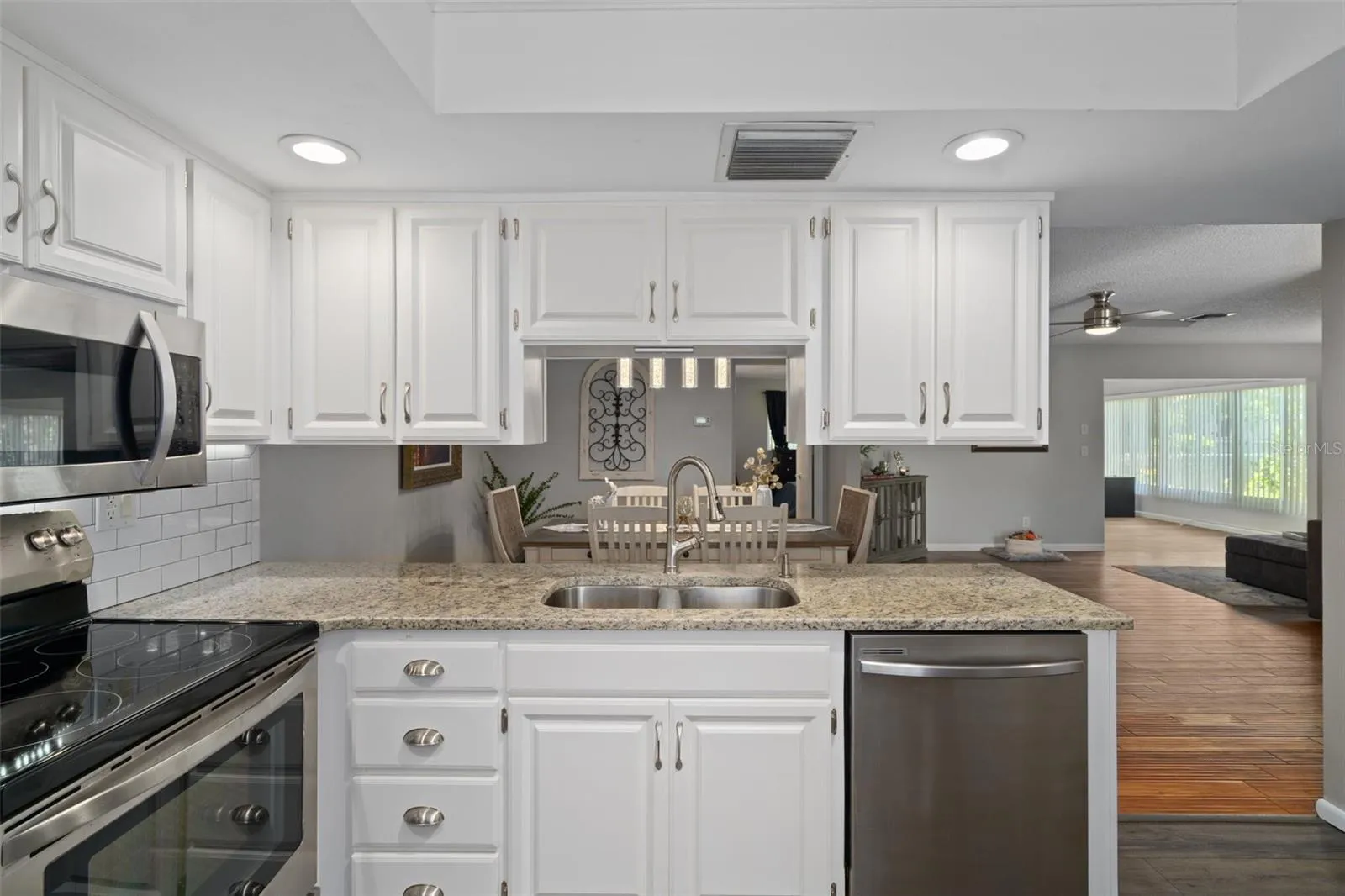 - Ceiling Fans(s), Thermostat, Walk-In Closet(s), Living Room/Dining Room Combo, Eat-in Kitchen, Primary Bedroom Main Floor, Split Bedroom, Window Treatments, Stone Counters, Tray Ceiling(s)