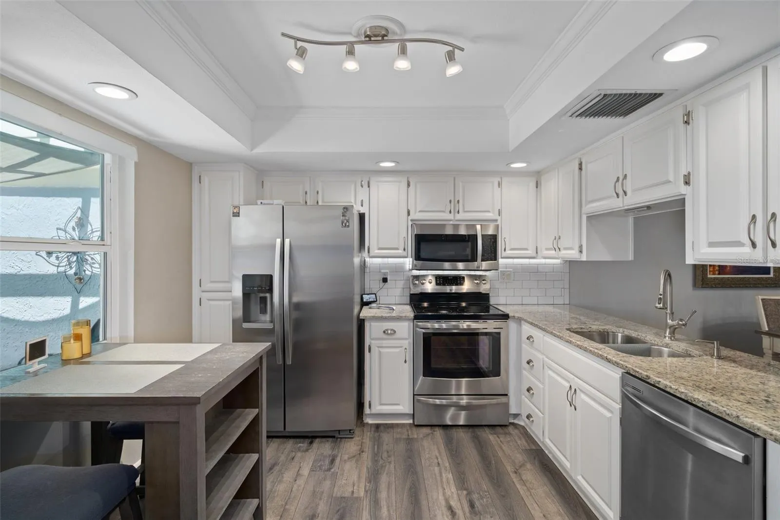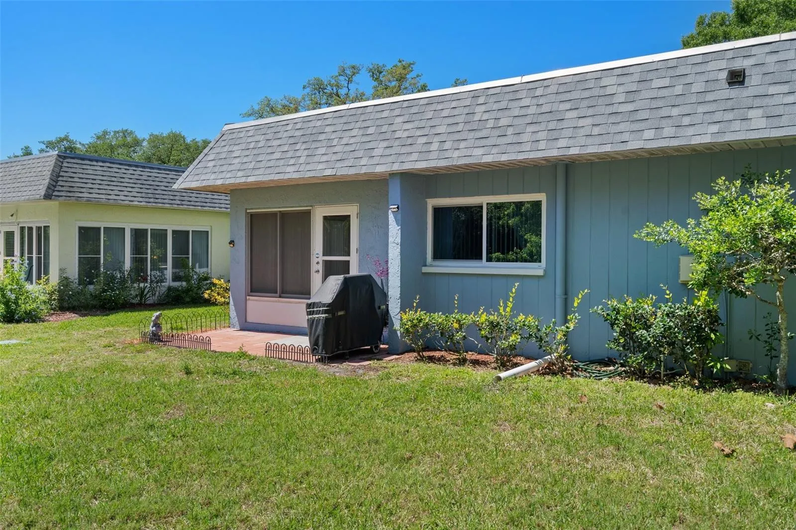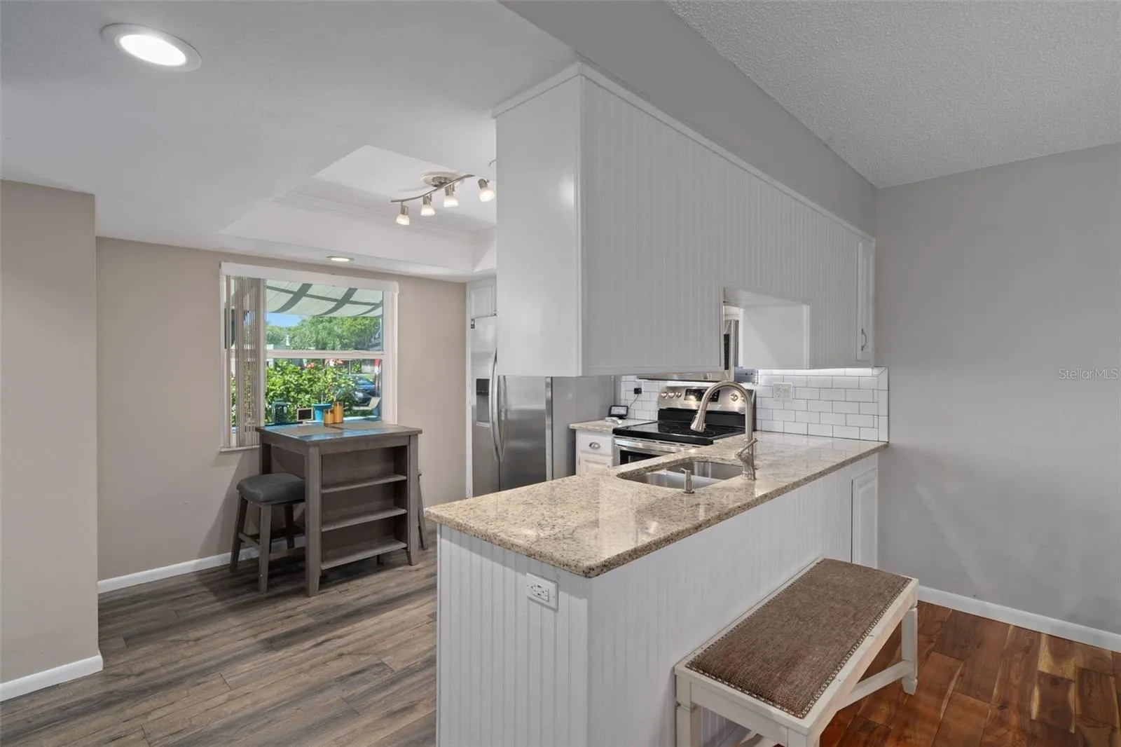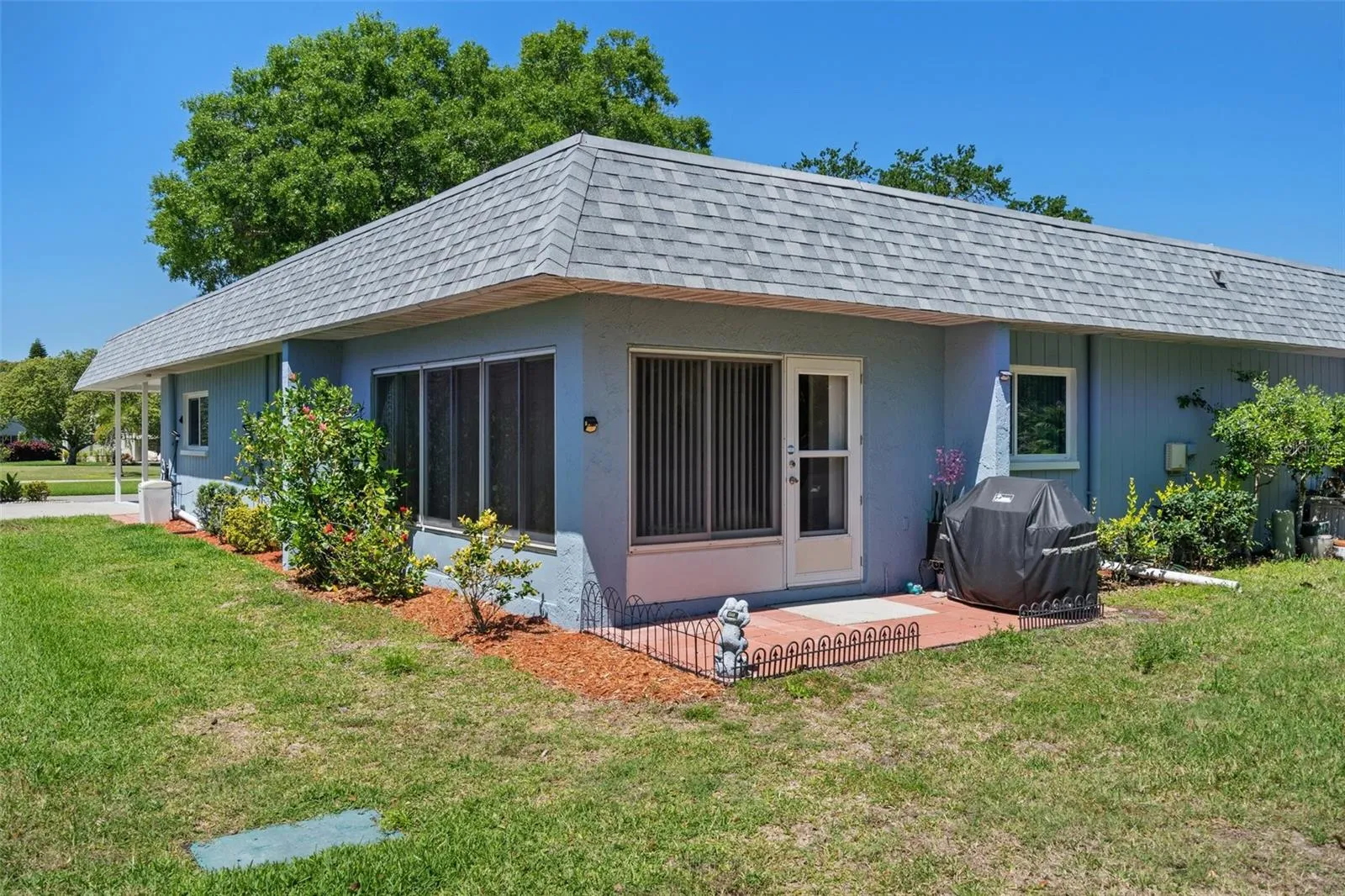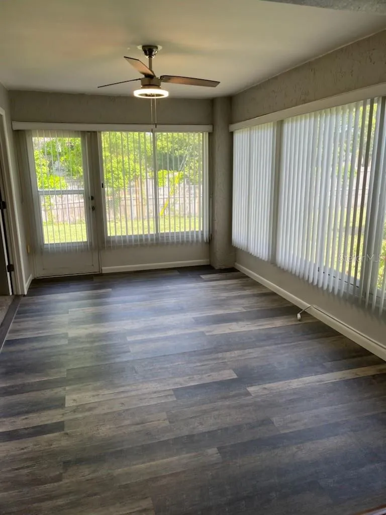 Welcome home to your freshly painted, beautifully updated condo in the gated community of Seven Springs Golf and Country Club with great view of the 13th hole from the front patio. 2-bedroom, 2-bathroom with bonus sunroom. Kitchen has updated stainless steel appliances and quartz countertops. Master bedroom with good-size walk-in closet has beautiful French doors that lead to the sunroom. Updated master bathroom with bright quartz countertop and walk-in shower. Second bathroom also has new bright quartz countertop and refinished bathtub and new tile flooring. New tankless water heater in attached storage unit. Dining room has gorgeous modern light fixture included! There is ample parking space with the long driveway, room to park four to five cars! Sit on the front patio and enjoy the sunset. The beautifully gated front patio also has an awning and beautiful view which overlooks the 13th hole of the Executive Course. Home warranty transfers until August 2025.