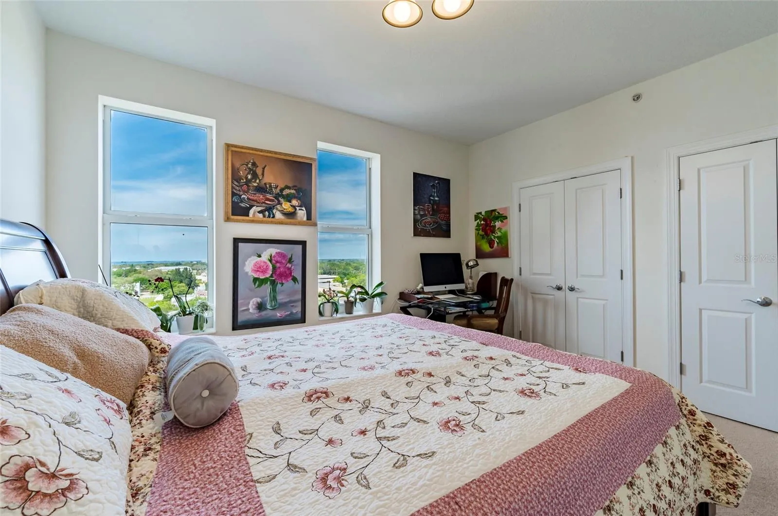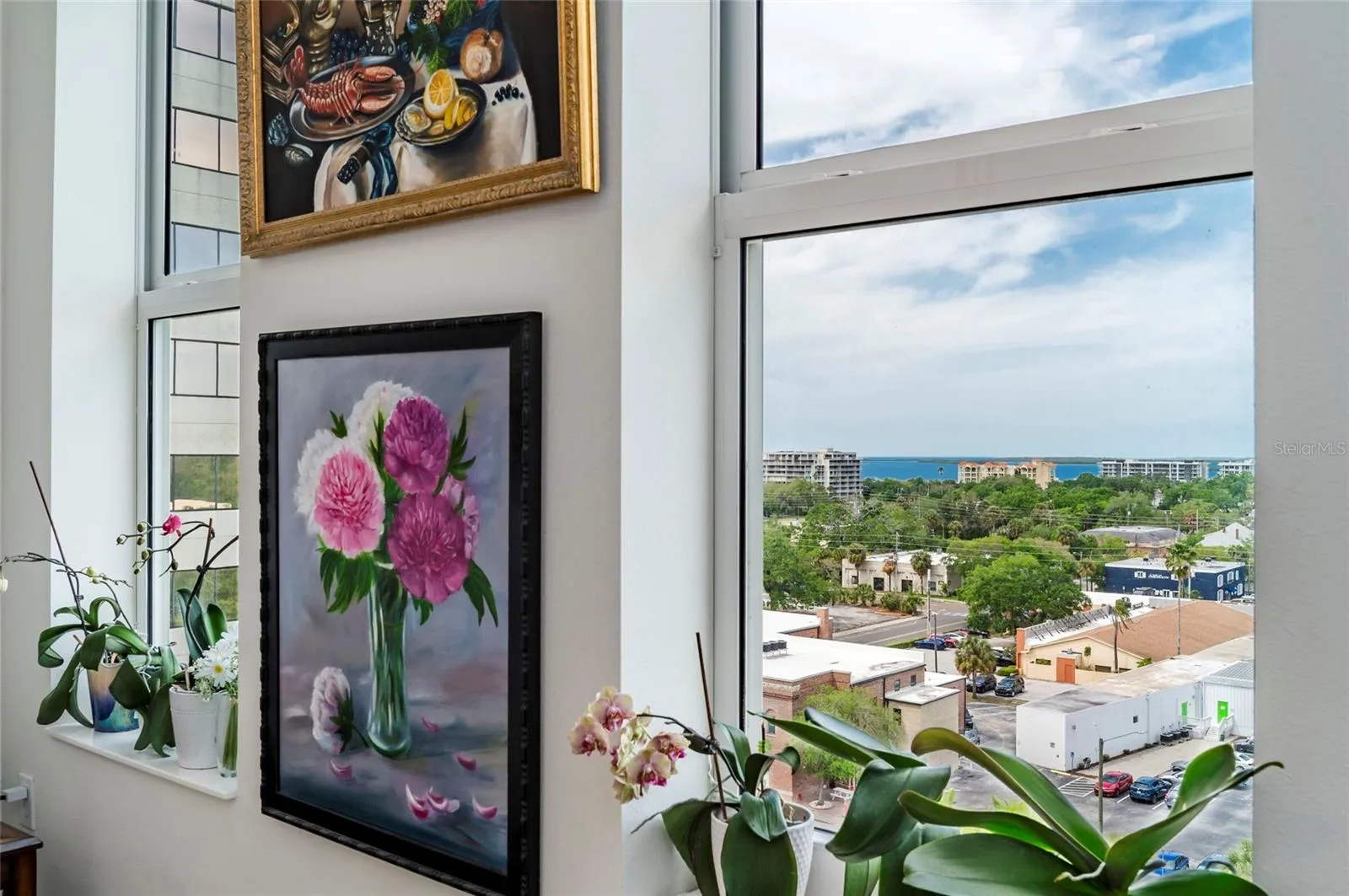 Welcome to the rare north facing 2-bedroom floor plan with WATER VIEWS located in the vibrant heart of downtown Clearwater, where local charm meets coastal elegance. This unique floor plan offers true downtown living. With meticulous attention to detail, this residence shows pride of ownership. Floor-to-ceiling windows flood the space with natural light, showcasing breathtaking views of the city and shimmering waters beyond. The open-concept living area seamlessly flows into a gourmet kitchen, surrounded by seller’s personal art studio, creating a unique experience. The serene master suite offers a private retreat, while the additional bedroom provides versatility and comfort. Residents can indulge in the unparalleled amenities of urban living, including a 6th floor amenities terrace with panoramic vistas from the lap pool, outdoor shower, grills, panoramic vistas, a fitness center, and a club room. Located right on Cleveland street – walk to fine dining and causal cafes, cultural venues such as the Capitol theater, and minutes from Clearwater Beach, this condominium presents an unparalleled opportunity to experience the coastal lifestyle in a bustling Downtown city vibe.