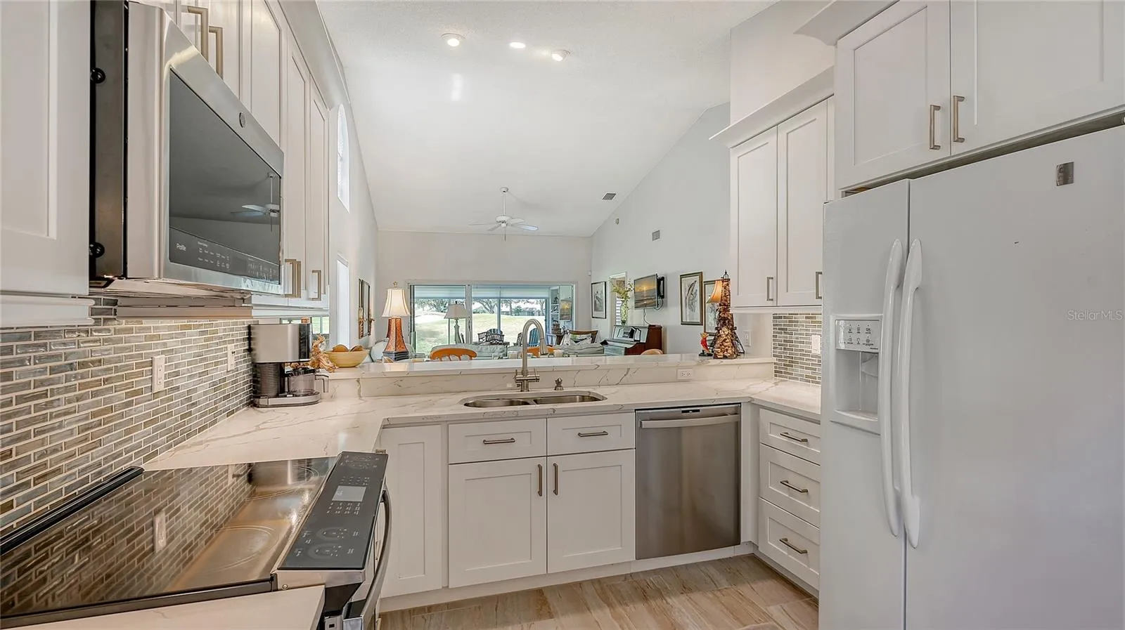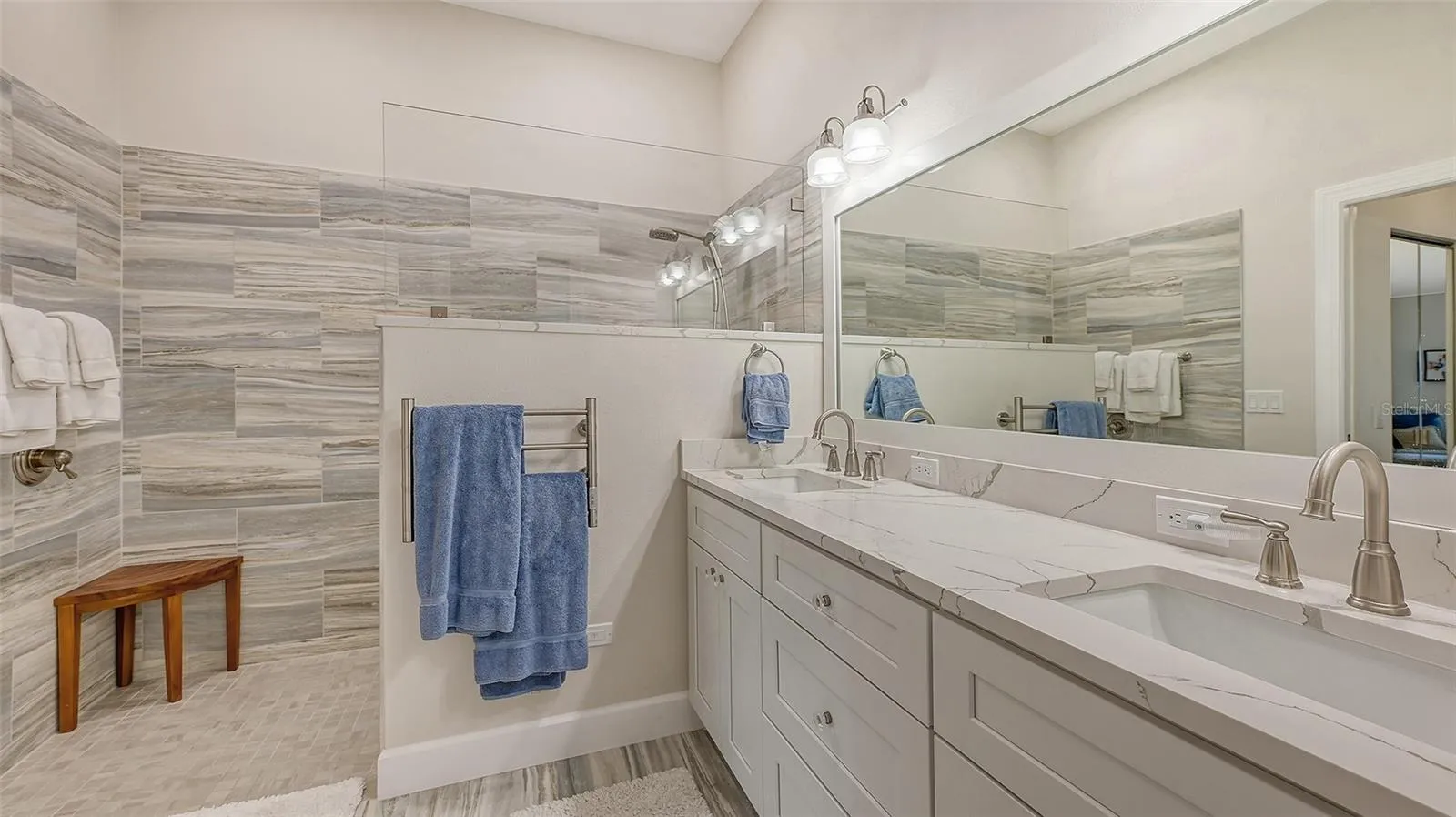 Welcome home to this gorgeous remodeled golf course villa in Palm Aire! Light, bright, and open concept villa with vaulted ceilings, three bedrooms, two baths, two car garage with over 2000 air-conditioned living space. Sellers have completely remodeled and opened the kitchen with white cabinetry (deep drawers, lazy susans, & pullouts), stunning quartz counters and tile backsplash, under cabinet and pendant lighting, vaulted ceilings and more. Right off the kitchen, is a paver patio making it an ideal space for your outdoor grilling and enjoying a glass of wine or your morning coffee. And, there’s another paver patio right off the Florida Room. The kitchen opens completely to the Great Room, Dining Room, and Florida Room. The primary bedroom is large by design and has vaulted ceilings with dual walk-in closets. You will love the primary bath which has been completely gutted and exudes a spa-like feel with just about every luxury amenity that you can imagine! The guest bath has also been handsomely updated. Lovely porcelain tile or luxury vinyl flooring is throughout. The HVAC was replaced in 2021 and a new roof went on in 2023. The inside utility room has additional storage closets with utility sink and the two-car garage has a multitude of storage cabinets. Just across the street, there’s the large community pool. Club Villas has one of the best locations in Palm Aire and is just a short walk to the optional Palm Aire Country Club where golf, tennis, pickleball, and social memberships are available but not required. And, talk about location in Sunny Sarasota! You are just minutes to the UTC Mall, Benderson Park, the new Mote Marine Aquarium, Lakewood Ranch, and SRQ Airport. Call for your private showing today. You won’t want to miss it! Bedroom Closet Type: Walk-in Closet (Primary Bedroom).