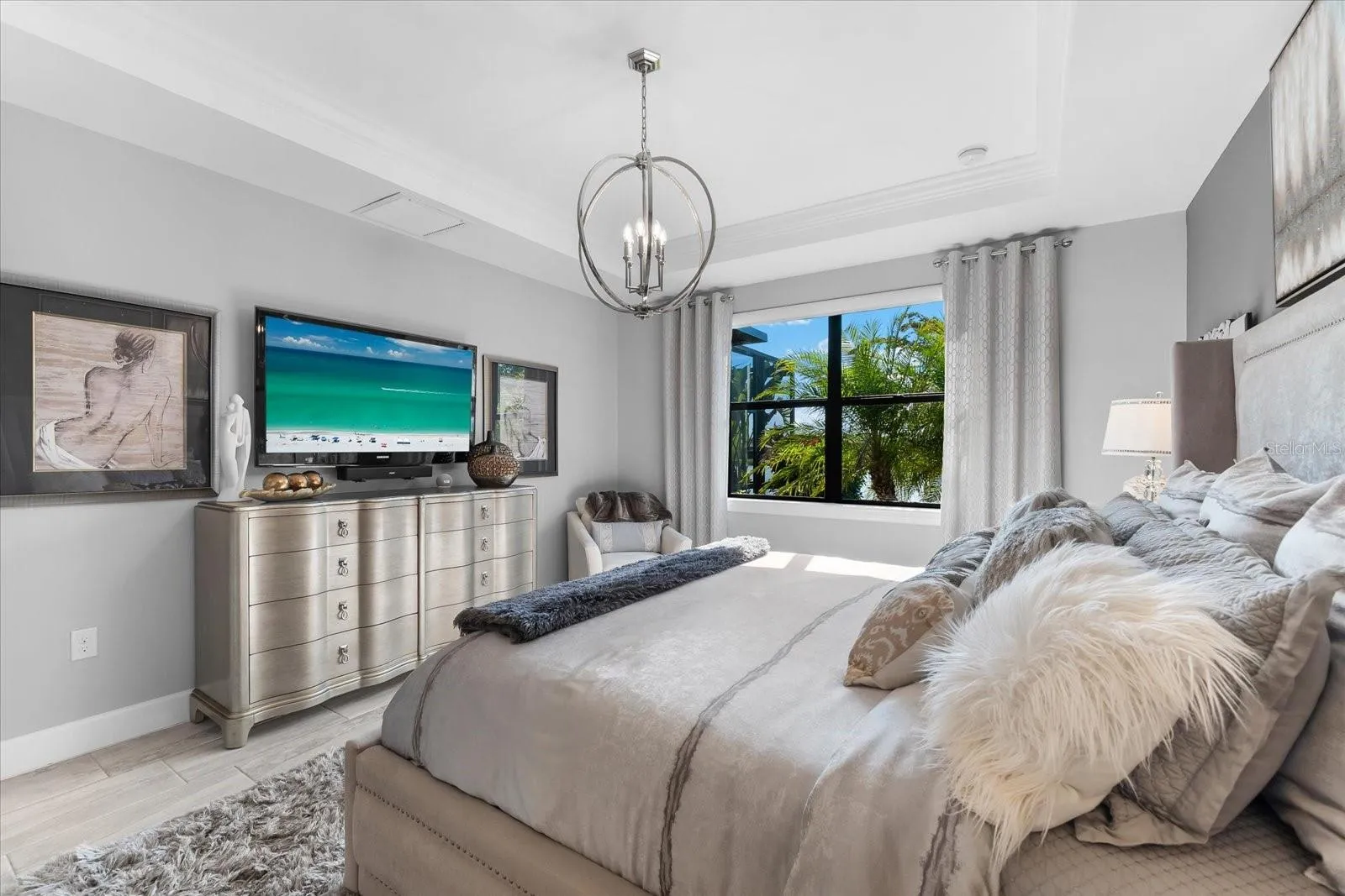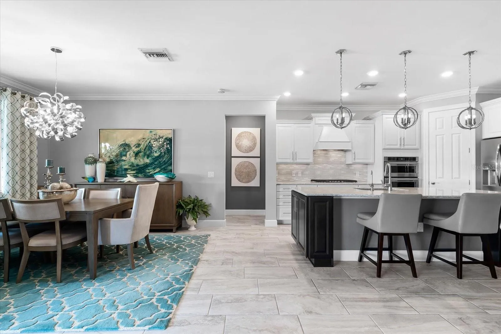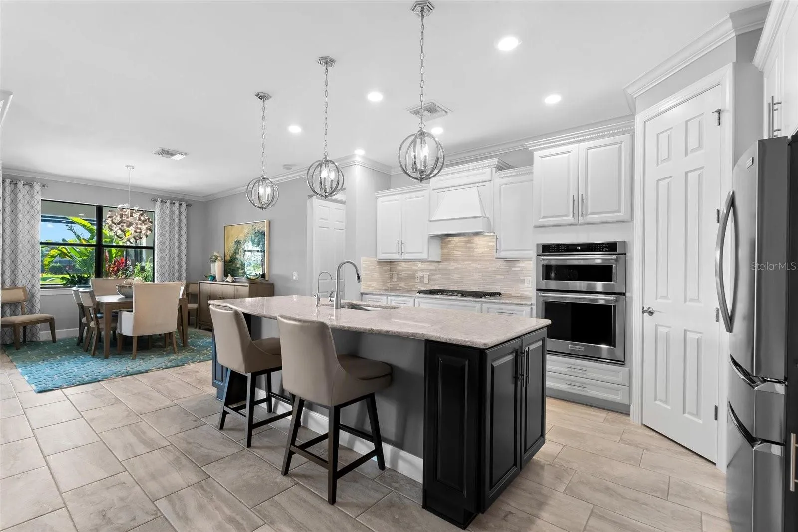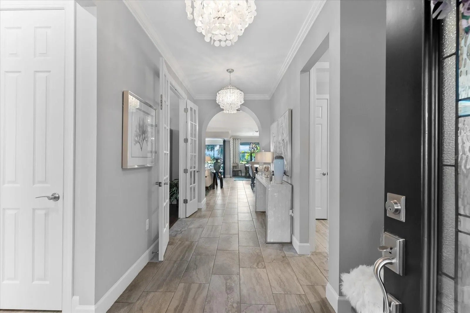 Experience the epitome of luxury living in this stunning Summerwood Model nestled within the highly sought-after Del Webb 55+ community in Lakewood Ranch, the nation’s top multi-generational development. No detail has been overlooked in this meticulously upgraded water lot home, starting with its impressive stone front elevation. Step onto the extended front porch, perfect for enjoying your morning coffee, and enter through the elegant glass front door to discover a modern interior adorned with tasteful accent walls, contemporary chandeliers, and designer ceiling fans. Crown molding, 5 ¼ baseboards, and 8-foot 6-panel interior doors add to the home’s ambiance, while neutral large plank tile floors with hardwoods in the den enhance its timeless appeal.