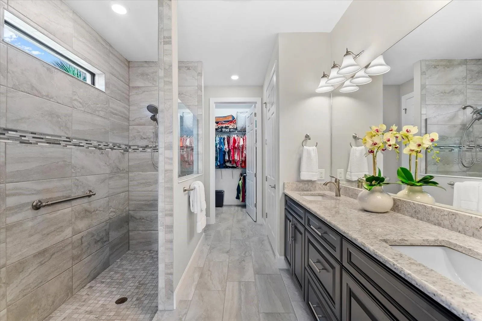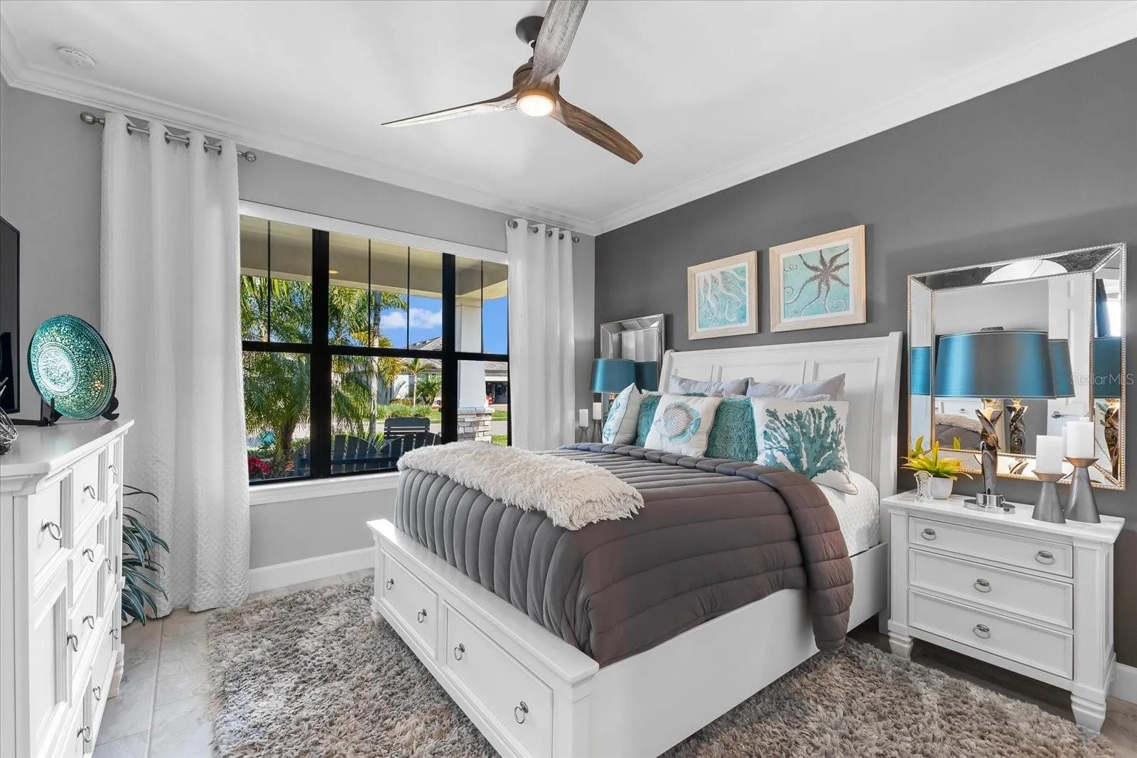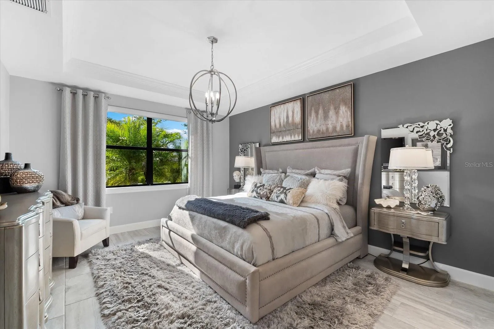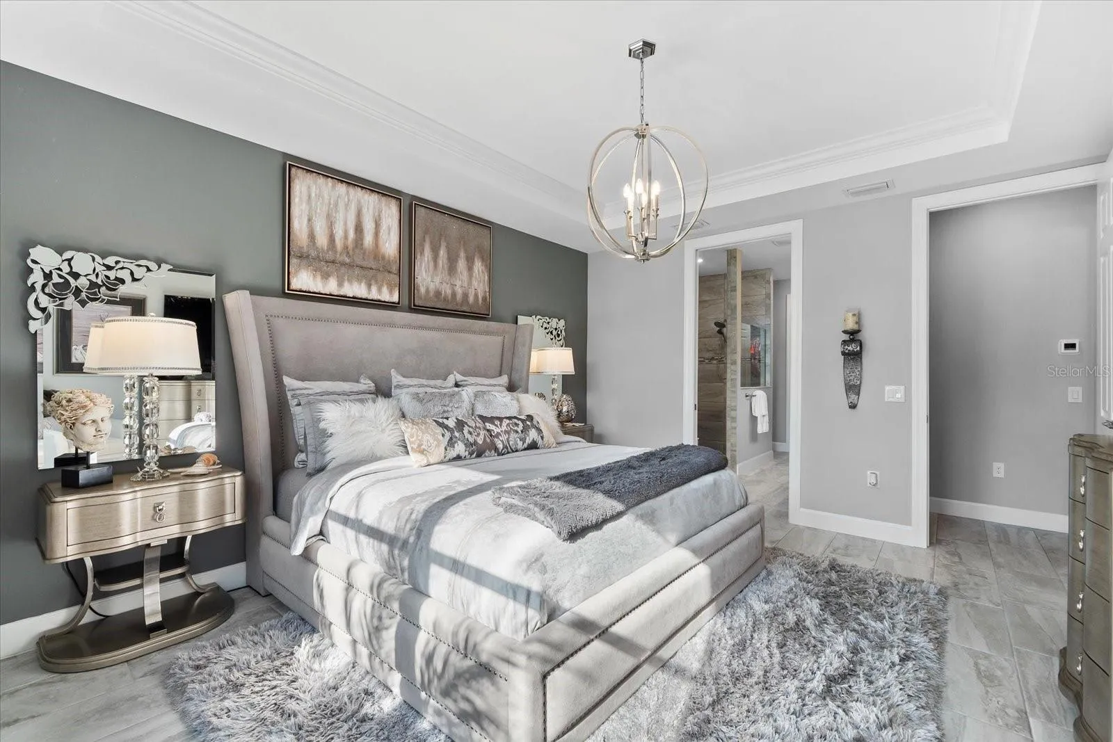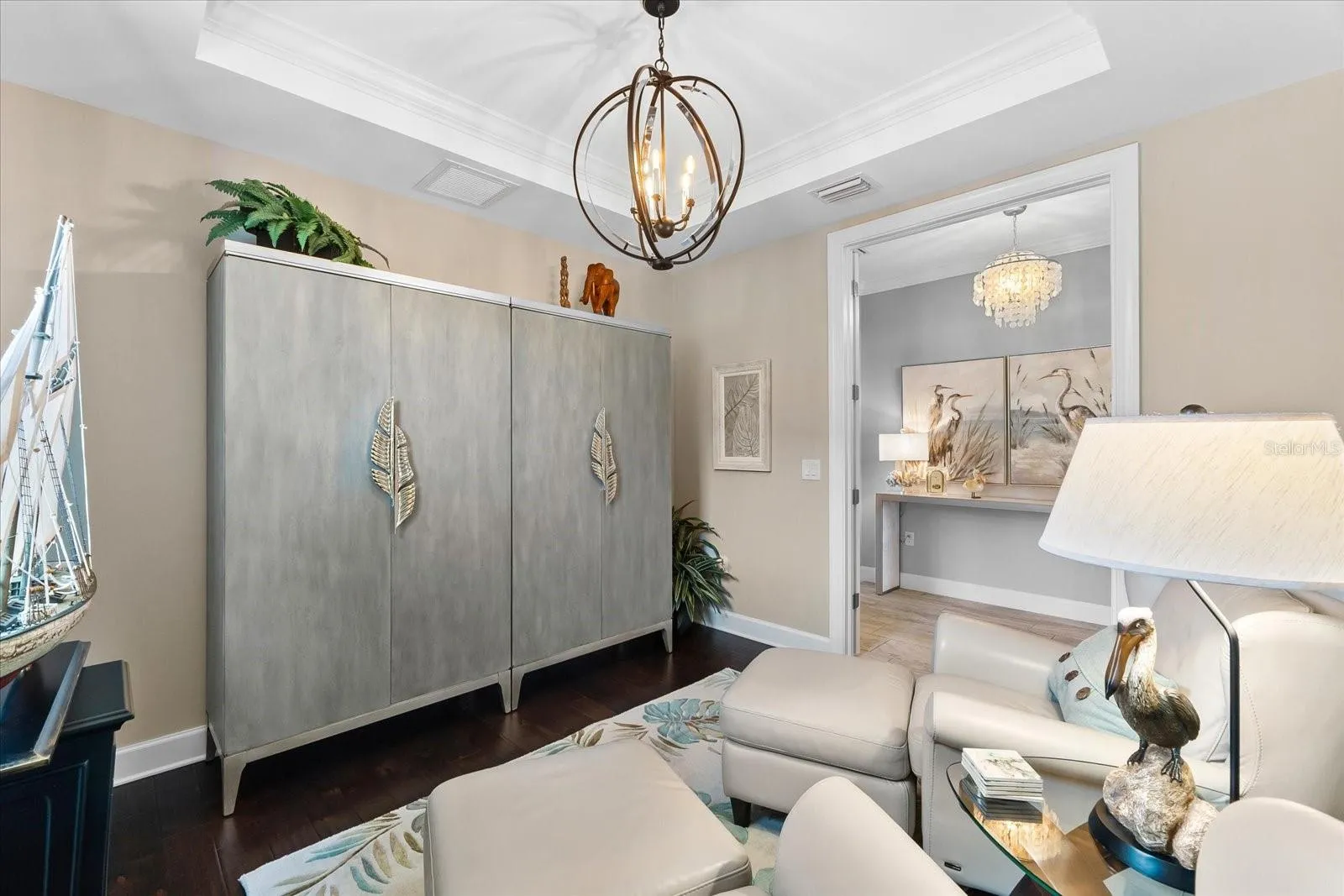 Experience the epitome of luxury living in this stunning Summerwood Model nestled within the highly sought-after Del Webb 55+ community in Lakewood Ranch, the nation’s top multi-generational development. No detail has been overlooked in this meticulously upgraded water lot home, starting with its impressive stone front elevation. Step onto the extended front porch, perfect for enjoying your morning coffee, and enter through the elegant glass front door to discover a modern interior adorned with tasteful accent walls, contemporary chandeliers, and designer ceiling fans. Crown molding, 5 ¼ baseboards, and 8-foot 6-panel interior doors add to the home’s ambiance, while neutral large plank tile floors with hardwoods in the den enhance its timeless appeal.