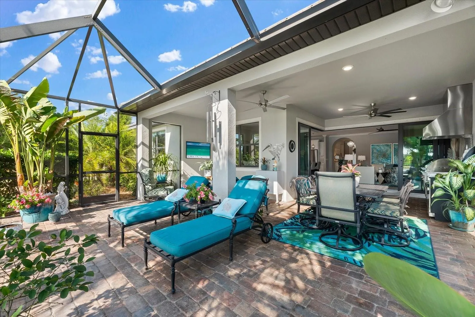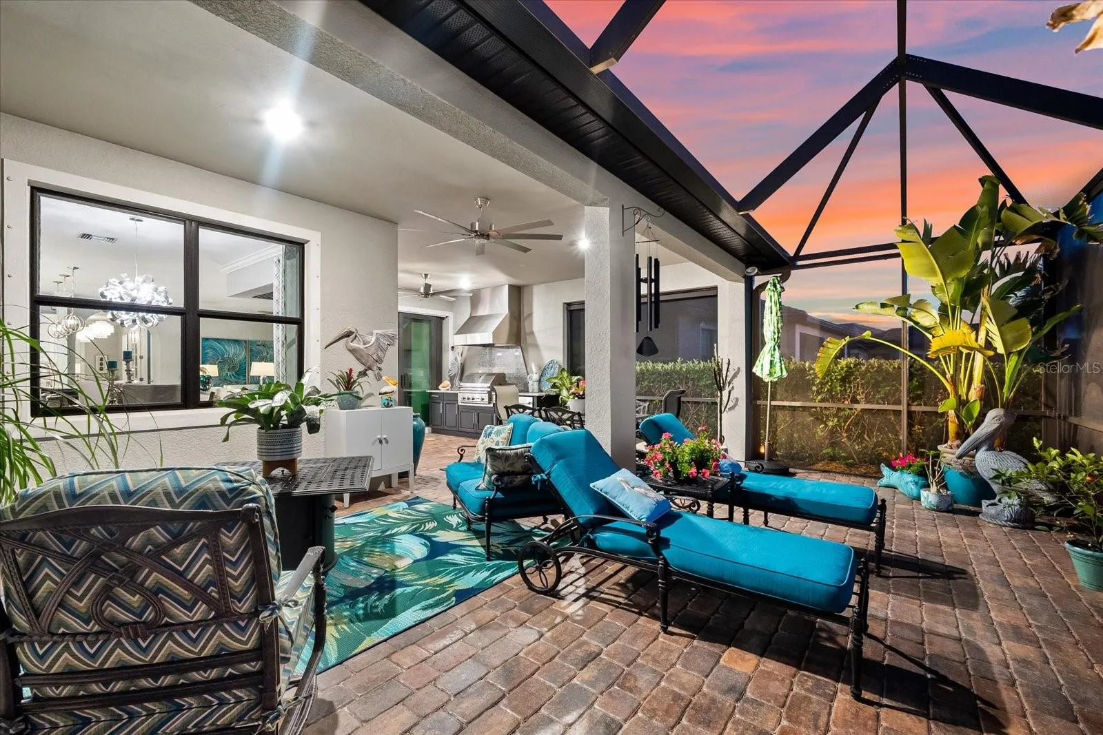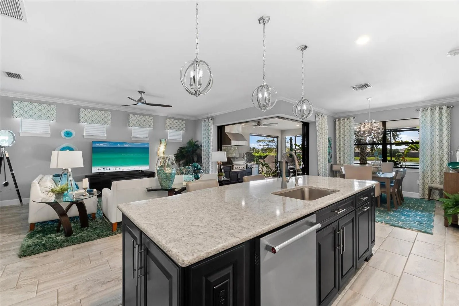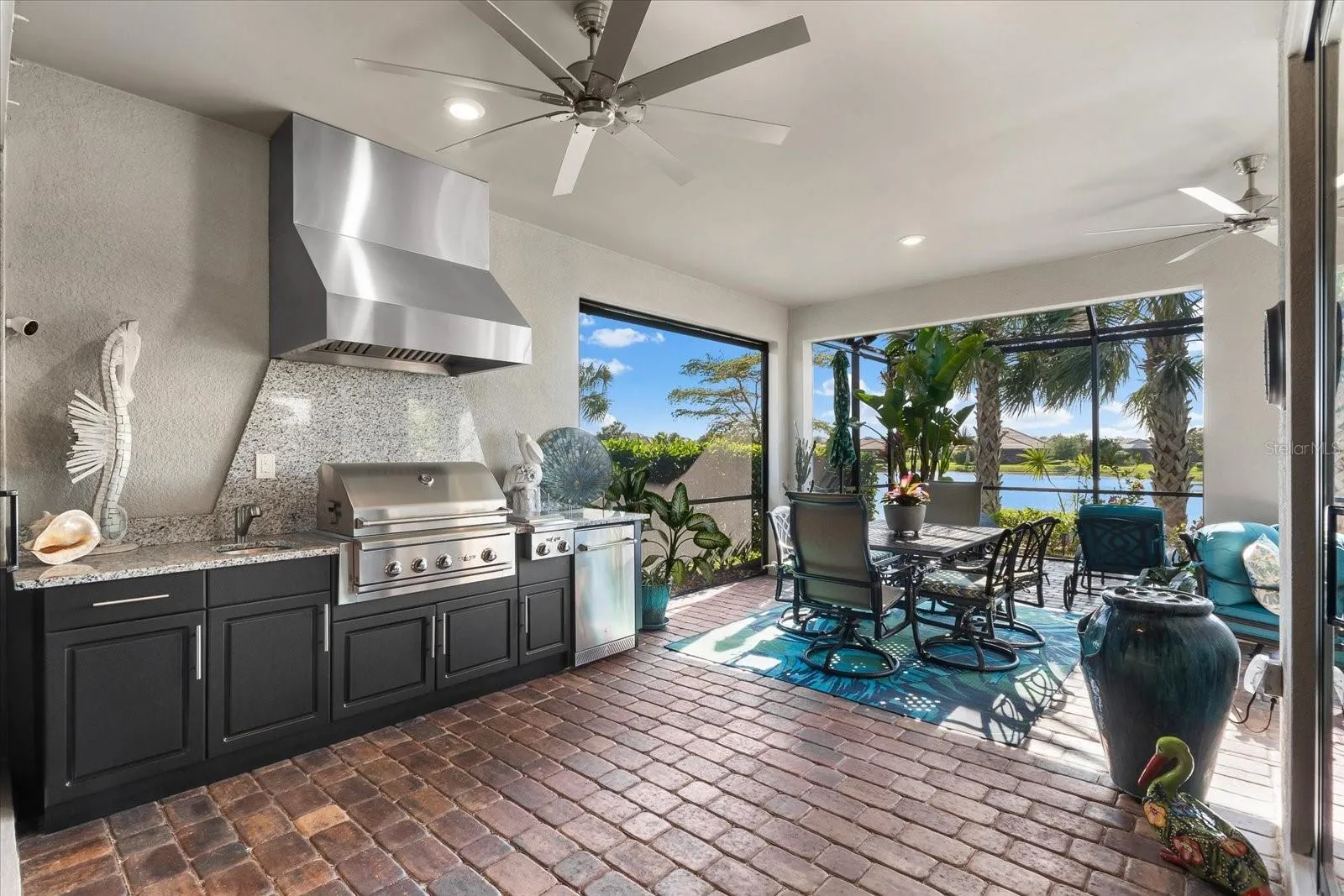 Your guests will enjoy their own private bedroom and bathroom, ensuring their comfort and privacy. The highlight of this home is the extended lanai, accessible through zero-corner sliding doors, featuring a full outdoor kitchen with a large grill, sink, side burners, refrigerator, and plenty of cabinets for storage. This space is ideal for entertaining neighbors and friends with lots of room for eating and seating areas. Enjoy the outdoors from your own outdoor oasis with mesmerizing water views.