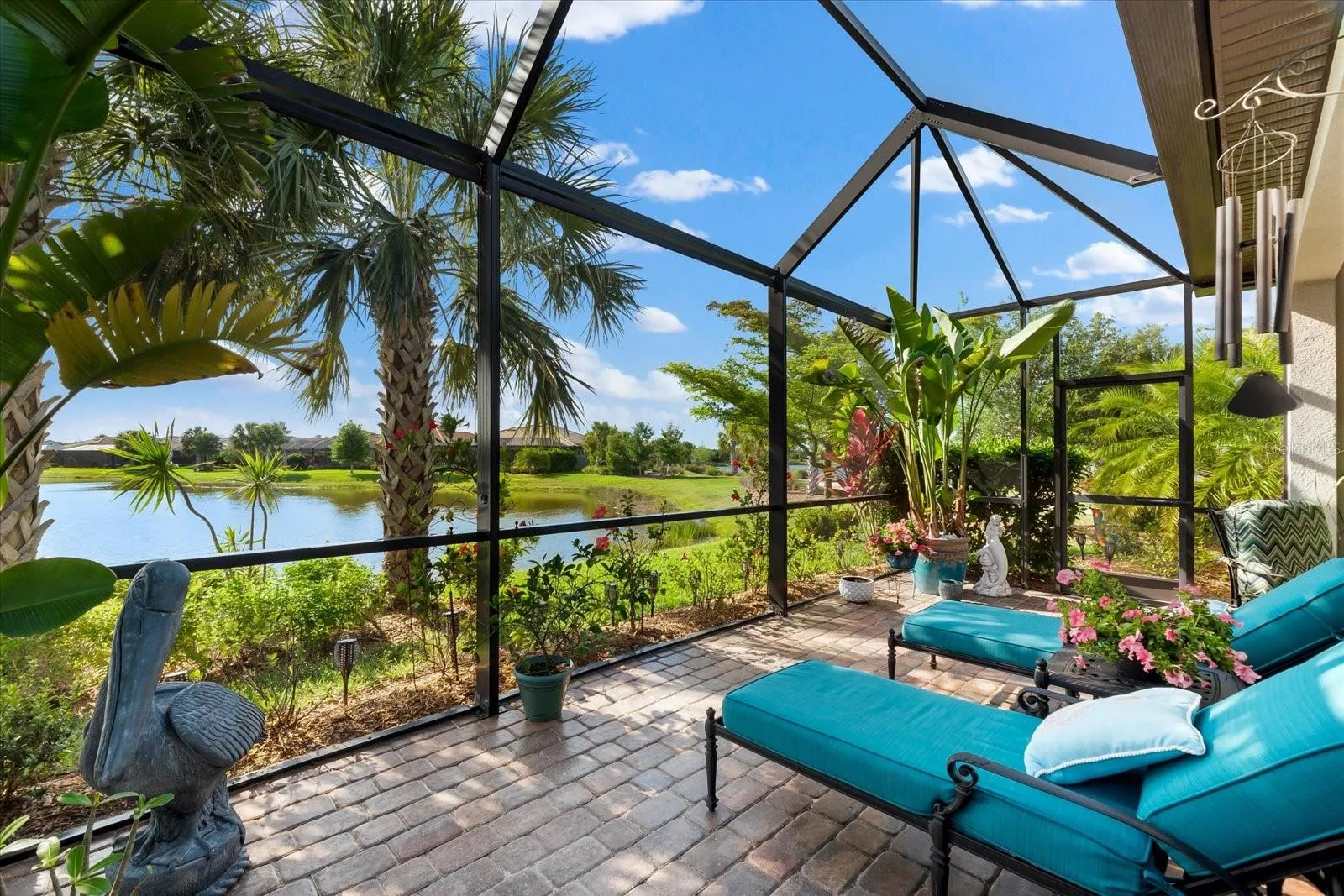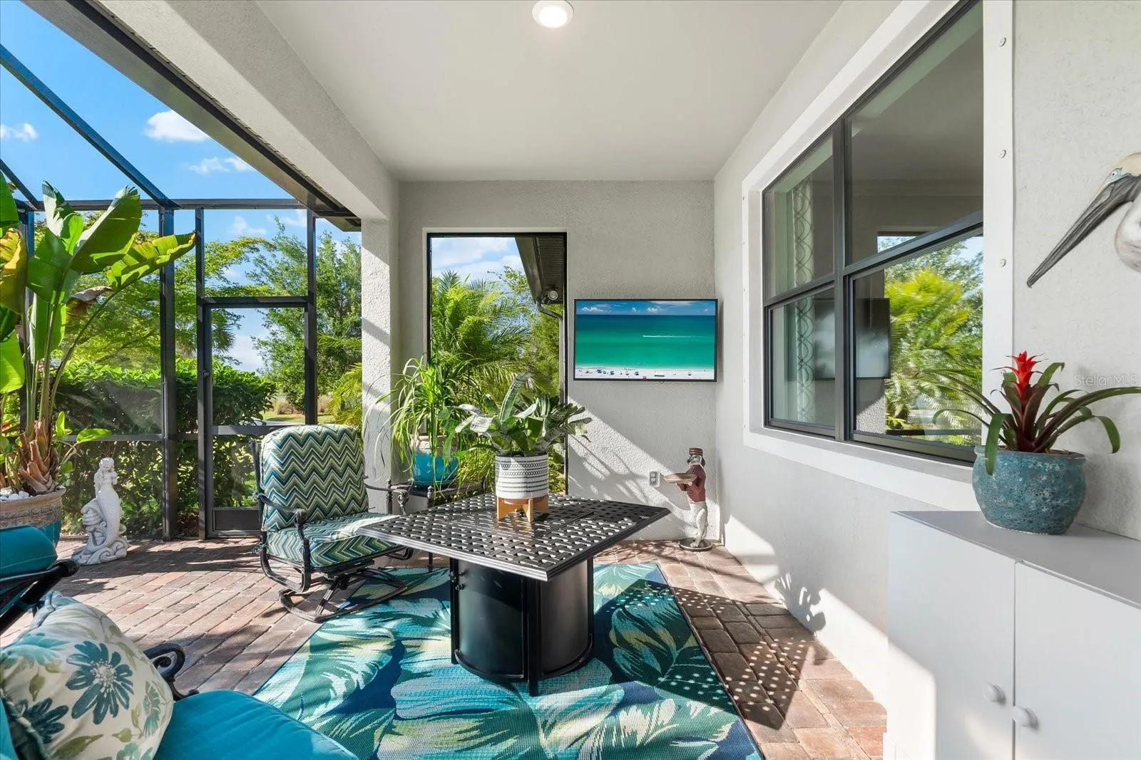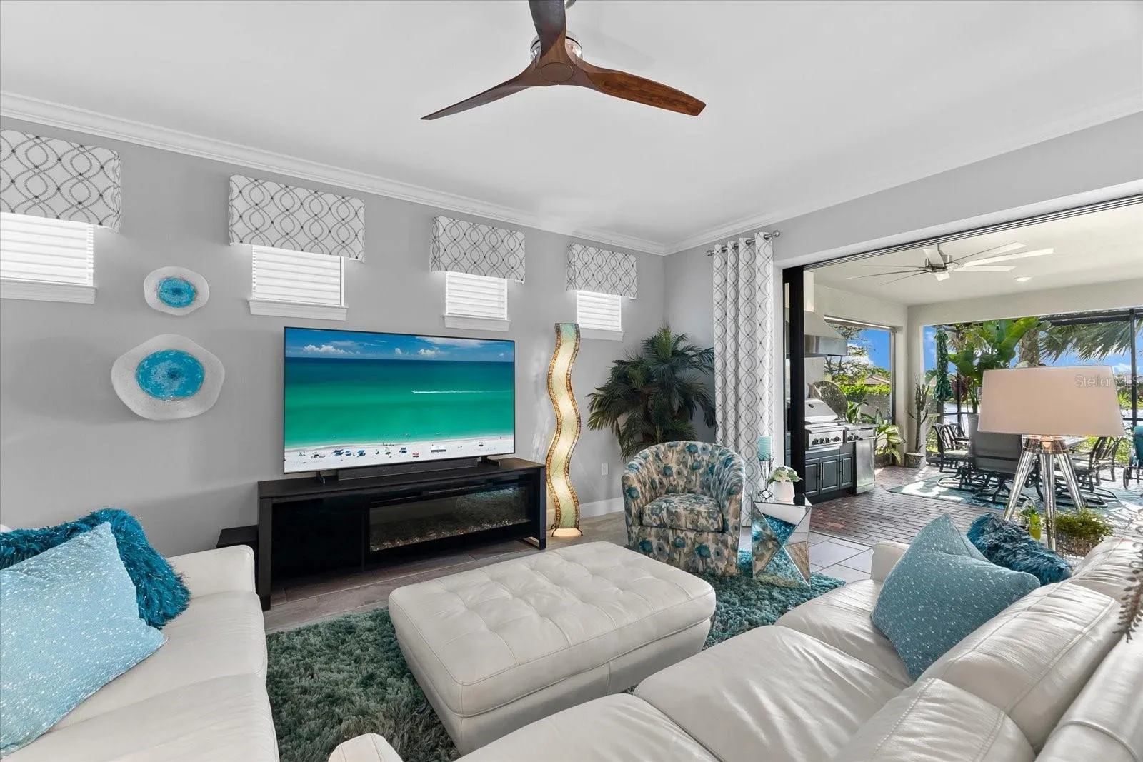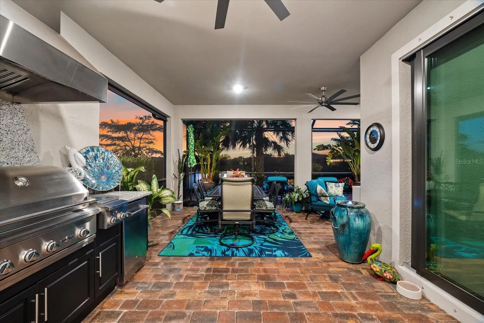 Your guests will enjoy their own private bedroom and bathroom, ensuring their comfort and privacy. The highlight of this home is the extended lanai, accessible through zero-corner sliding doors, featuring a full outdoor kitchen with a large grill, sink, side burners, refrigerator, and plenty of cabinets for storage. This space is ideal for entertaining neighbors and friends with lots of room for eating and seating areas. Enjoy the outdoors from your own outdoor oasis with mesmerizing water views.