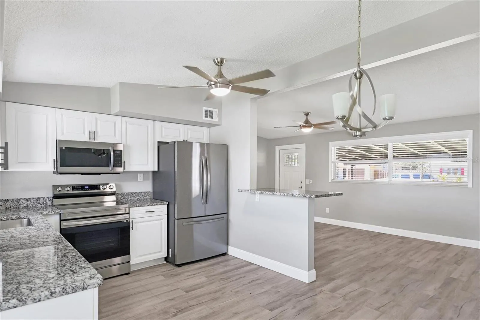 - Ceiling Fans(s), Open Floorplan, Eat-in Kitchen, Kitchen/Family Room Combo, Split Bedroom, Window Treatments, Stone Counters