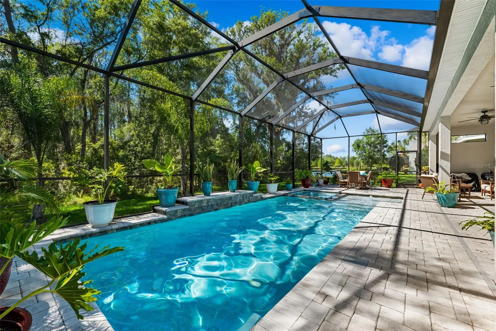 Do not miss the charming screened-in lanai, complete with a sparkling pool and relaxing spa – the perfect oasis for entertaining guests or enjoying quiet evenings under the stars. This home sits on a conservation lot which also provides an unobstructed view of the water.