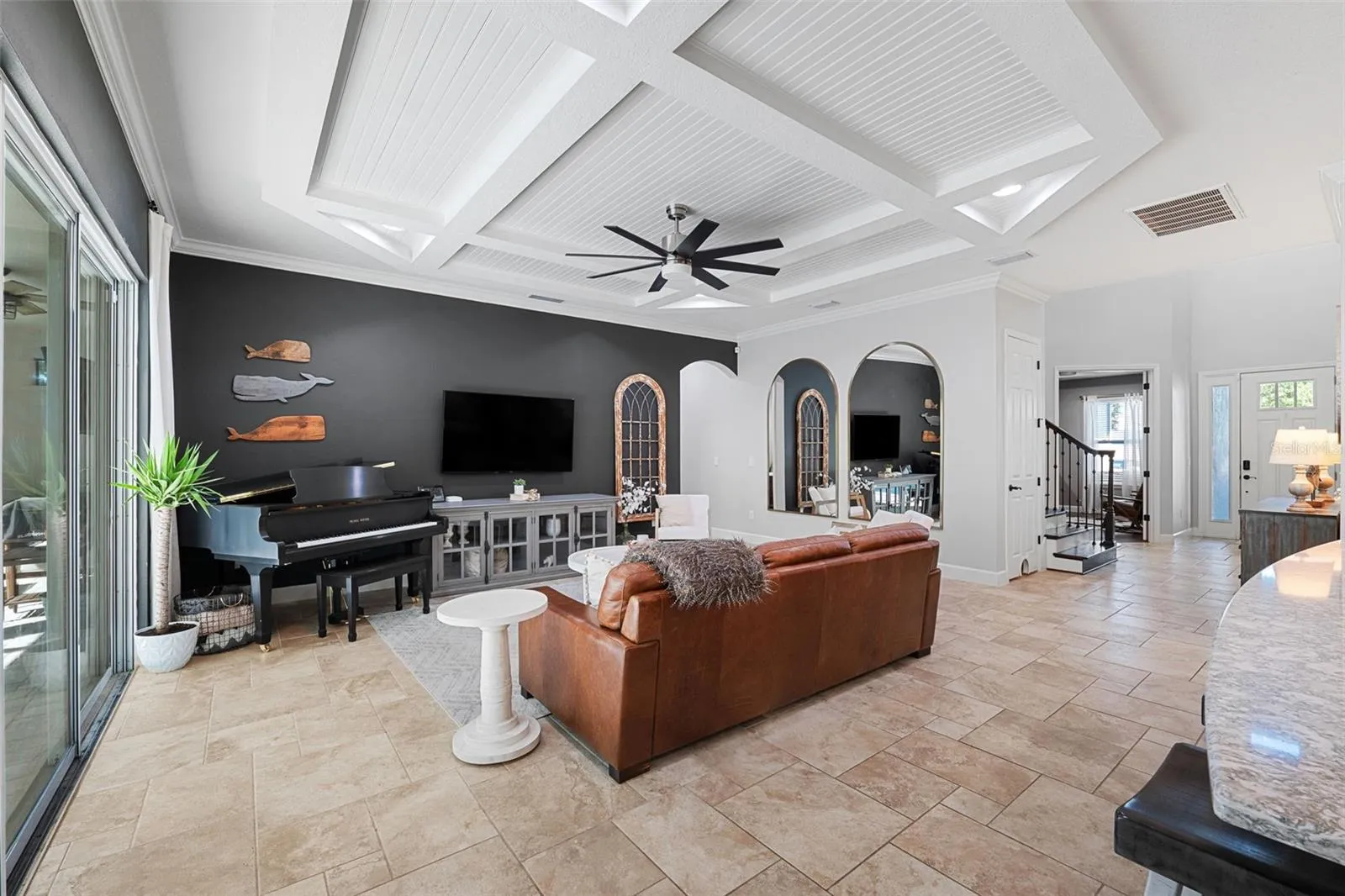 Step inside to discover an inviting home, offering many custom features, including a home office adorned with custom built-ins, providing the ideal space for remote work or creative endeavors.
