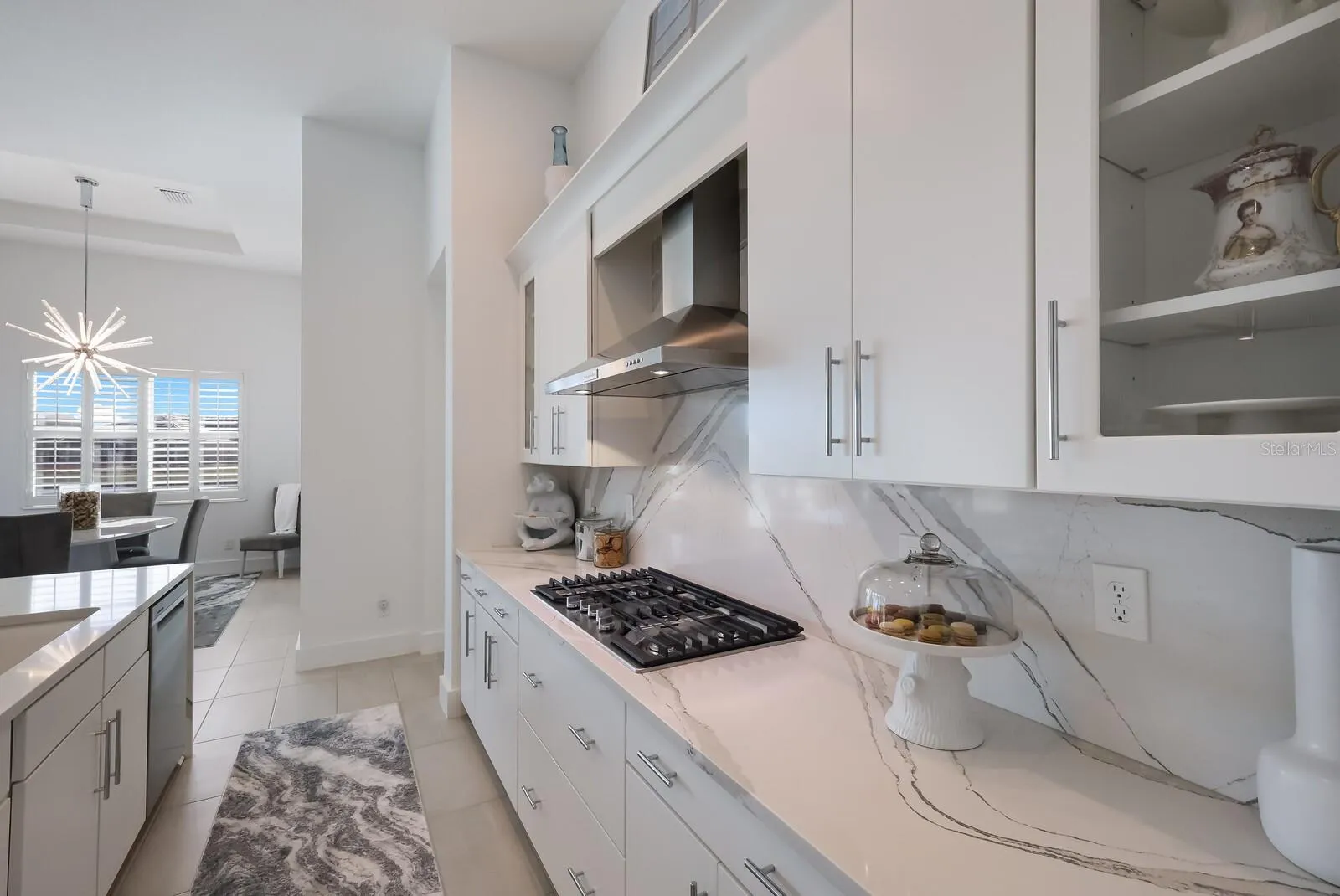 The gourmet kitchen is a chef’s delight, featuring a natural gas cooktop, KitchenAid appliances, waterfall quartz counters and backsplash, and a generous center island perfect for gatherings. Flowing seamlessly into the great room and dining area, pocket sliders lead to an expansive lanai, blurring the lines between indoor and outdoor living.