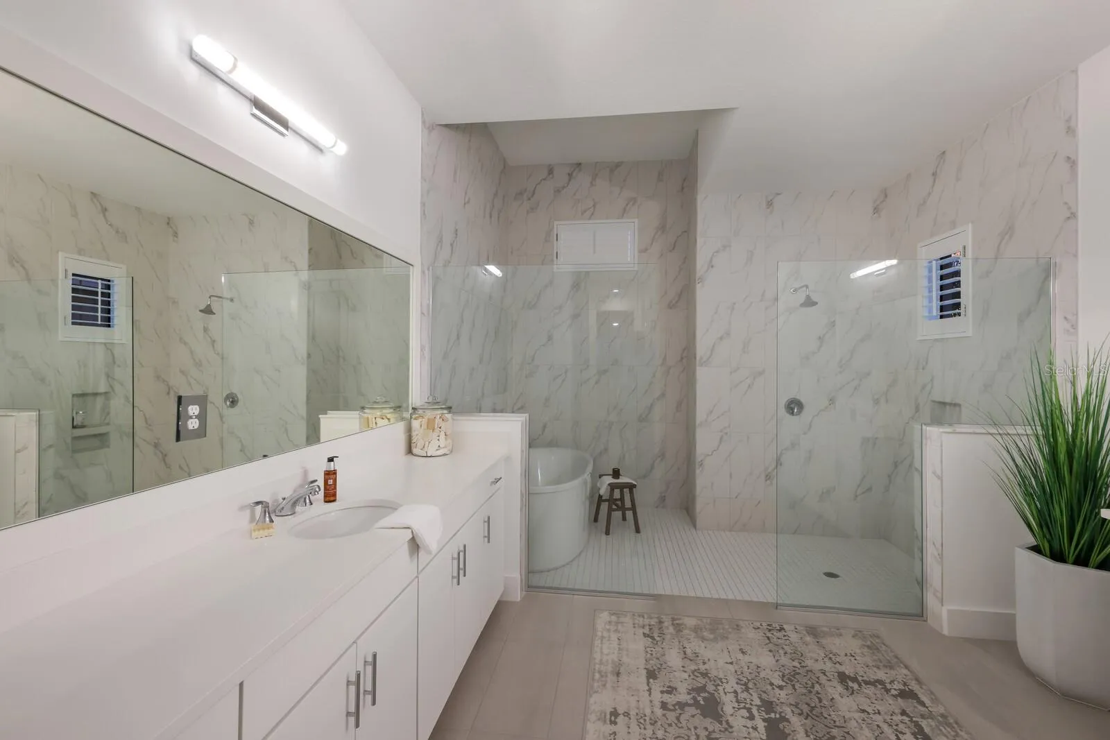 Designed for both entertaining and relaxation, the layout effortlessly combines spacious, open living areas with private retreats. The owner’s suite exudes tranquility, offering dual counters and sinks, a spacious walk-in shower, a freestanding tub, and dual walk-in closets with custom shelving.