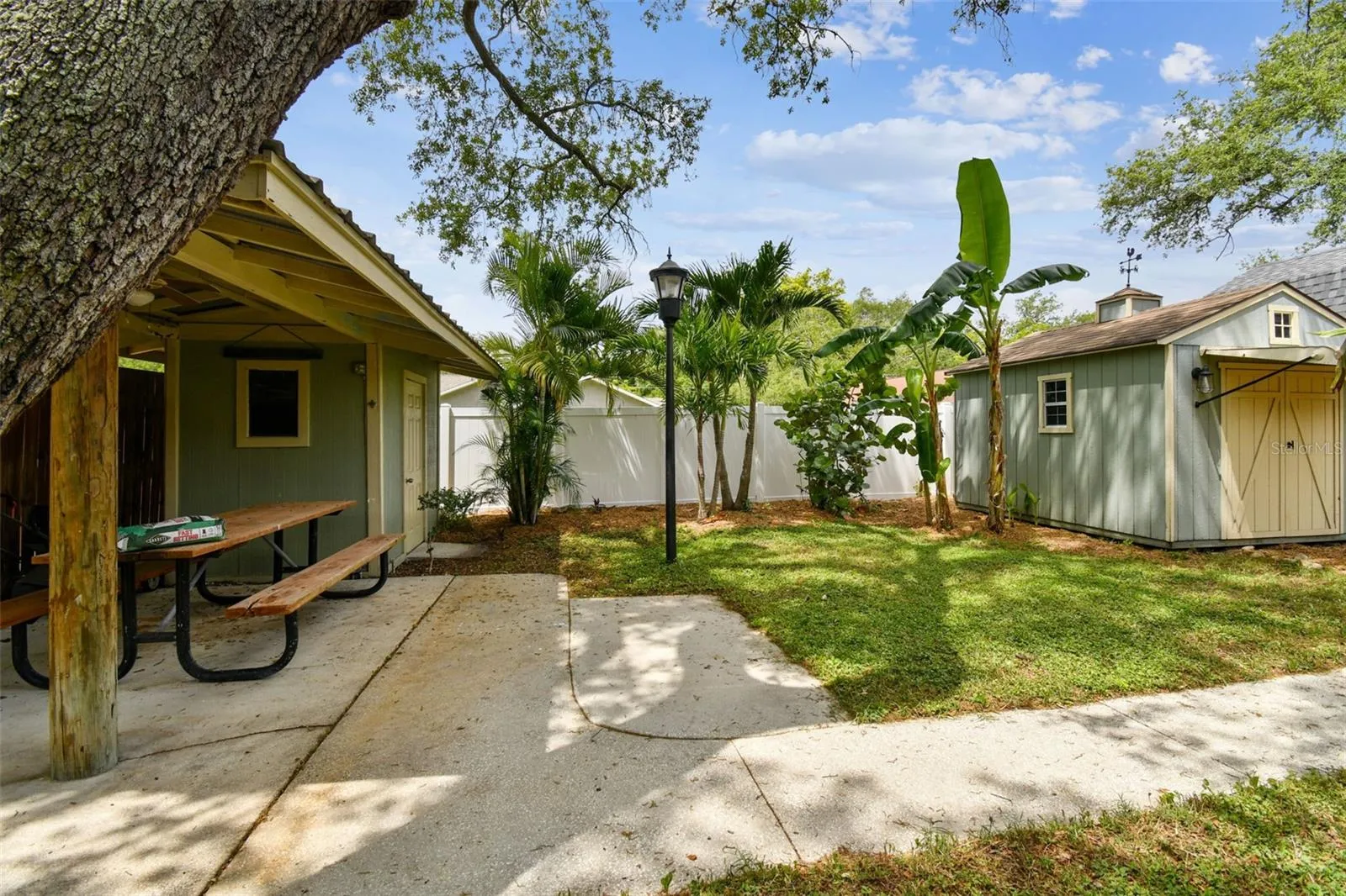 This charming three bedroom, two-bath home boasts a fenced yard, complete with a screened lanai and two sheds, perfect for outdoor storage. The spacious interior features and eat-in kitchen, large rooms, and elegant wainscoting details throughout. With a one-car garage and mature landscaping, it offers both convenience and beauty. Situated on a tranquil street with a front porch, it provides a peaceful retreat. Plus, with new underground utilities underway and no HOA, it’s an ideal blend of modern amenities and freedom.