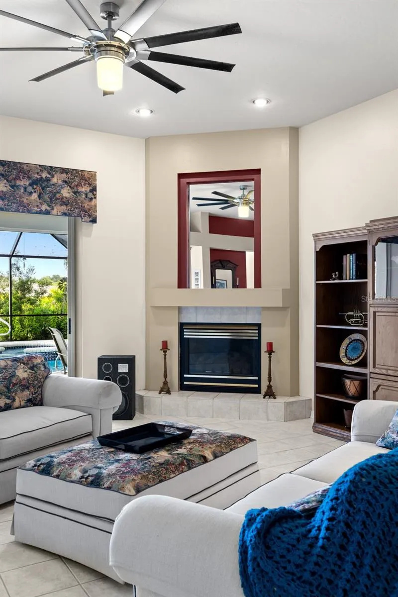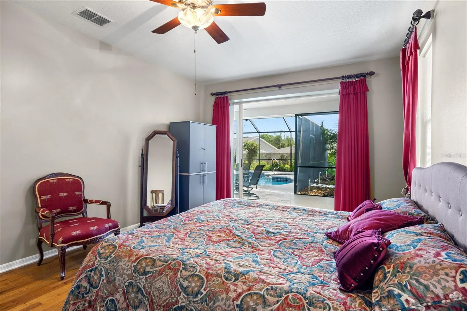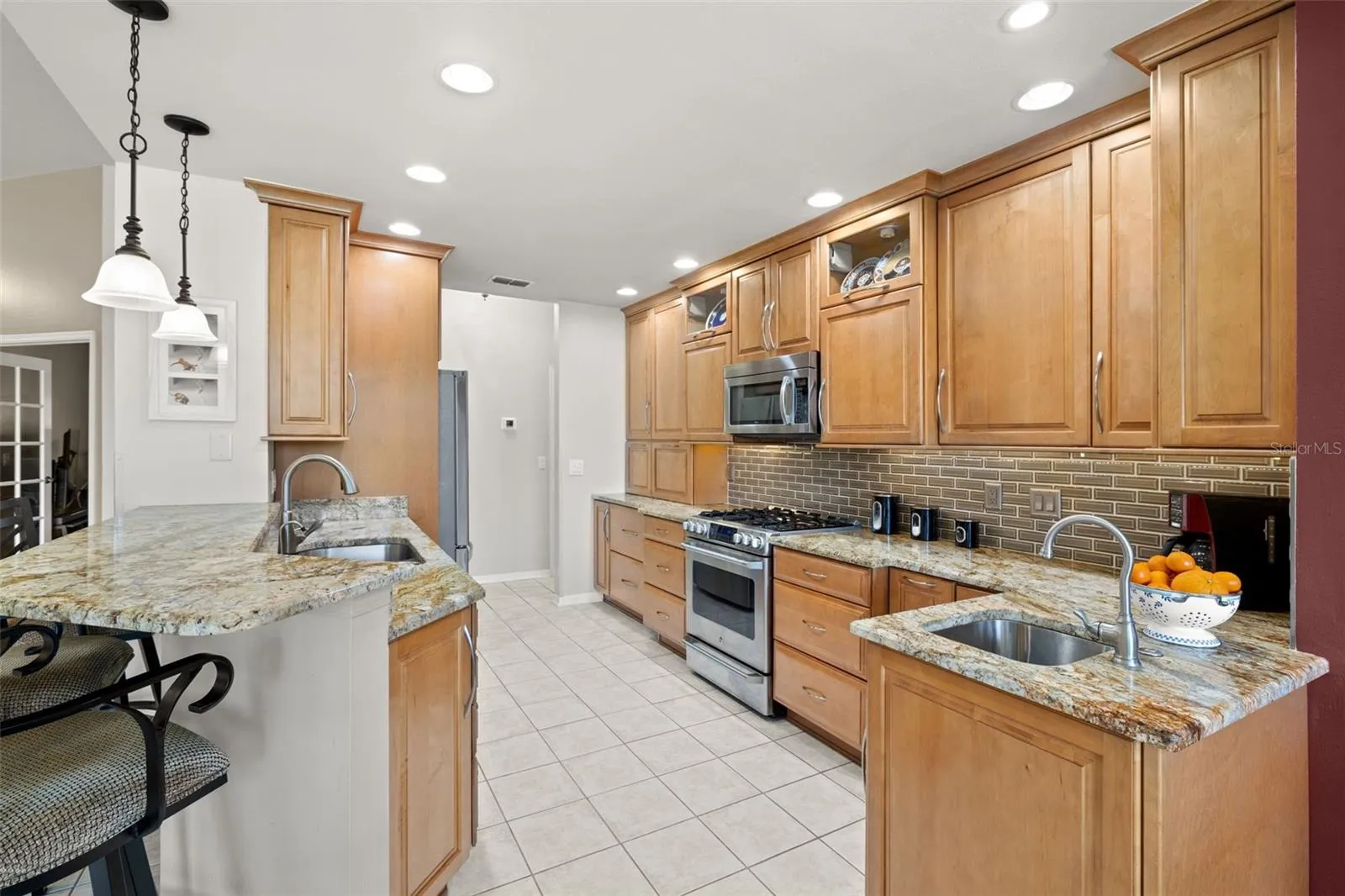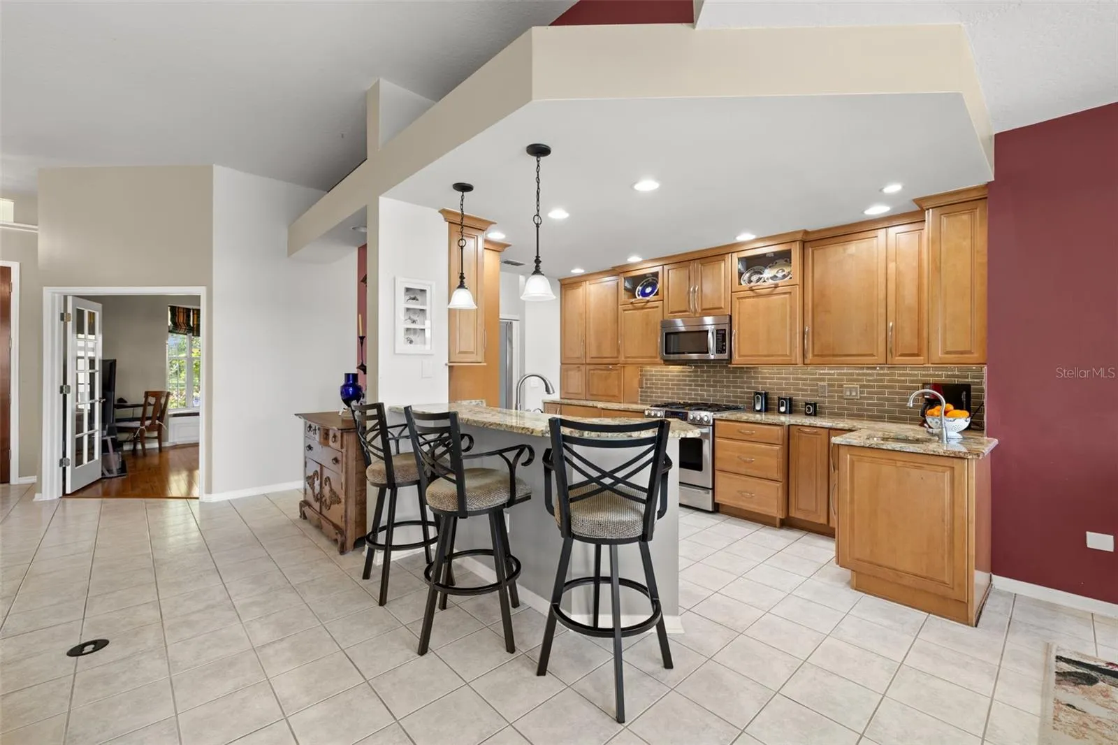 Back up offers requested. This gorgeous pool home in the highly sought-after Woodridge Subdivision features a chef’s dream kitchen with beautiful hardwood cabinetry, stainless appliances, two sinks and granite counters. As you enter through the 8 ft. tall double entry doors, you will find soaring 11 ft. ceilings with a direct view of your sparkling pool with cool travertine decking. The sliding glass doors to the pool and whirlpool spa open up completely and pocket to create an indoor/outdoor living space. The expansive covered lanai will allow for large gatherings of family and friends. The outdoor counter with a sink and electrical can easily be converted to an outdoor kitchen. The original owner has carefully maintained and updated this home. New in 2023: HVAC heat pump system, exterior paint, and garage door. New in 2024: pool pump, and refrigerator condenser. Other important updates include: durable and long lasting metal roof in 2017, oversized primary bedroom shower, circular driveway with extra parking spot, brick paver walkway, water softener purification system with new R/O filters, attic storage, irrigation system, hardwood and tile floors throughout. The front and backyard garden areas are an oasis for butterflies and songbirds with a collection of Native Florida plants. Homes in this neighborhood have large footprints so there is ample spacing between
