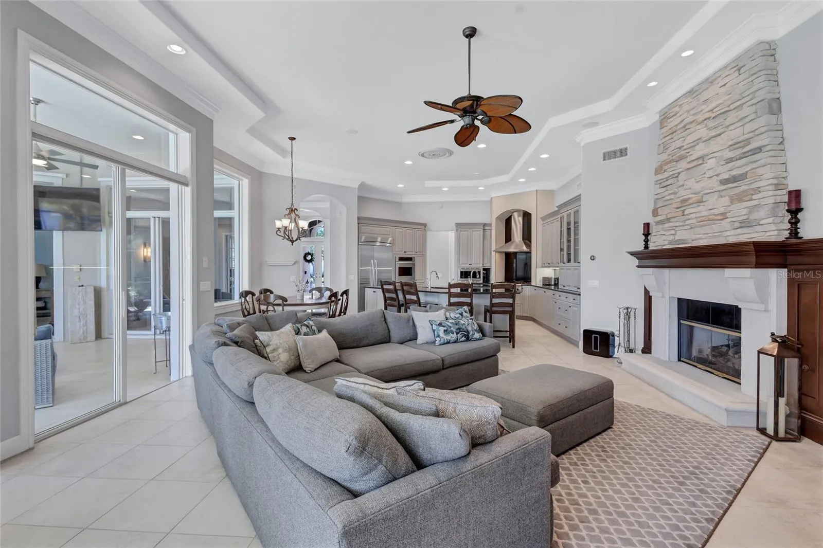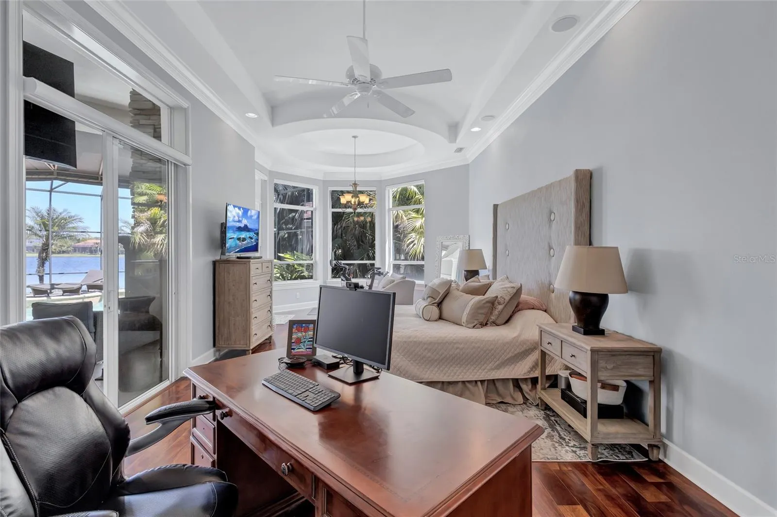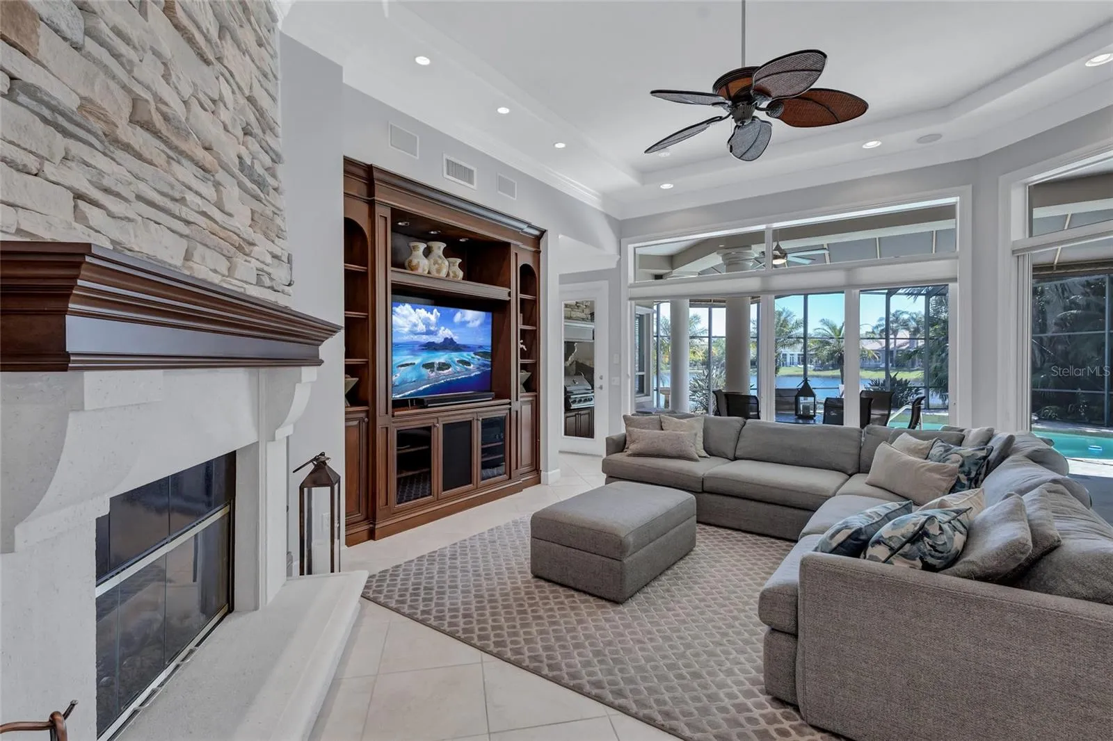 EXCEPTIONAL PROPERTY ON ONE OF THE BEST STREETS IN WATERCHASE. WATER VIEWS and SUPERIOR QUALITY OF MARC RUTENBERG CONSTRUCTION. A+++ COMMUNITY OF WATERCHASE. I call it Waterchase Wonderland – with its full-activities director, movie nights, music festivals, summer camps and so much more!!! This highly desirable ONE-STORY executive home will check ALL your boxes. Stepping through its massive double doors, you find yourself surrounded by THE EXQUISITE architectural & decorative details. LIVING ROOM opens up to the MOST SCENIC & VERY PRIVATE OUTDOORS OASIS – one of the many fantastic features of this home. The floor plan is efficient and well thought-out and offers 4 bedrooms, 3 bathrooms, a spacious EXECUTIVE OFFICE and a BONUS room in the back of the house (versatile and multi-purpose use). The bedrooms are located in 3 separate wings providing PRIVACY for the family residents and its guests. FANTASTIC and OPEN kitchen with extensive cabinet & surface space, a beautiful island & high-end stainless-steel appliances, built-in refrigerator, and gas range – PERFECT for family evenings and holiday gatherings. HUGE primary suite offers a sitting area with beautiful lake views and access to the pool area. Truly no detail was overlooked, and elegance and quality are evident in every detail. GORGEOUS 12-FEET CEILINGS, elegant FIREPLACE, CROWN MOLDINGS, and PLANTATION SHUTTERS. One can enjoy the shimmering lake views from most of the rooms and the home’s very own OUTDOORS OASIS. The pool area is private and serene and offers LOTS of covered and open areas. ANOTHER FIREPLACE outside area and outdoor kitchen. Truly, Florida living at its best!!!