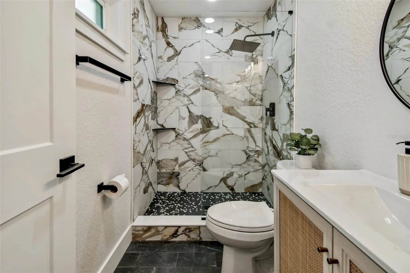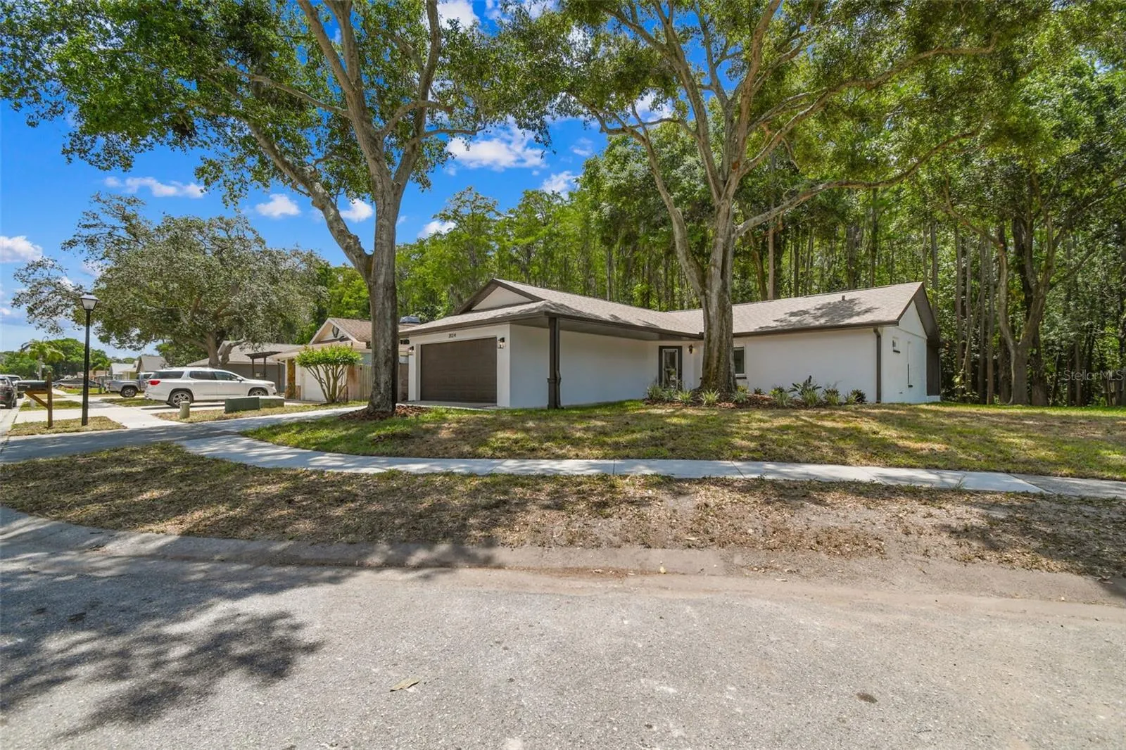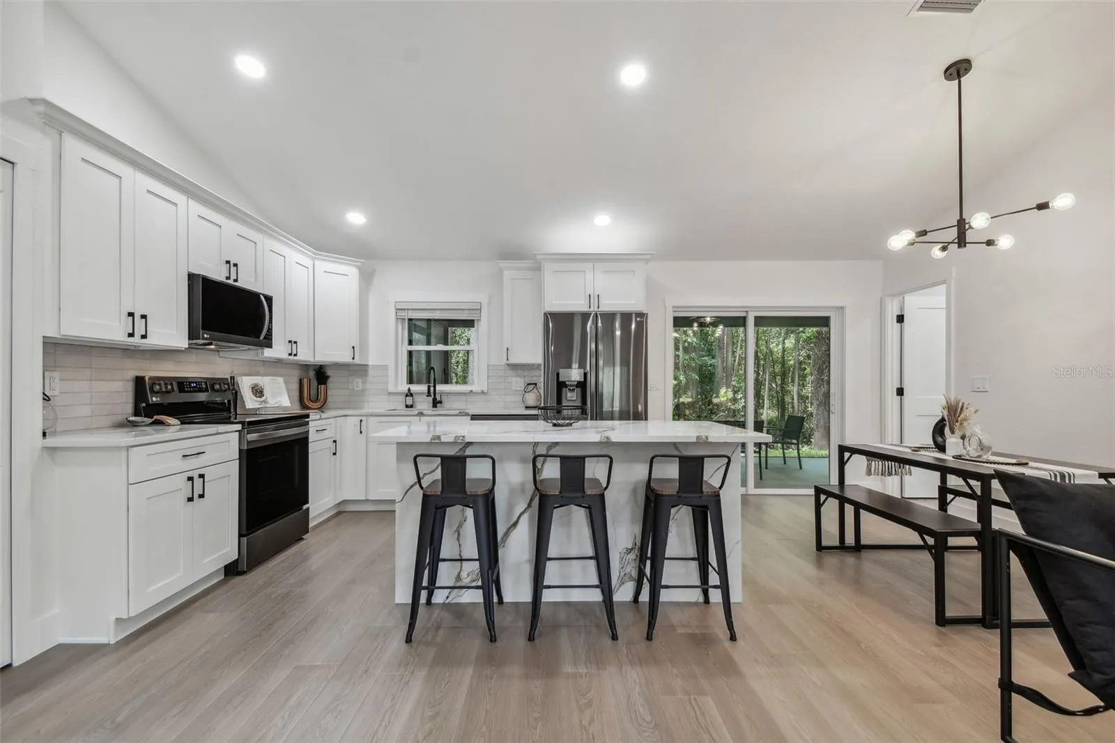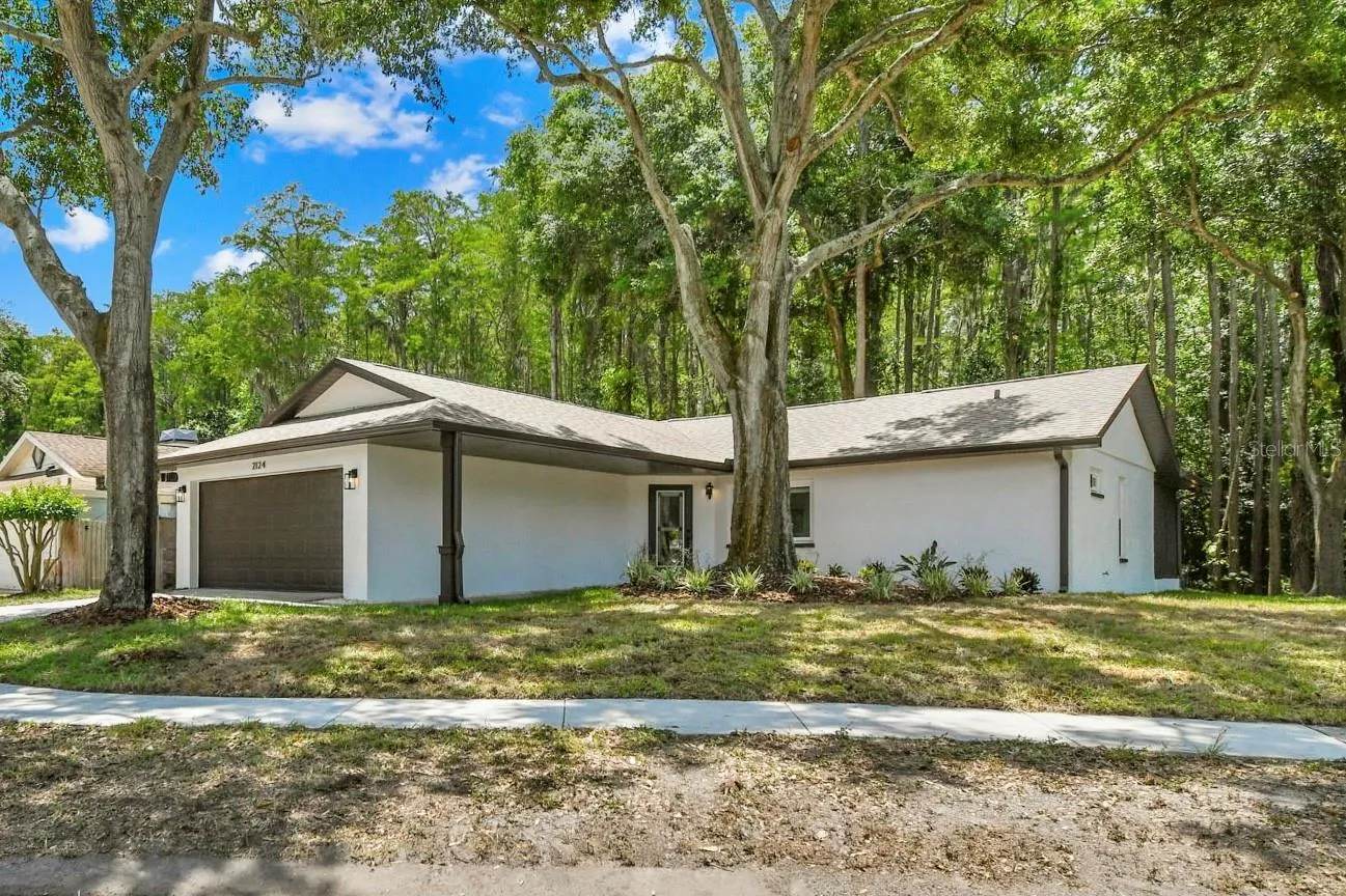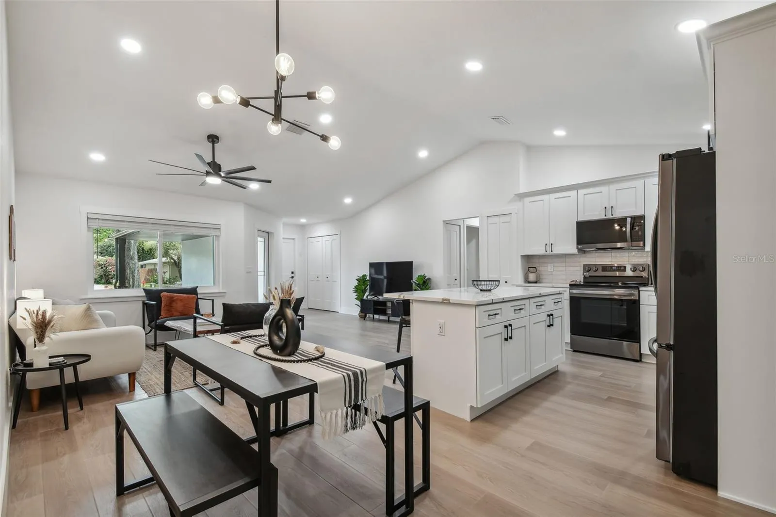 Welcome to your dream home nestled in the serene community of Dove Hollow in Palm Harbor, Florida. This meticulously remodeled single-family residence embodies modern luxury and cozy comfort, offering 3 bedrooms, 2 bathrooms, and a 2-car garage. Renovated from top to bottom, this home ensures a move-in-ready experience for its new owners. The list of upgraded features is impressive: a NEW air conditioning system, NEW water heater, NEW hurricane-impact windows and doors, NEW impact-rated garage door, fresh stucco and NEW exterior paint, NEW interior texture and paint, updated trim, flooring, tile and more. Every detail has been considered to create a home that’s not only beautiful but built to last! As you step through the front door, you are welcomed into a bright and airy open-concept living space with vaulted ceilings and abundant natural light. The gourmet kitchen is a standout, featuring Calcatta gold quartz countertops, solid-wood Forevermark cabinets, and a full suite of NEW stainless steel LG appliances. The refrigerator boasts a dual ice/craft ice feature, the range has a built-in air fryer, and the dishwasher and microwave are sleek and efficient. The 6-foot island is perfect for entertaining and offer as additional cabinet/drawer storage, with striking quartz detailing along its front face.