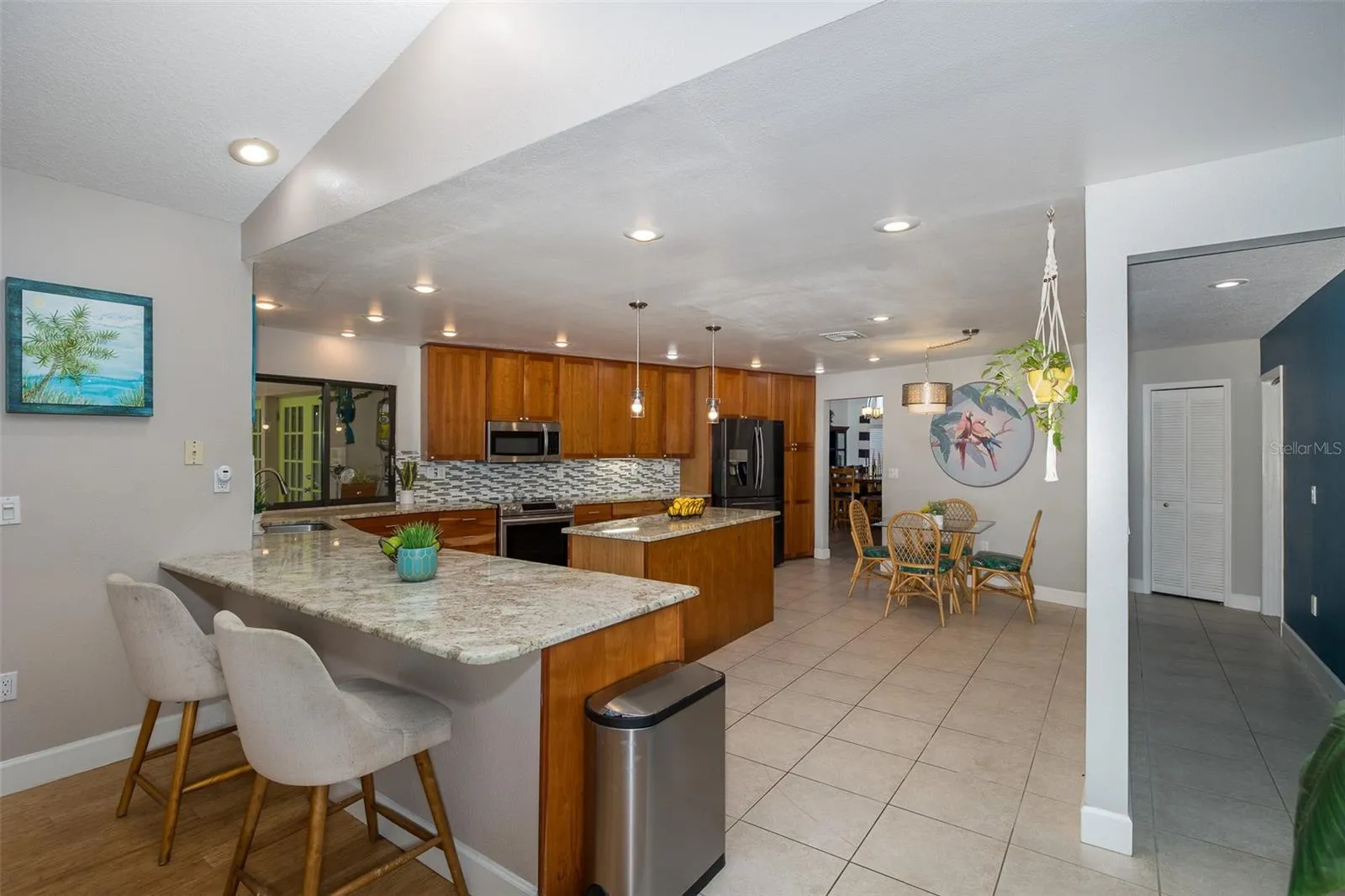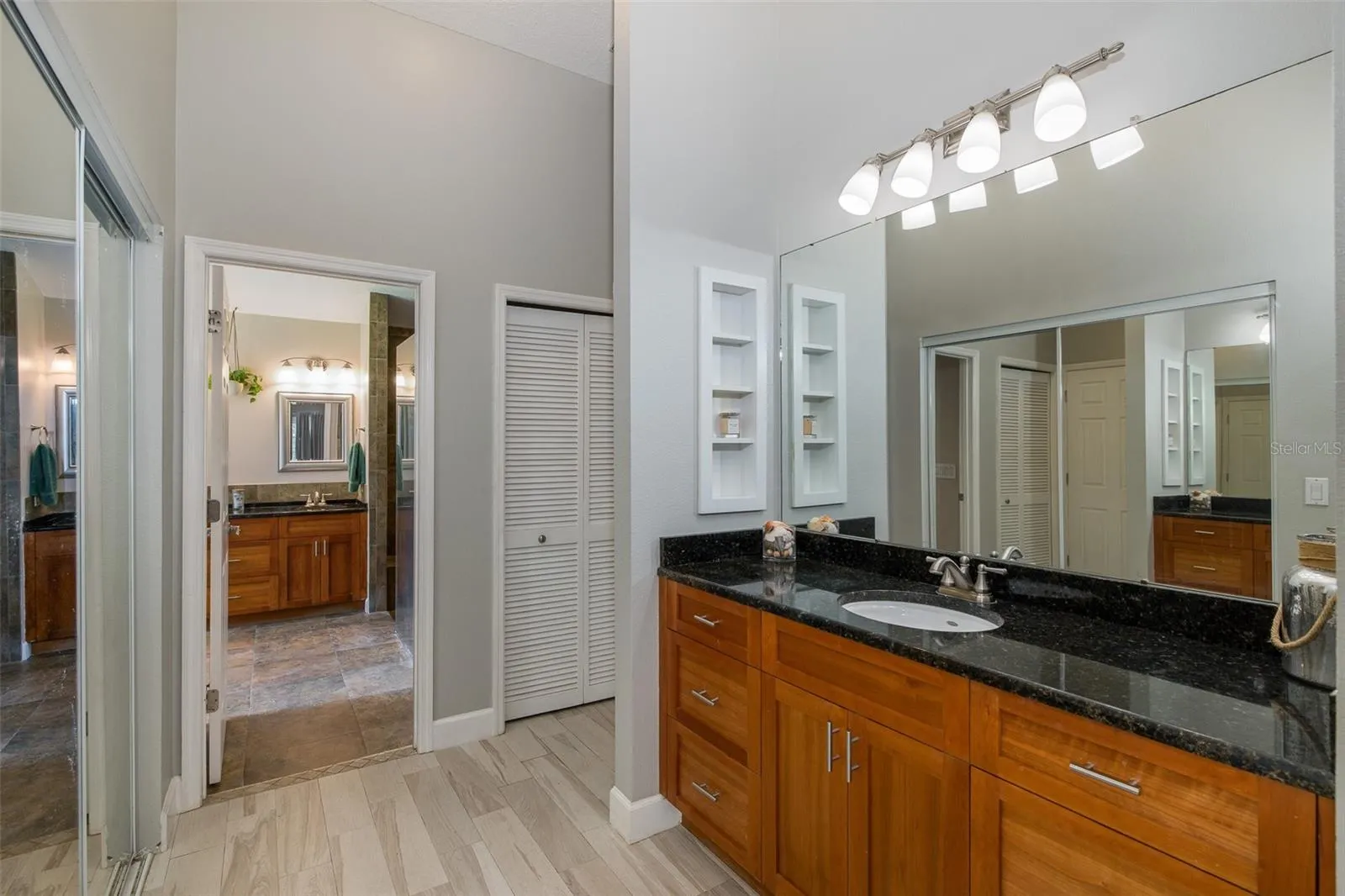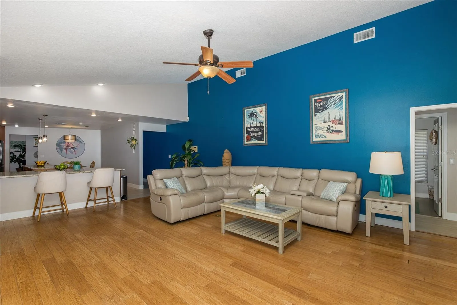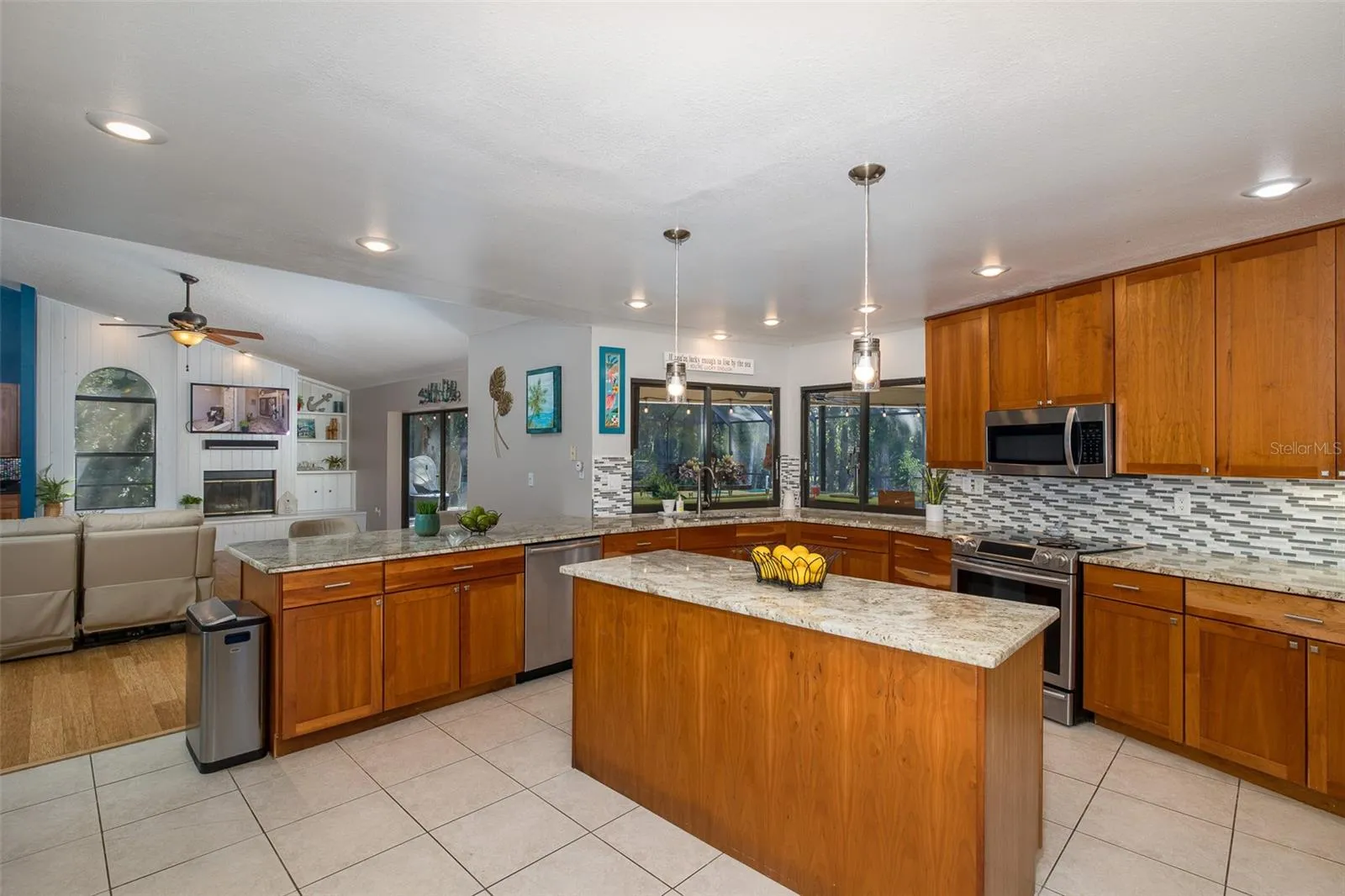 - Ceiling Fans(s), Open Floorplan, Thermostat, Walk-In Closet(s), Living Room/Dining Room Combo, Kitchen/Family Room Combo, Primary Bedroom Main Floor, Split Bedroom, Stone Counters, Solid Wood Cabinets, Wet Bar, Built-in Features