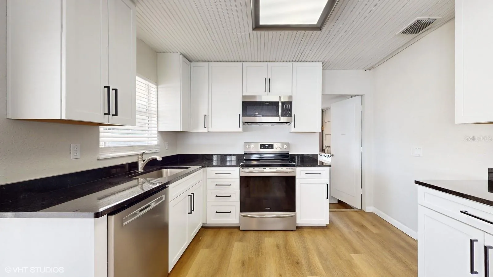 Step into the splendid kitchen adorned with all-new Frigidaire Gallery Series stainless-steel appliances, pristine white linen shaker cabinetry, and expansive granite countertops bathed in glorious natural light. Vaulted ceilings enhance the spacious living area, seamlessly integrating with large hurricane-rated windows that invite the outdoors in.