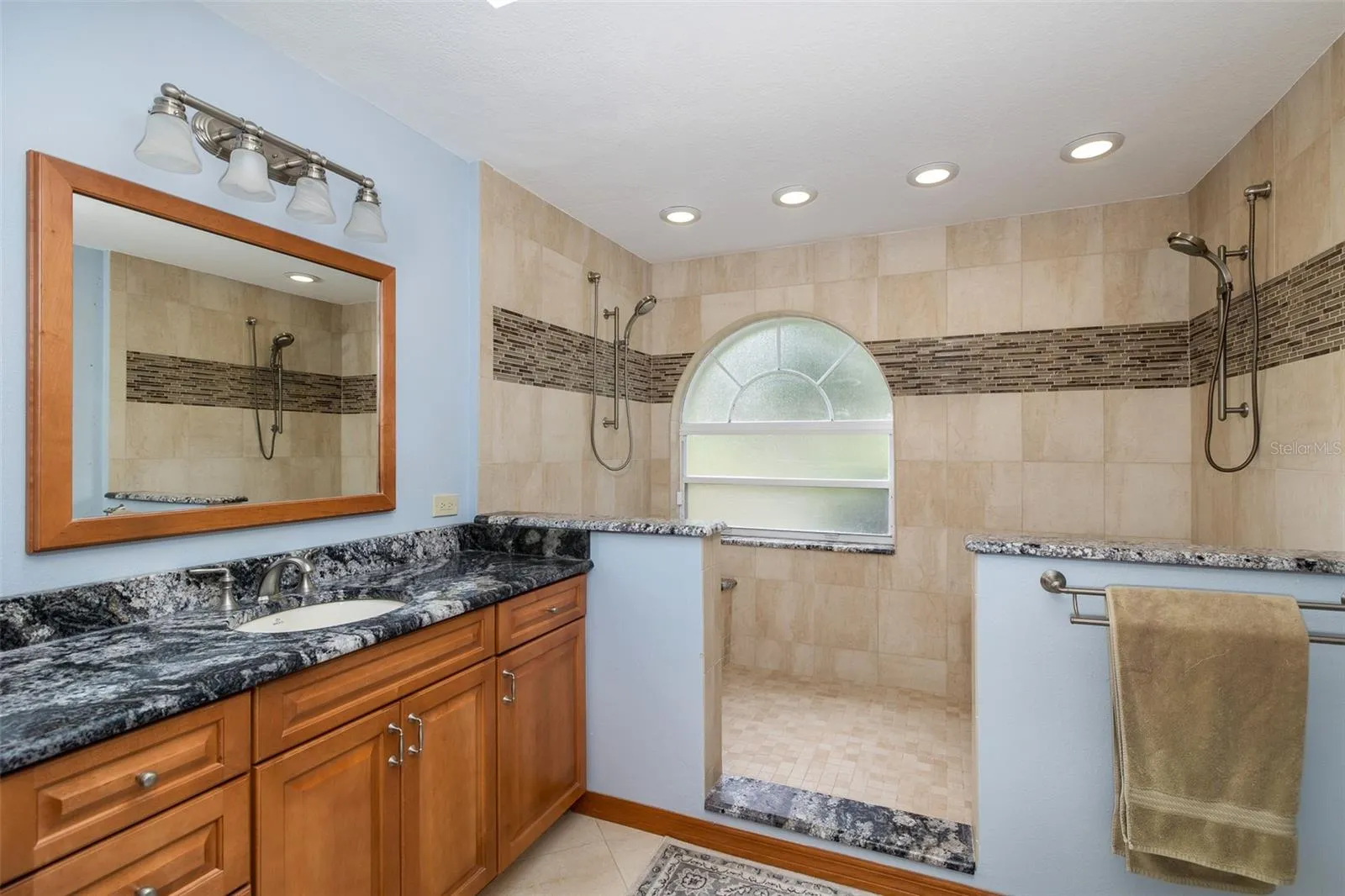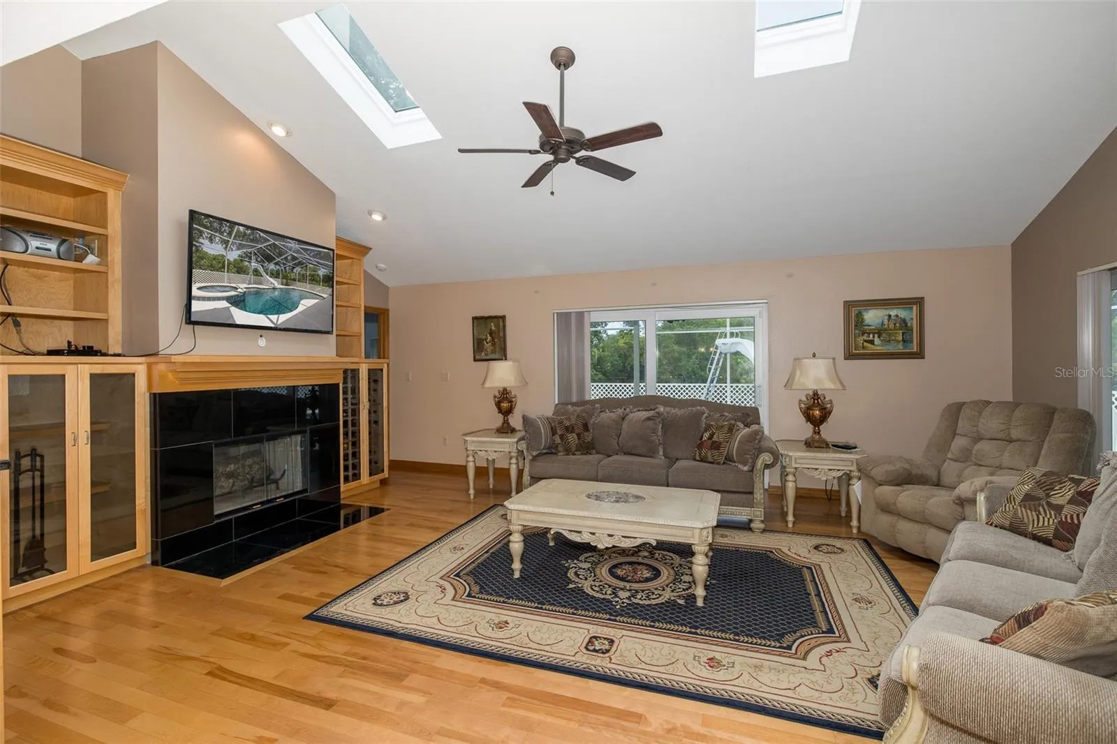 - Ceiling Fans(s), Walk-In Closet(s), Living Room/Dining Room Combo, Eat-in Kitchen, Kitchen/Family Room Combo, Primary Bedroom Main Floor, Split Bedroom, Window Treatments, High Ceilings, Stone Counters, Solid Wood Cabinets, Cathedral Ceiling(s), Wet Bar, Built-in Features, Skylight(s), Pest Guard System