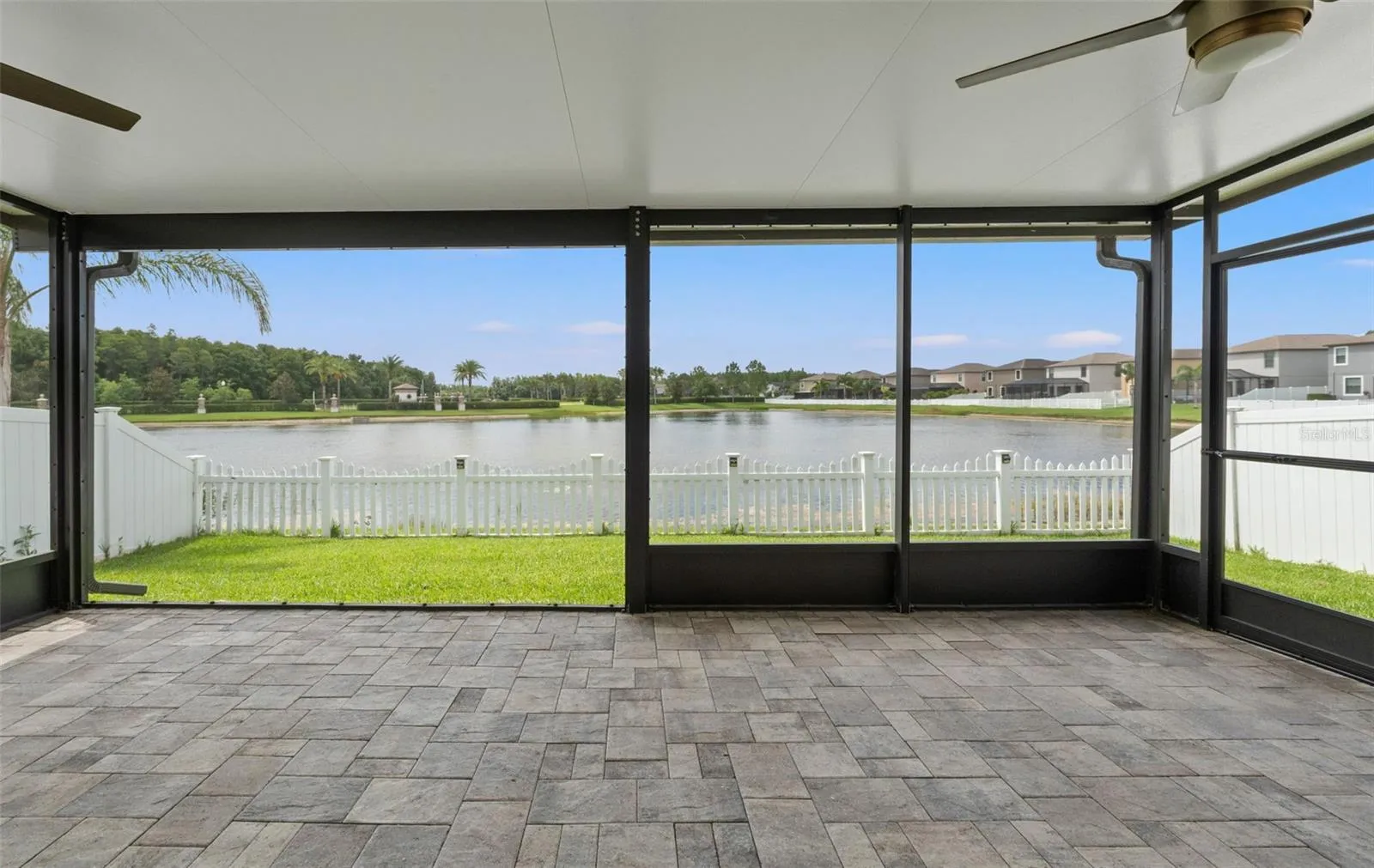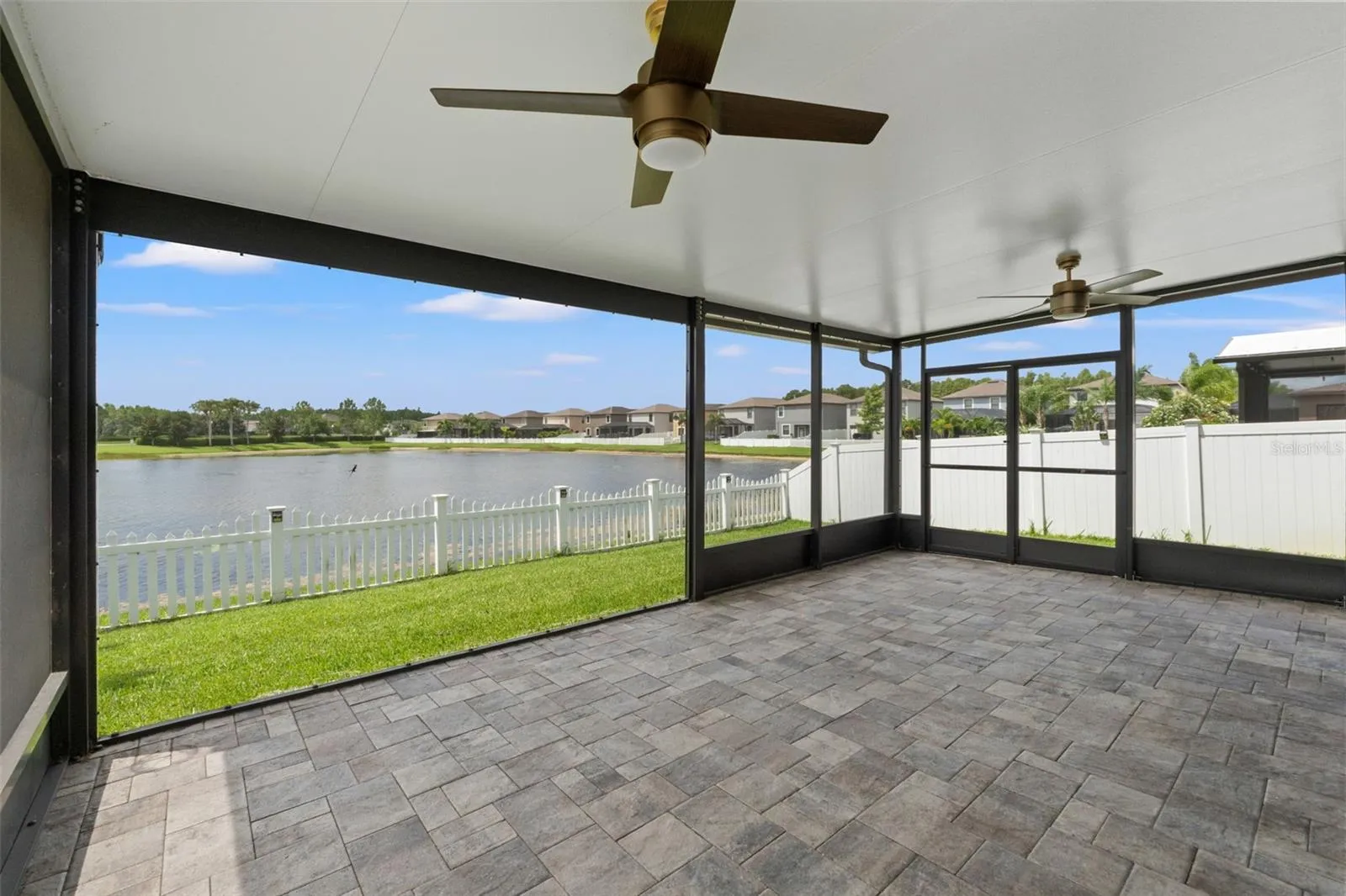 – Gorgeous Outdoor Living: Revel in the serene beauty of a spacious 420 sq. ft. screened-in lanai, complete with pavers and captivating pond views. This outdoor oasis is perfect for relaxing or entertaining, featuring two remote-controlled ceiling fans to keep you cool on warm days. Electrical outlets are in place for watching your favorite games or movie nights.