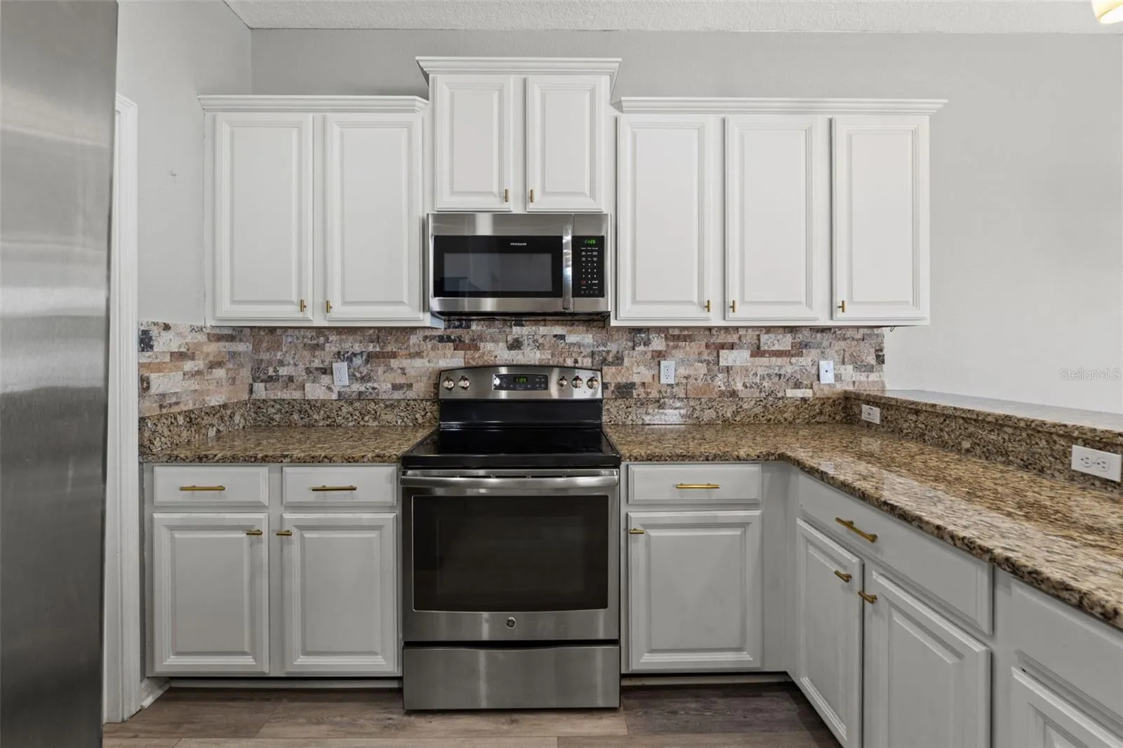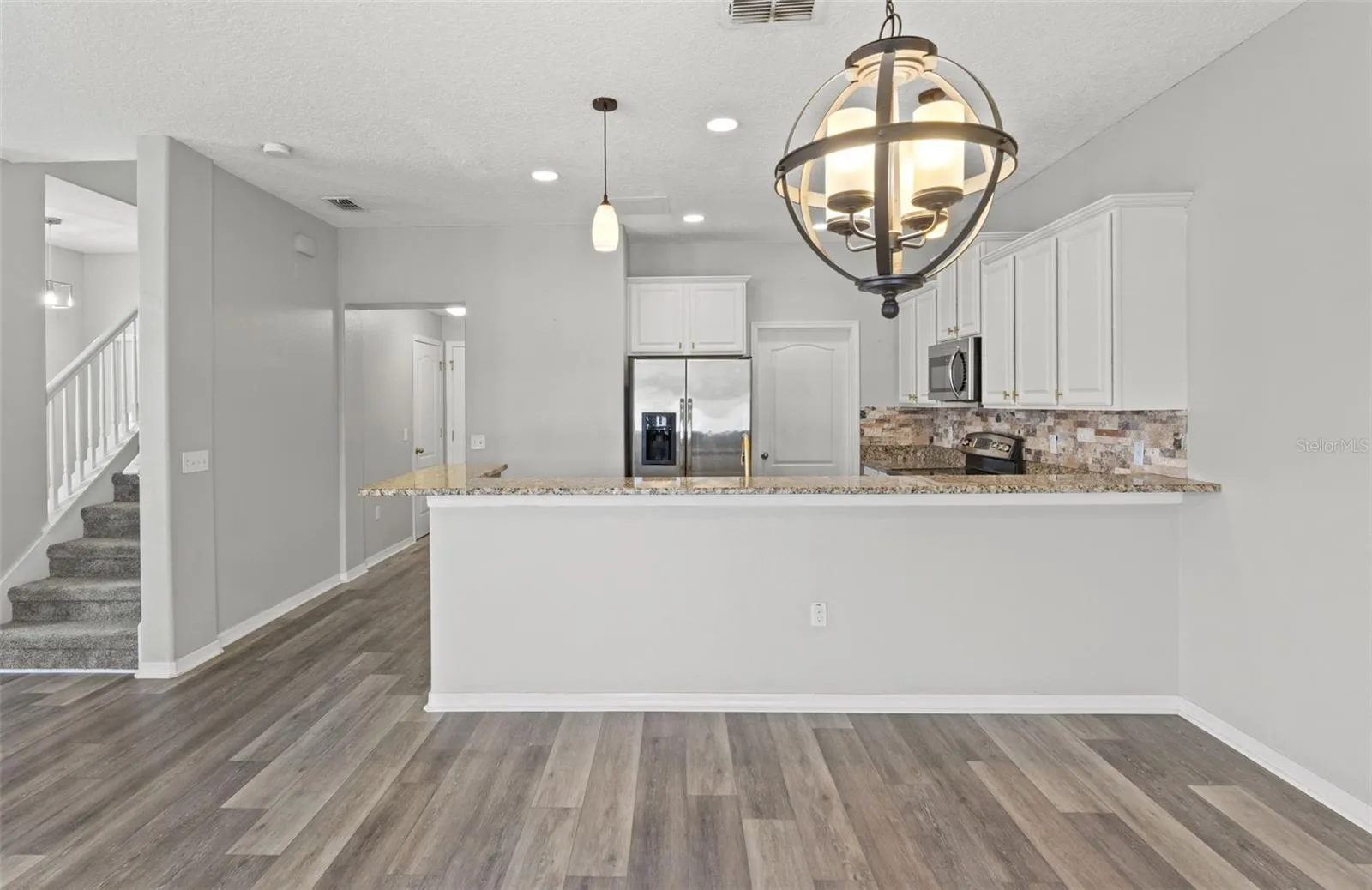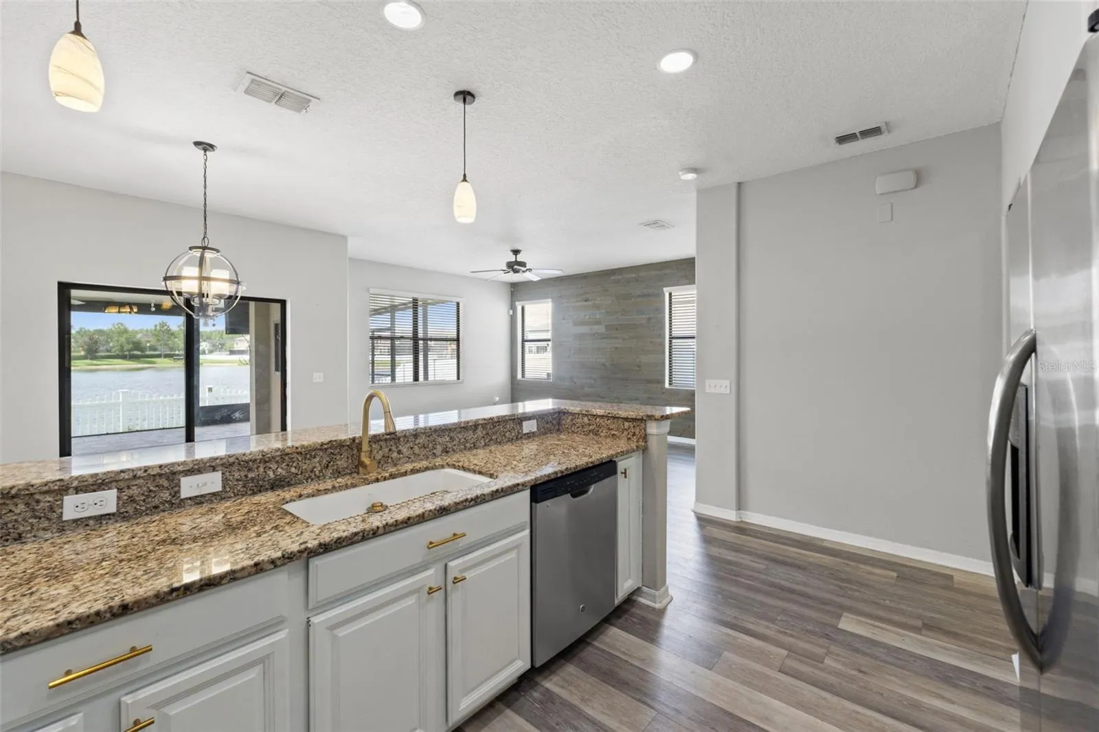 – Inviting Interior: Step inside to find an open living space adorned with a custom wood plank accent wall and seamless luxury vinyl plank flooring. The kitchen and dining area have been exquisitely updated with granite countertops, stainless steel appliances, a deep single bowl undermount sink, and newly refaced cabinets. The natural stacked stone backsplash and brass hardware add a touch of elegance.