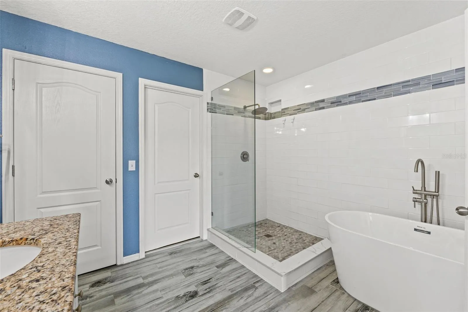 – Luxurious Primary Suite: Located on the second floor, this private retreat boasts a remodeled ensuite bathroom featuring a freestanding soaking tub, a separate stand-up shower with a luxurious rainfall showerhead, a private water closet, a large vanity with dual sinks, and granite countertops. The expansive walk-in closet and an adjacent space perfect for a home office or reading nook complete this serene sanctuary.