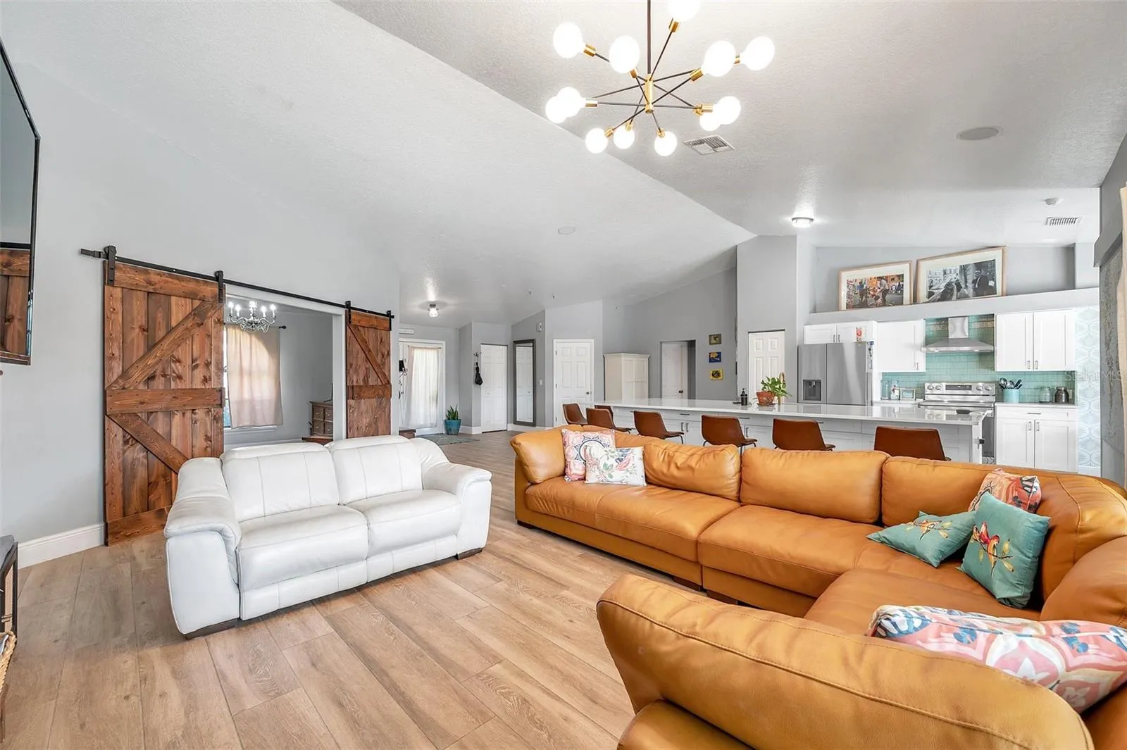 Modern Updates: Impeccably updated with a focus on choosing materials that are eco friendly and non-toxic, featuring newer porcelain plank tile throughout and high ceilings that enhance the sense of space. The kitchen showcases a grand island perfect for dining that seats 12 with added storage.