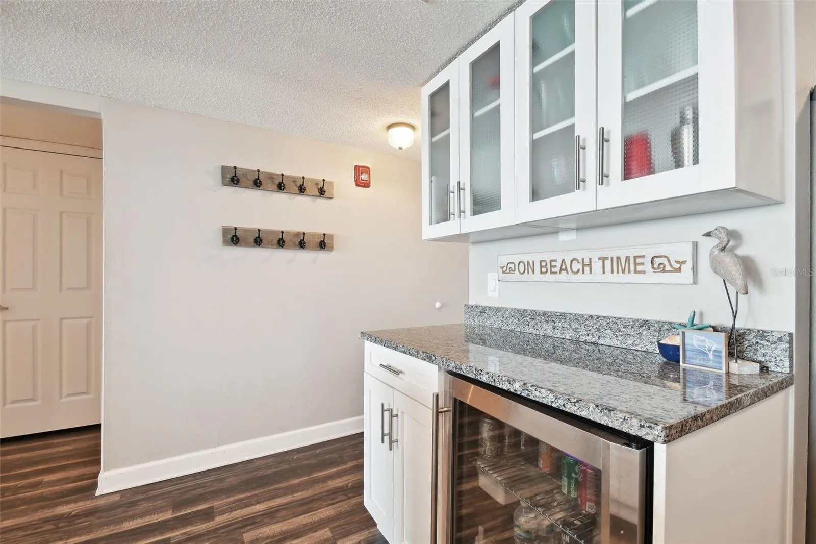 white cabinetry, newer stainless steel refirgerator, wine refrigerator and granite countertops with a HUGE