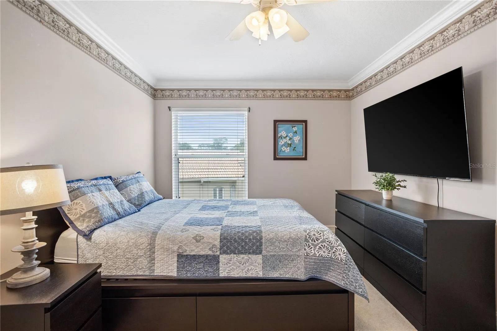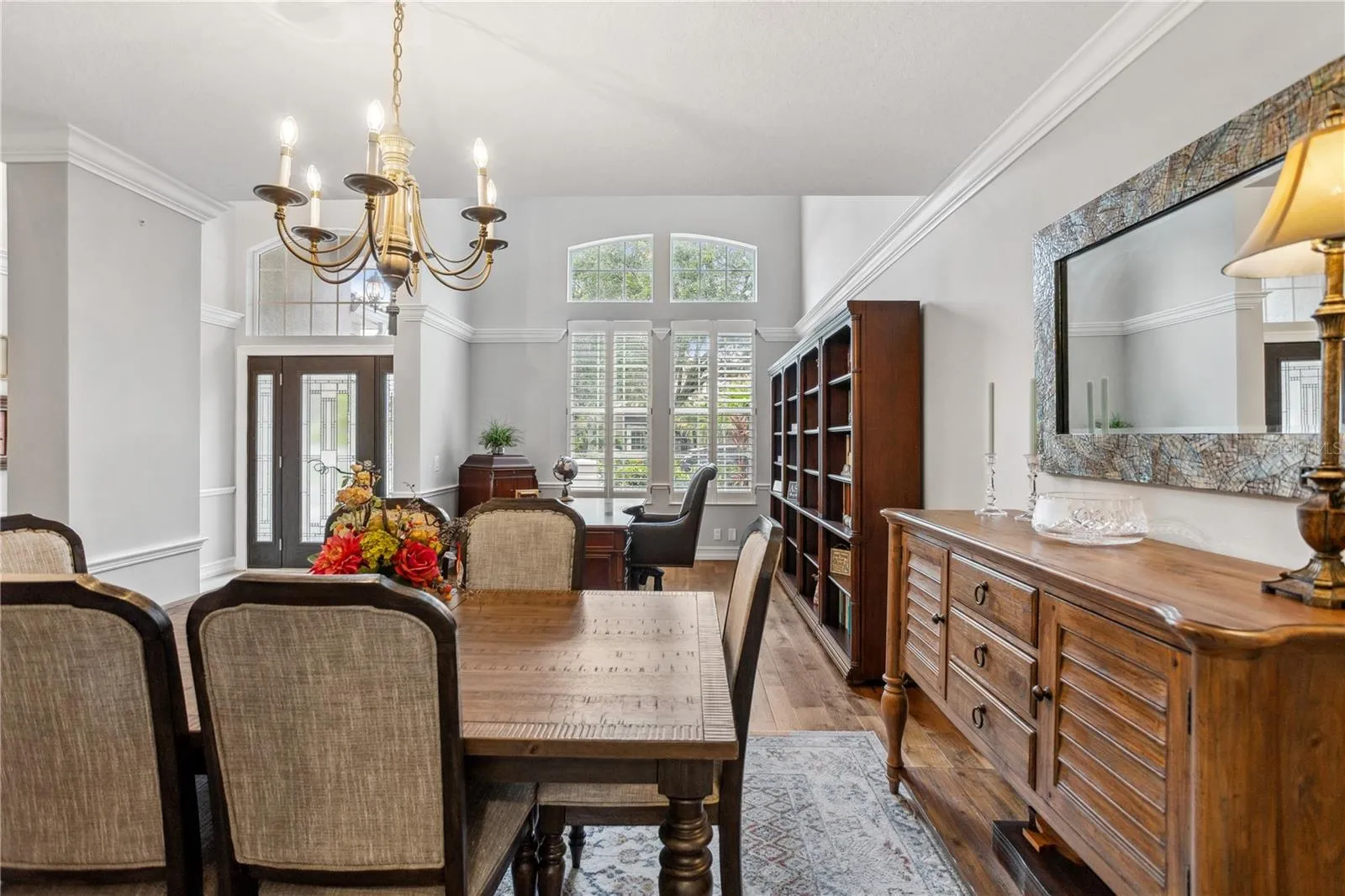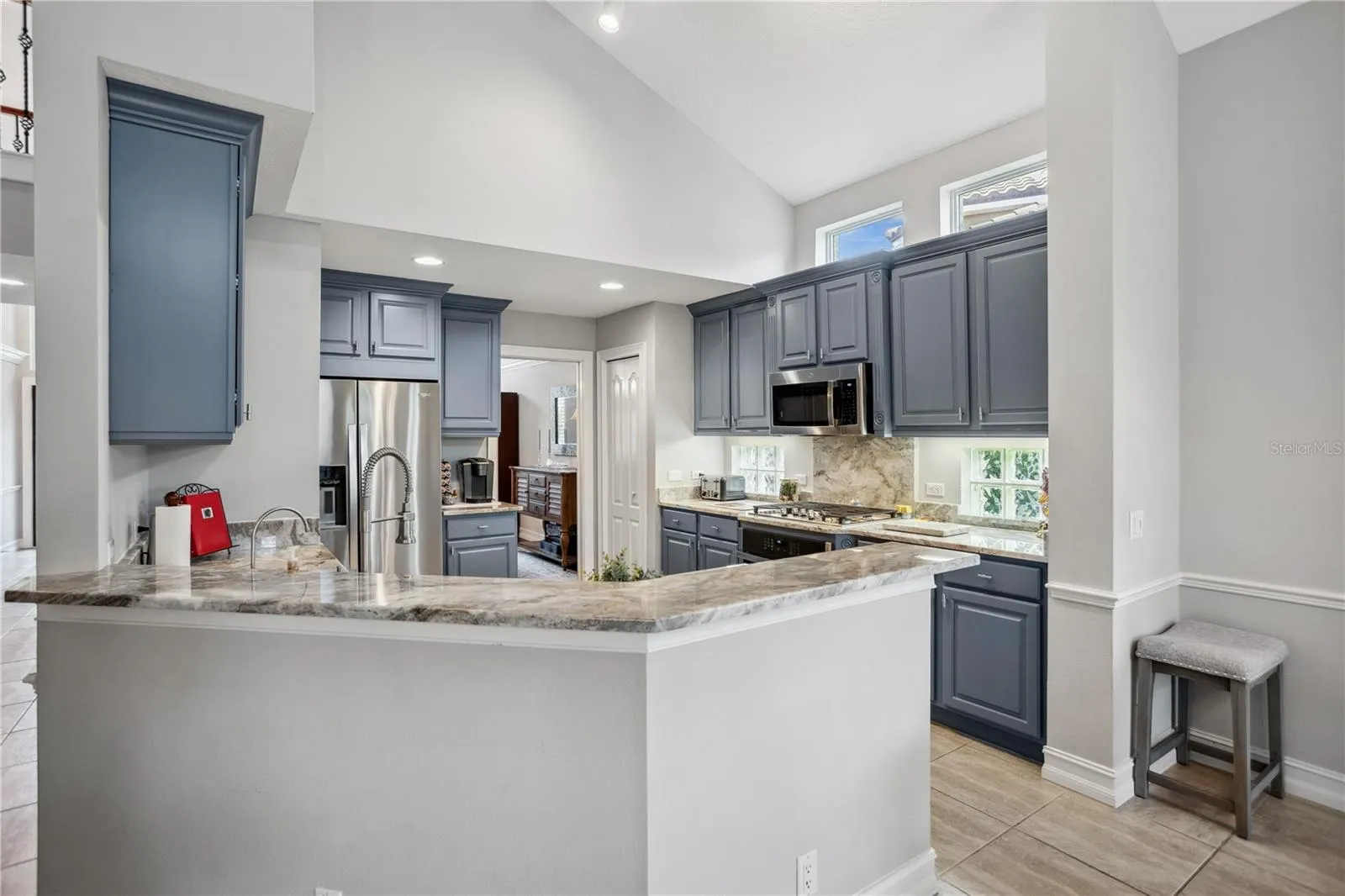 - Ceiling Fans(s), Crown Molding, Open Floorplan, Thermostat, Walk-In Closet(s), Living Room/Dining Room Combo, Eat-in Kitchen, Primary Bedroom Main Floor, Window Treatments, High Ceilings, Vaulted Ceiling(s), Stone Counters, Solid Wood Cabinets, Cathedral Ceiling(s), In Wall Pest System