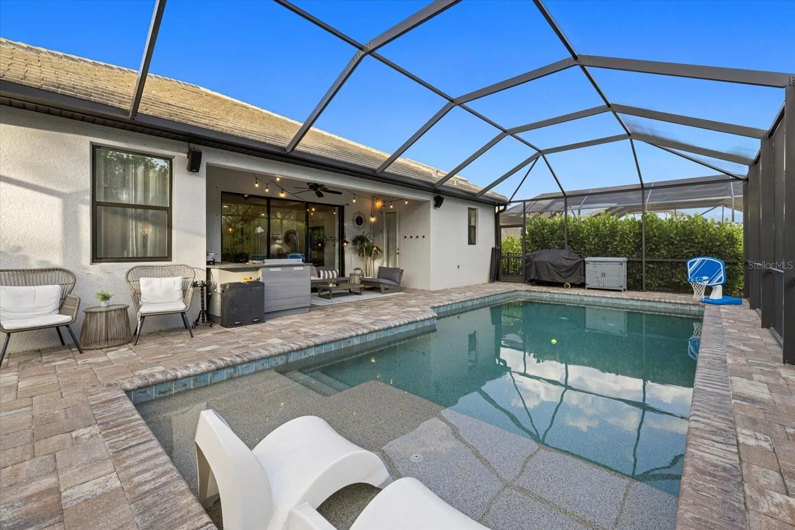 Step outside into your own private paradise, where you’ll find a heated saltwater pool surrounded by lush landscaping, perfect for cooling off on those warm summer days or unwinding after a long day at work. With Bose blue tooth pool speakers installed, you can set the mood with your favorite music while you relax poolside.