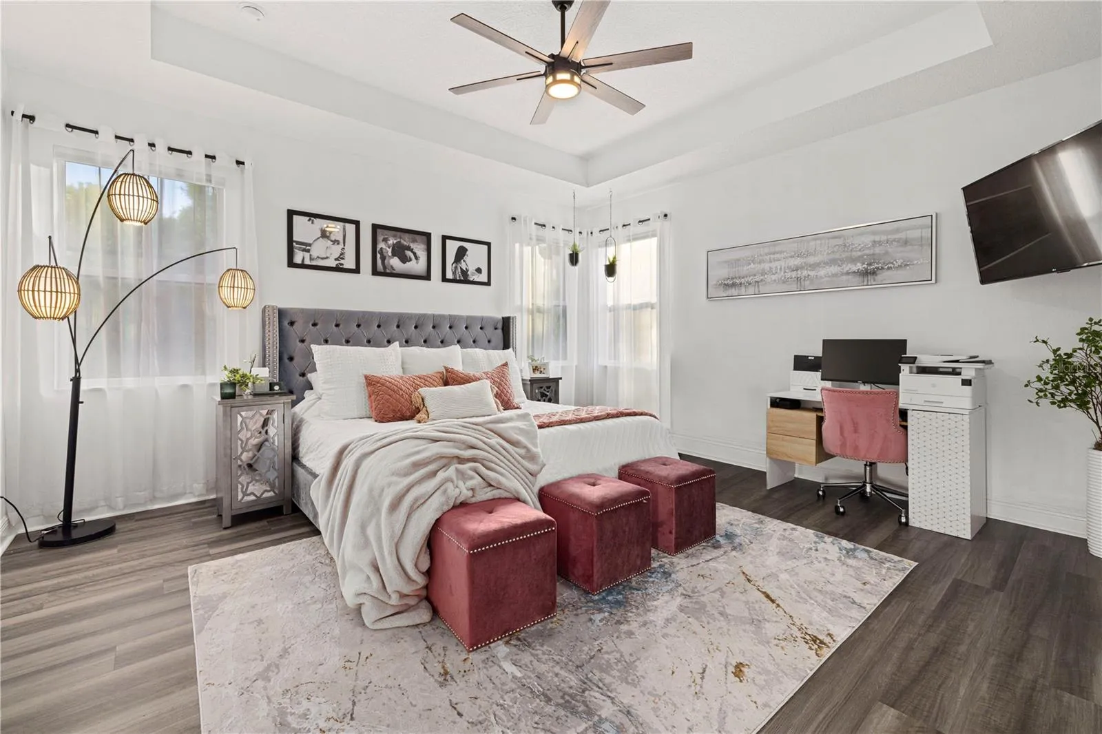 The master suite is a true private wing sanctuary, featuring automatic shades for convenience, a spa-like ensuite bathroom complete with dual vanities, and a walk-in closet with ample storage space.