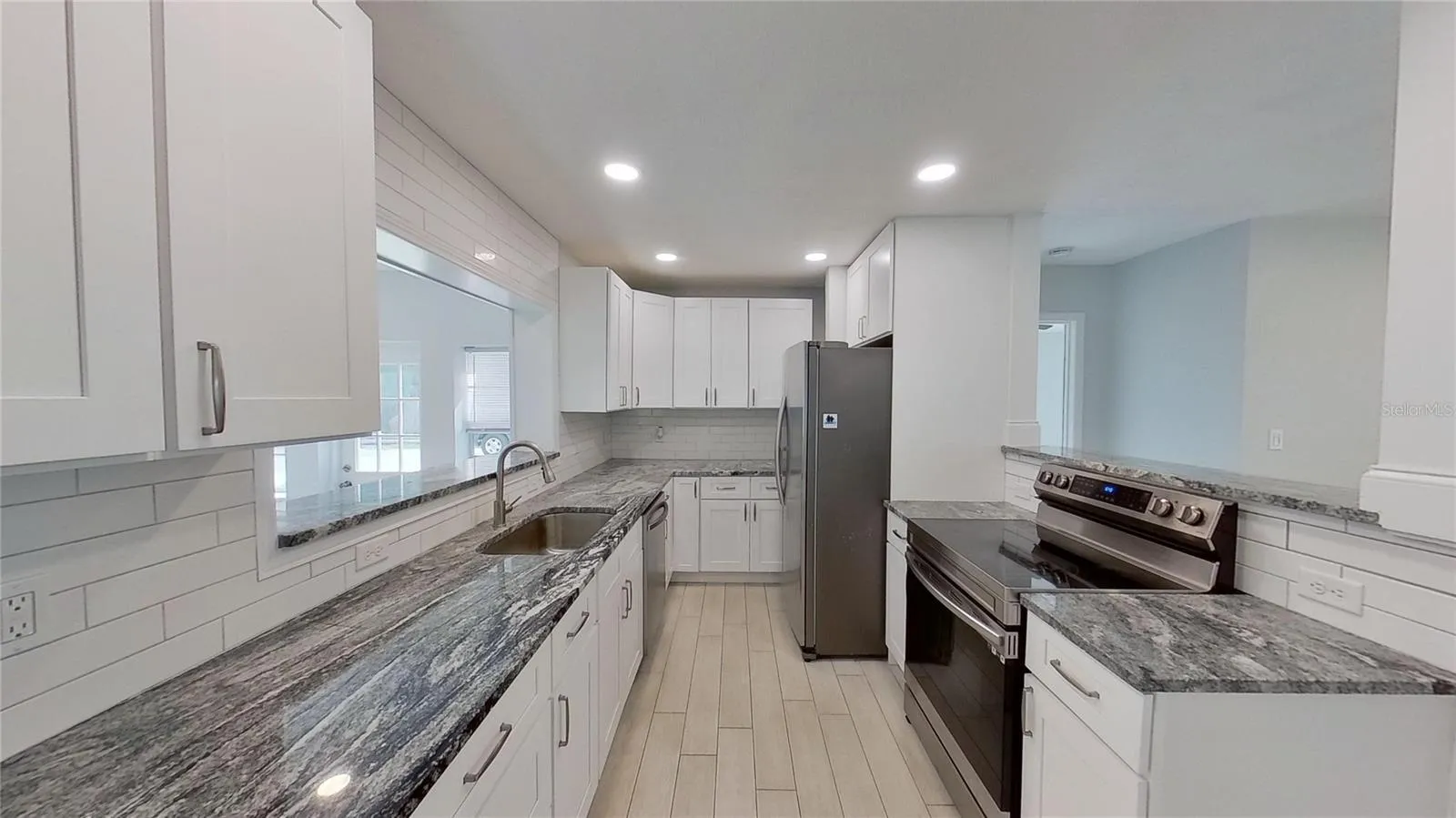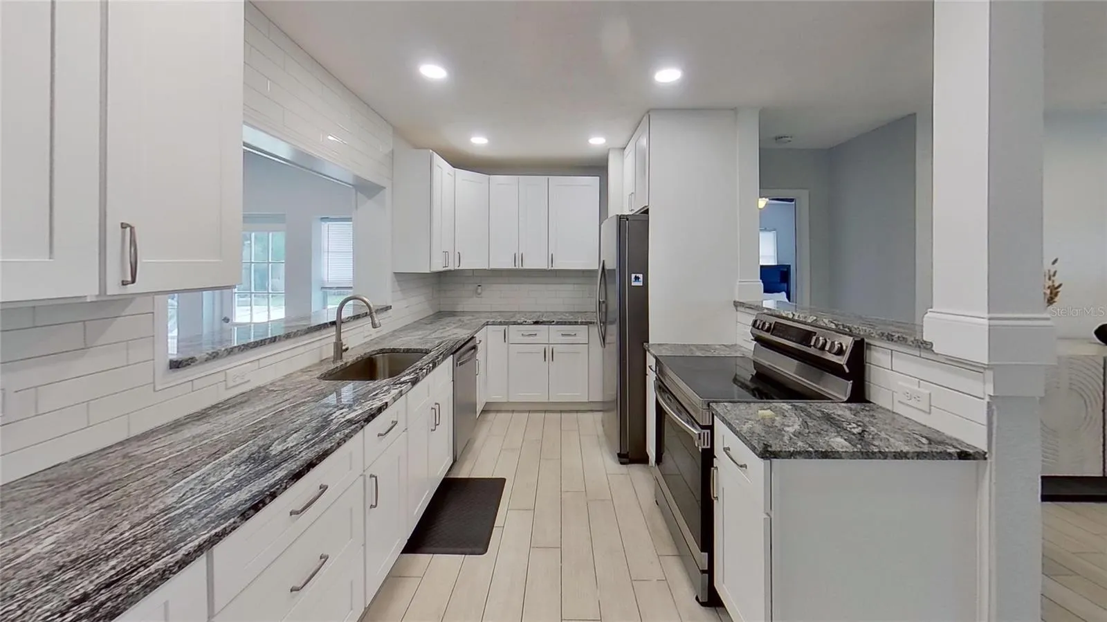 One or more photo(s) has been virtually staged. Stunning (3) bedroom (3) bathroom home with an oversized 2-car garage, situated on a spacious lot in unincorporated Seminole. This immaculate property features a generously sized newly sodded backyard, ideal for outdoor activities and relaxation. Step inside to discover wood-look tile flooring throughout, enhancing the home’s modern appeal. Both the bathroom and kitchen have been tastefully remodeled to meet contemporary standards. The expansive kitchen showcases all-wood cabinets with soft-close drawers, stainless steel appliances, and sleek granite countertops. The master bathroom boasts a beautifully tiled shower with a bench, rainfall shower head, and glass enclosure, while the hall bathroom features an equally stylish tub with tiled surround. An additional bathroom is conveniently located in the garage/workshop area, ensuring convenience for residents and guests alike. Enjoy the convenience of an extra-long driveway perfect for parking an RV or boat. The fenced backyard extends seamlessly into the front yard where a charming built-in porch swing invites you to relax and unwind. Don’t miss the chance to view this exceptional home today! A 3D tour is available online for your convenience. Roof, appliances, bathrooms, kitchen, and floors are only 2 years old, ensuring modern comfort and peace of mind.