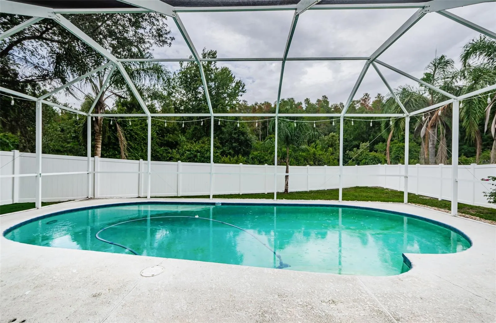 JOB TRANSFER – VERY MOTIVATED SELLER!!! 4 Bedroom House with a POOL Under $450,000! Beautifully REMODELED with split floor plan on a PRIVATE LOT backing to conservation woods. UPGRADES abound starting with a NEW ROOF (2023). The INTERIOR was COMPLETELY REPAINTED (2023) and a new HOT WATER HEATER installed (2023). The wonderful chef’s kitchen has all new MATCHING APPLIANCES (2023) as well as a new cast iron double sink and matching hardware on the cabinets and door handles (2023). The home chef will love cooking with natural gas! There are new (2023) matching ceiling fans both inside and out as well as all new (2023) light fixtures. The open floor plan with the kitchen and family room leading to the screened lanai has plenty of room for family and friends to gather and the pool has a new variable speed pump (2023). The master bedroom features a spa like ensuite bathroom with new toilet, soaker tub, step in shower with a new showerhead, double vanities with new faucets and walk-in closet. The second bath also has a new toilet, new faucets and showerhead. Storage is ample with custom shelving in the garage and a new shed (2024) in the back anchored to a concrete slab. New turf (2024), new PVC fencing (2024), and a drain was installed on the side yard. The TRAVERTINE FLOORING throughout has been professionally steamed cleaned. Located in the desirable New Tampa Community, you’ll be close to schools, shopping, restaurants, public library, Wiregrass Mall and Busch Gardens and all the Tampa Bay area has to offer. Don’t miss this one!!