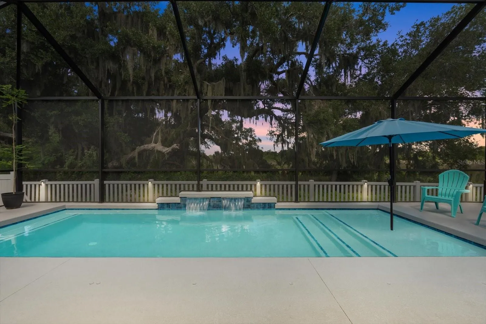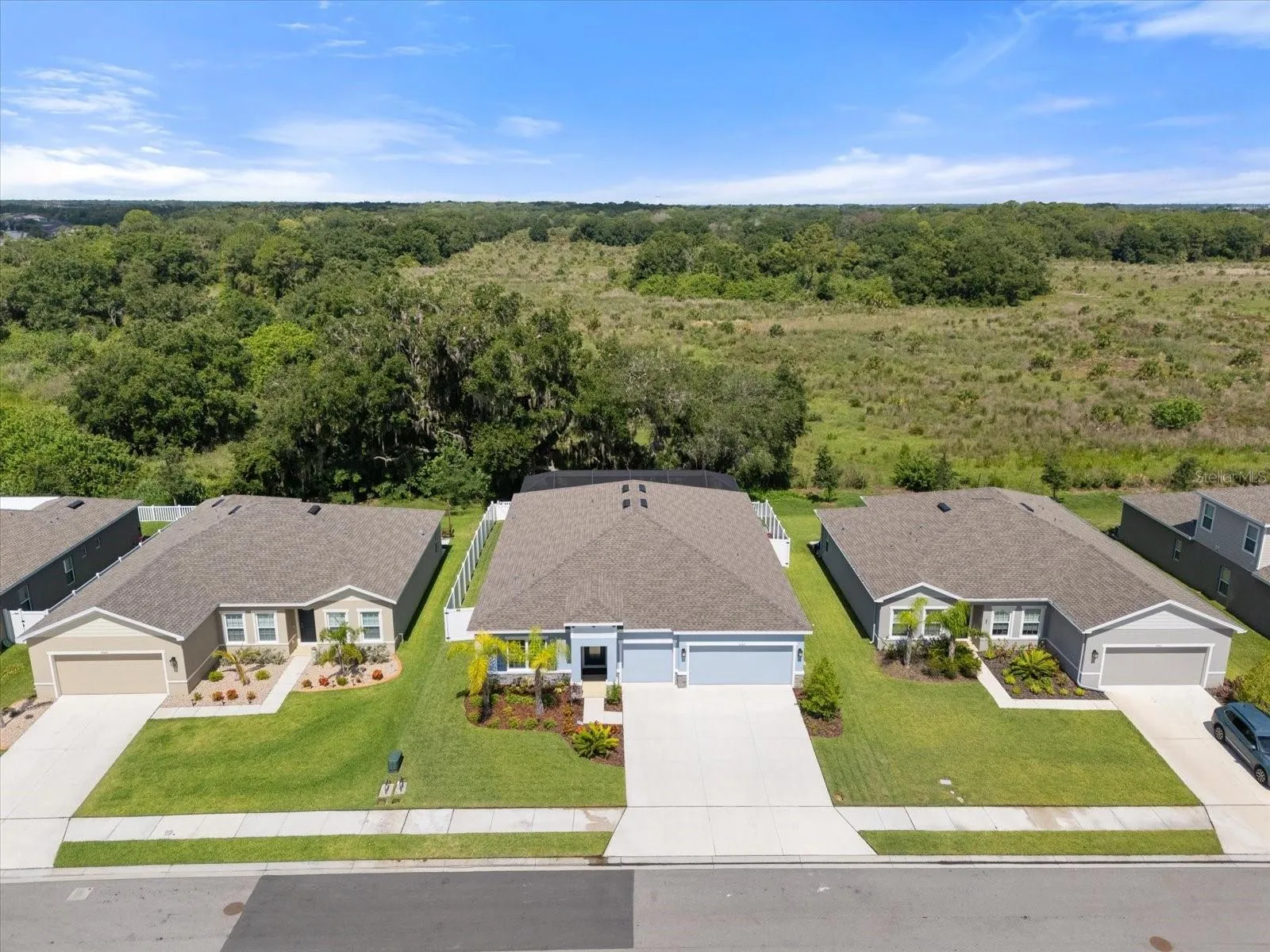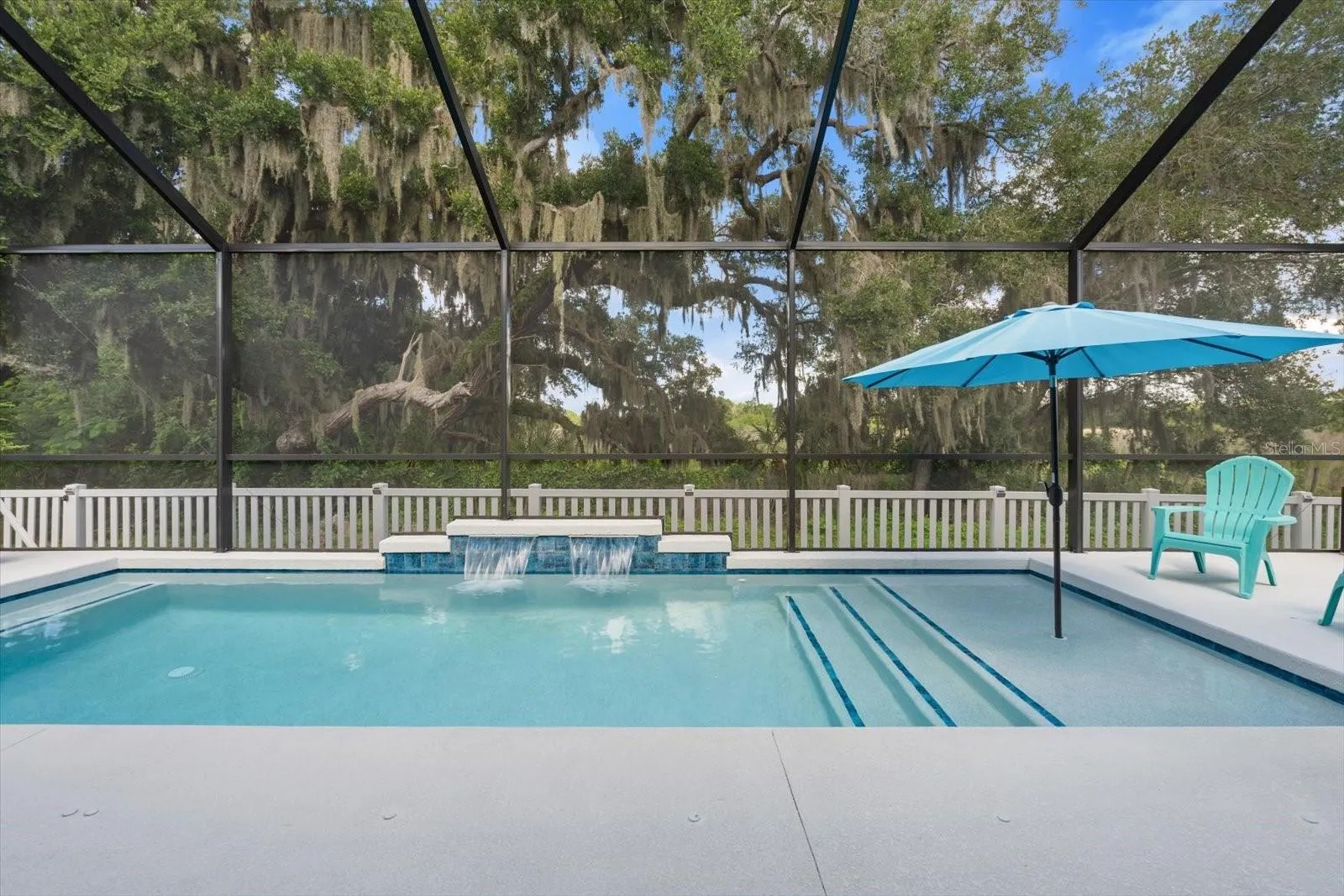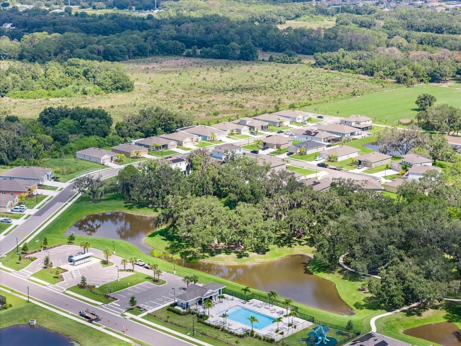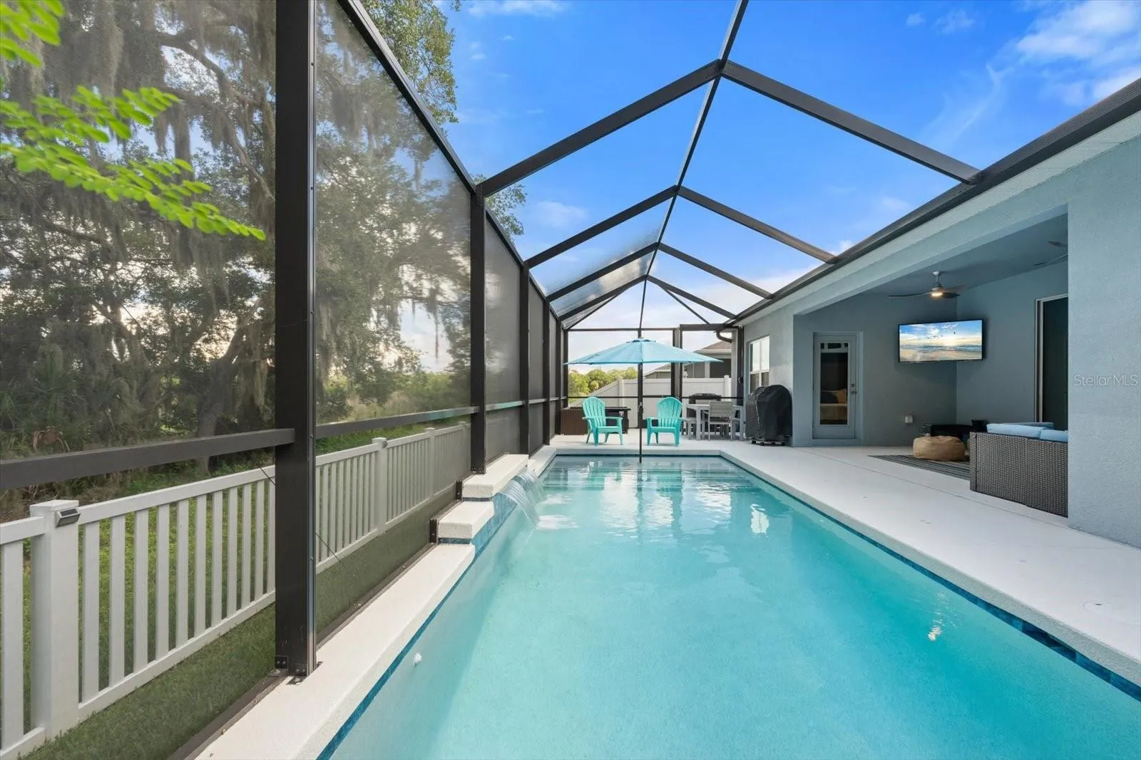 Welcome to this exquisitely upgraded home, designed to impress from the moment you enter! Boasting over $150k in upgrades, the expansive open floor plan features elegant, upgraded Pergo Outlast+ flooring throughout, offering a beautiful wood-look. To the left of the foyer, two spacious bedrooms feature ample closet space and share a luxurious hallway bathroom with a double vanity and bathtub. Across the hallway, a third bedroom with a private bathroom provides ideal accommodations for guests. There’s also a versatile bonus room, perfect for a home office, playroom or any purpose you desire. The highlight of this home is the designer custom kitchen, featuring Supermatte black cabinetry with anti-fingerprint, auto-regenerative, and impact-resistant properties. Soft close doors and drawers, a built-in microwave, and integrated under-cabinet lighting complete this exceptional space. The custom brick backsplash flows through the kitchen and into the adjacent dining room, bathed in natural light from surrounding windows, seamlessly connects the kitchen and dining areas. The Owner’s Suite is a tranquil retreat with serene, wooded views through large windows and direct access to your heated, private saltwater pool, which features programmable multi-colored LED lighting to match your mood. A sizable walk-in closet enhances functionality, while the en-suite bath boasts a spacious frameless glass Roman Shower with seating and a double vanity. Experience the best of Florida living with this exceptional home, ideal for both relaxation and entertainment! Do you enjoy hosting summer barbecues or enjoying meals under the stars? The patio is pre-plumbed for an outdoor kitchen, offering endless possibilities for alfresco dining and entertaining. With no CDD fees and a low HOA, residents can enjoy community amenities including a pool, recreation area, and walking trails. Conveniently located near top-rated schools, shopping, and dining. Don’t miss the opportunity to make this stunning home yours!