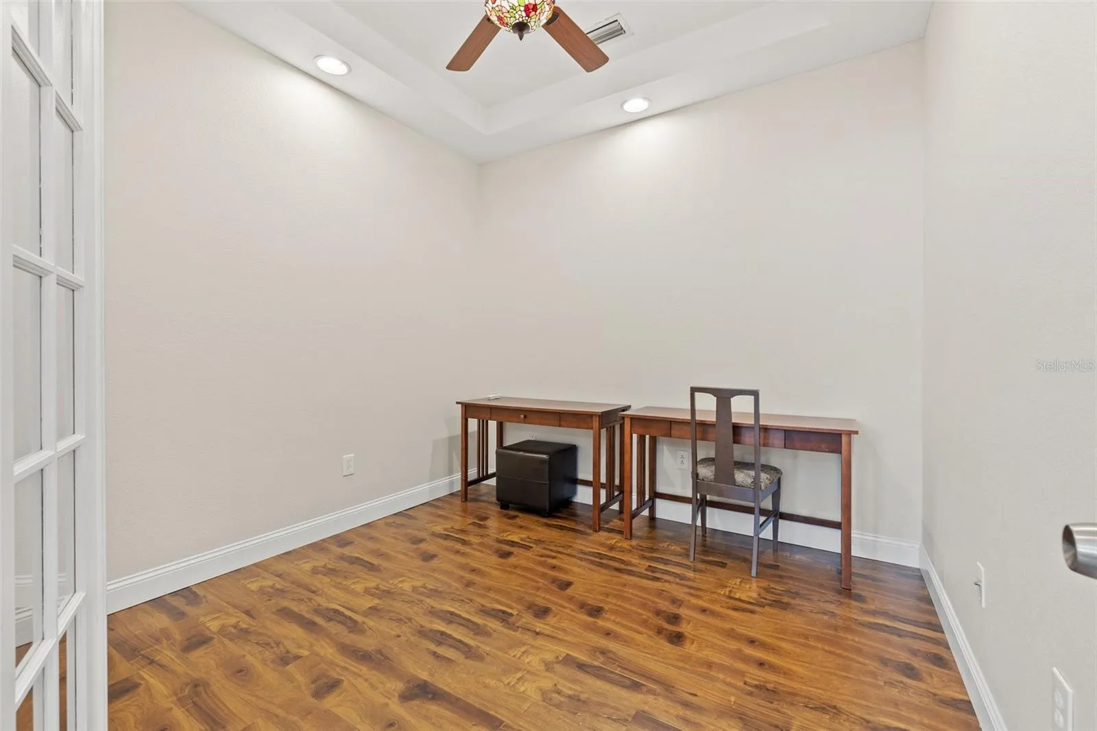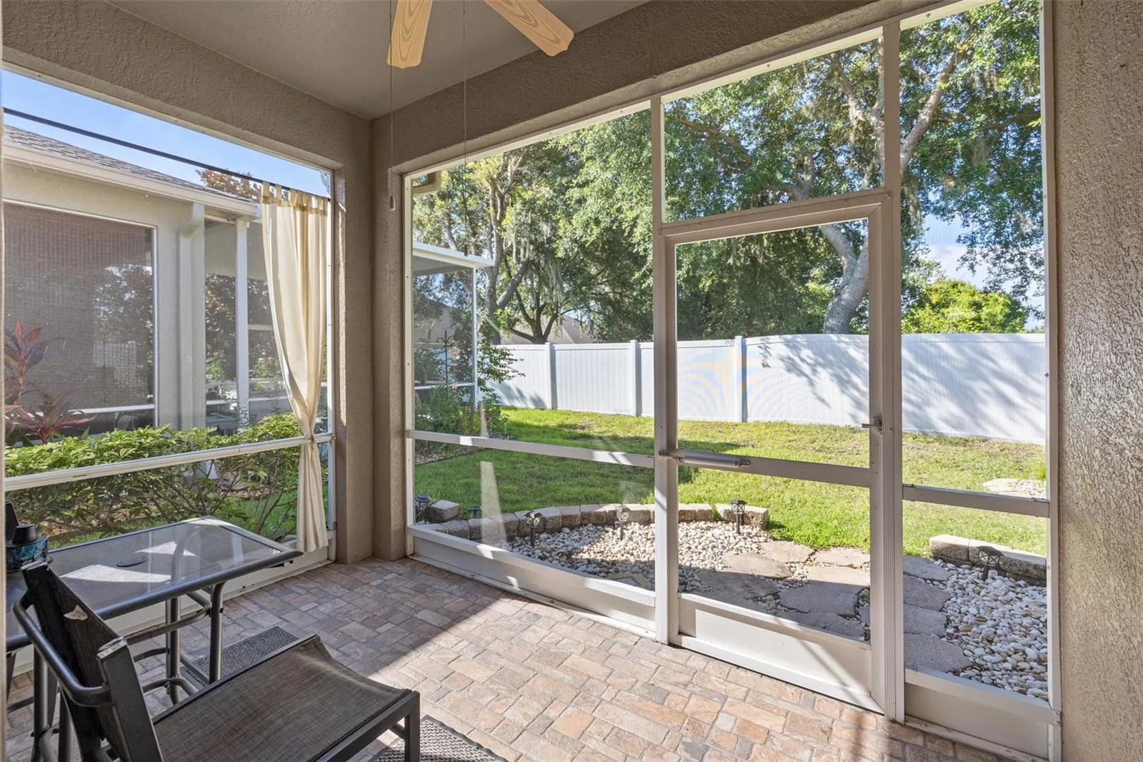 Discover the tranquil lifestyle of Larkenheath in this delightful villa located within a secure gated community. This home seamlessly combines comfort and sophistication with a well thought out design. Featuring 2 bedrooms with a split floor plan for added privacy. The primary bedroom has an oversized walk-in closet, offering exceptional storage space. This home also includes an ADDITIONAL flexible room perfect for using as a den, OFFICE, or guest accommodations. The kitchen has beautiful quartz countertops, while the bathrooms have cultured marble counters. Enjoy the durability of laminate flooring throughout the home, complemented by tile in the kitchen and bathrooms. Plantation shutters are on every window adding a touch of elegance to all the rooms. Relax in the peaceful screened-in lanai, featuring porcelain tile pavers – ideal for unwinding or entertaining. The clubhouse is adjacent to the Larkenheath community and includes a swimming pool, tennis courts, playground, and fitness center. Schedule your showing today and experience the warm welcome this maintenance free villa provides.
