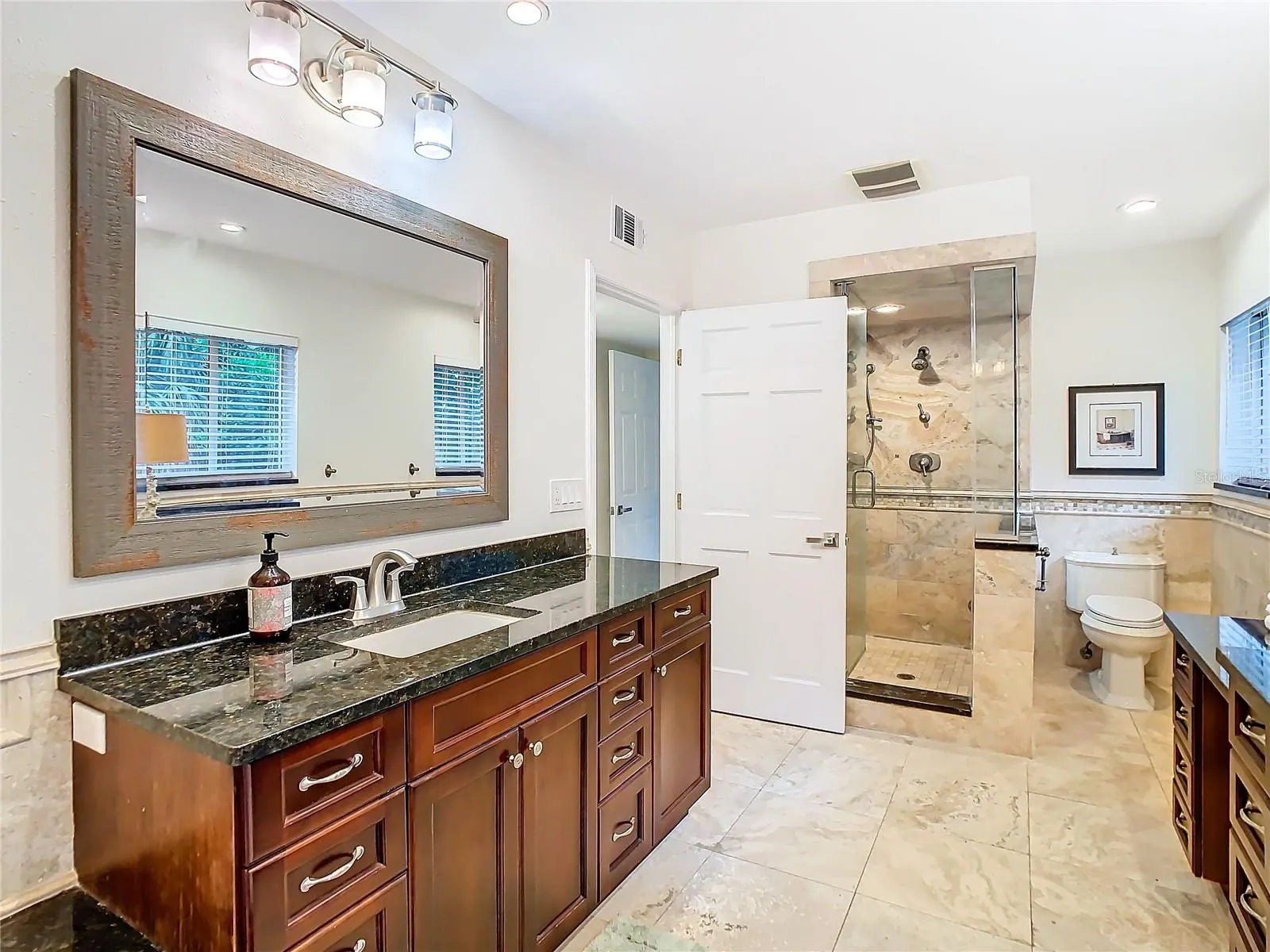 - Ceiling Fans(s), Crown Molding, Thermostat, Walk-In Closet(s), Eat-in Kitchen, Kitchen/Family Room Combo, Primary Bedroom Main Floor, Window Treatments, Stone Counters, Solid Wood Cabinets, Wet Bar, PrimaryBedroom Upstairs