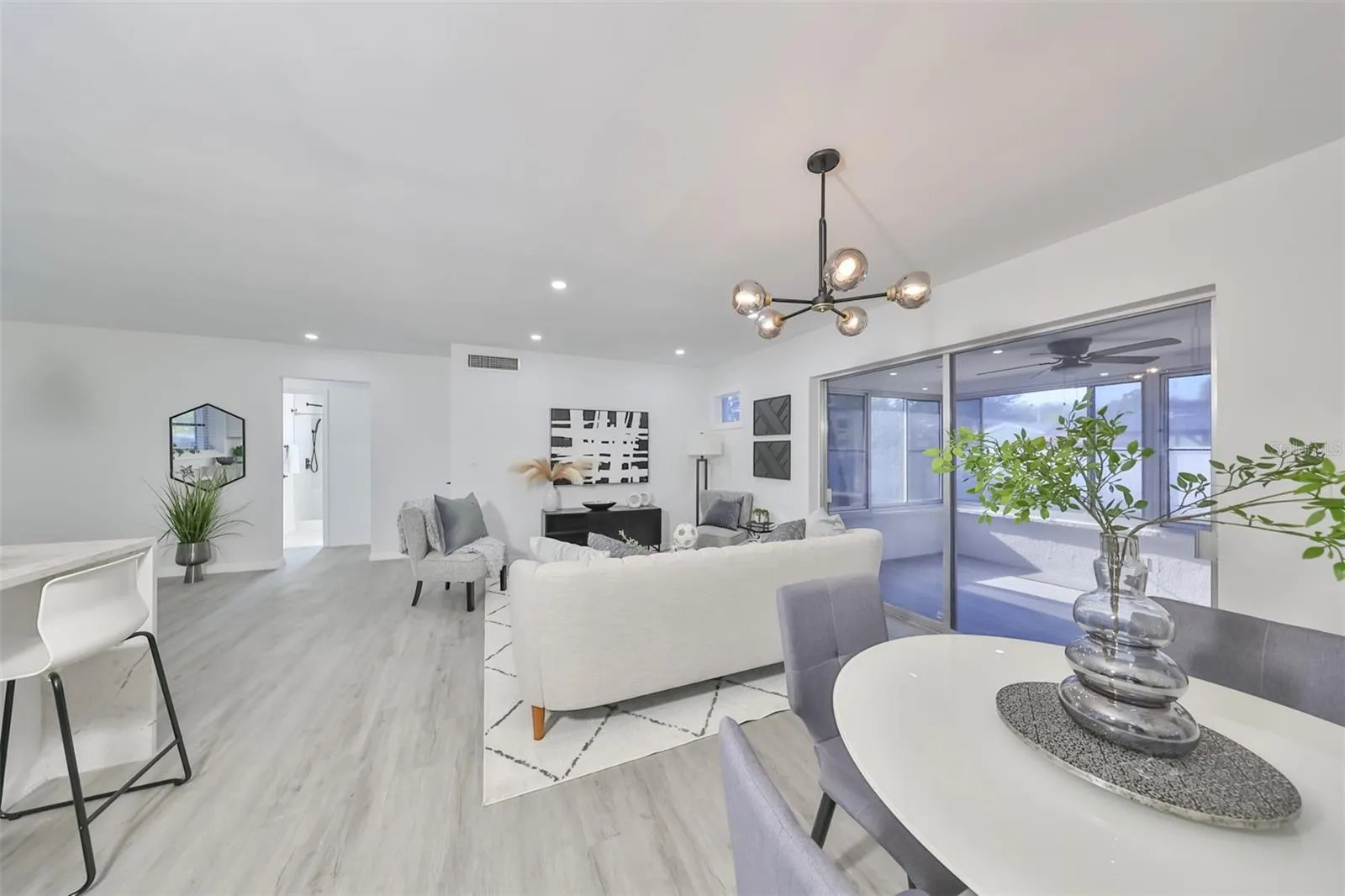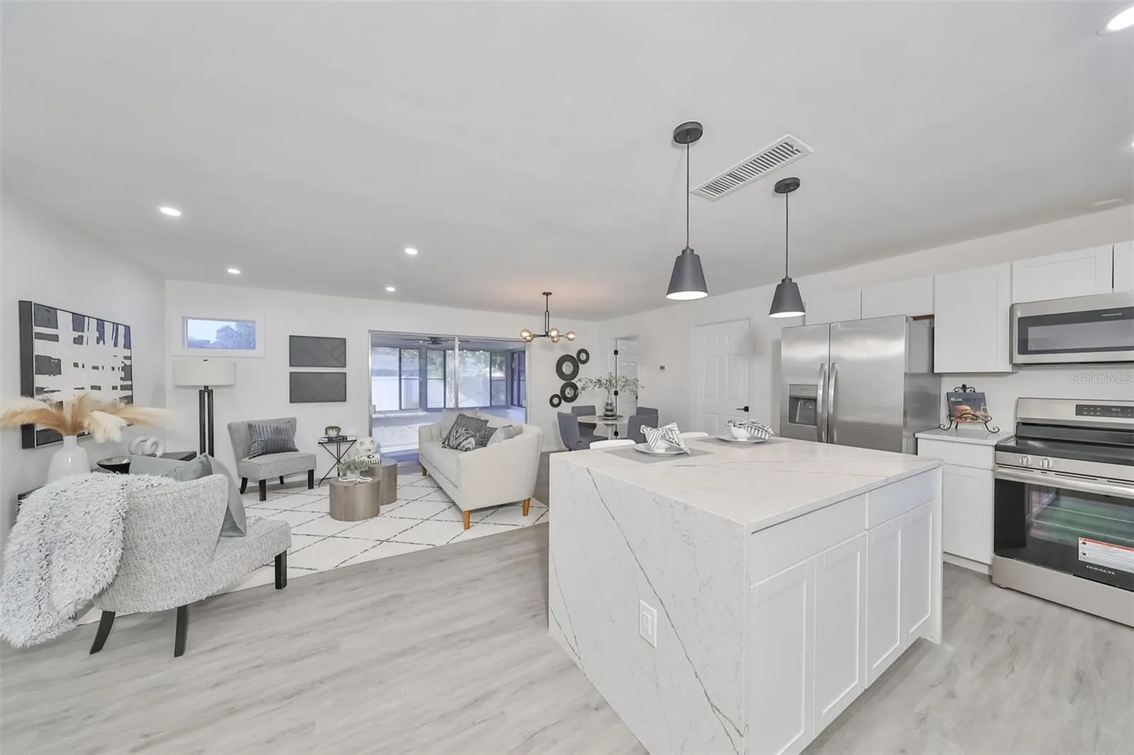 “Cute as a Button” – Welcome to this completely updated 2 bedroom, 2 bathroom home with an attached two-car garage and bonus room with nearly 1000 sqft of living space. The open floor plan is ideal with the reimagined kitchen as the heart of the home. It boasts a fresh design with crisp white soft close cabinets, custom quartz countertops, a stainless steel appliance package, and a waterfall island which allows for ample seating. Flexible seating and dining options can be created with the bonus room off the back of the living and dining area. Both bathrooms have been completely updated with a walk-in shower and custom tile work in each. A convenient laundry is located in the finished garage space with a door to access the backyard. Fantastic location for access to the beach and is perfect for the first-time home buyer or snowbird who is looking to spend the winter months here. Would make an ideal rental as well. Located in a nonflood zone.