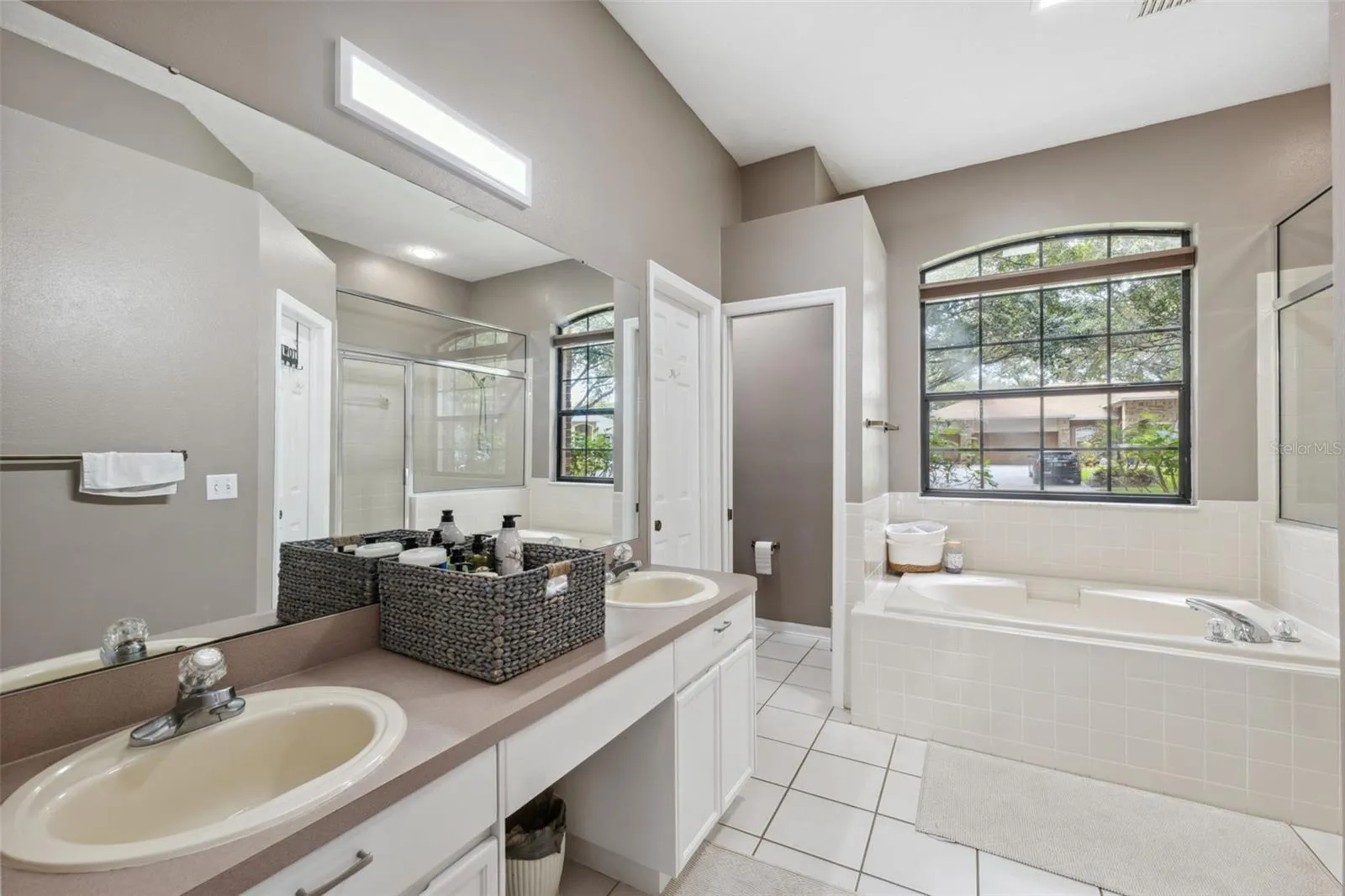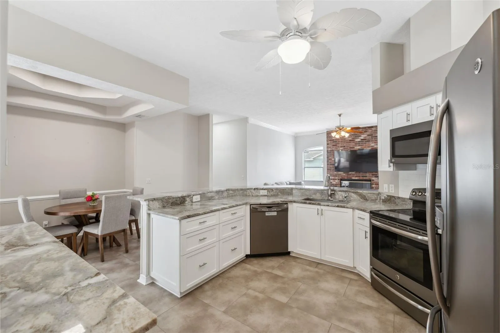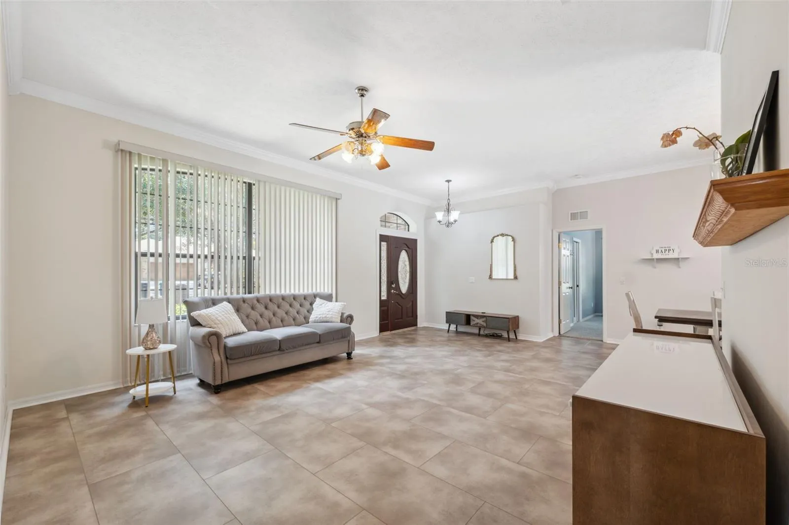 - Ceiling Fans(s), Crown Molding, Thermostat, Living Room/Dining Room Combo, Eat-in Kitchen, Kitchen/Family Room Combo, Primary Bedroom Main Floor, Split Bedroom, Window Treatments, High Ceilings, Stone Counters, Solid Wood Cabinets, Solid Surface Counters