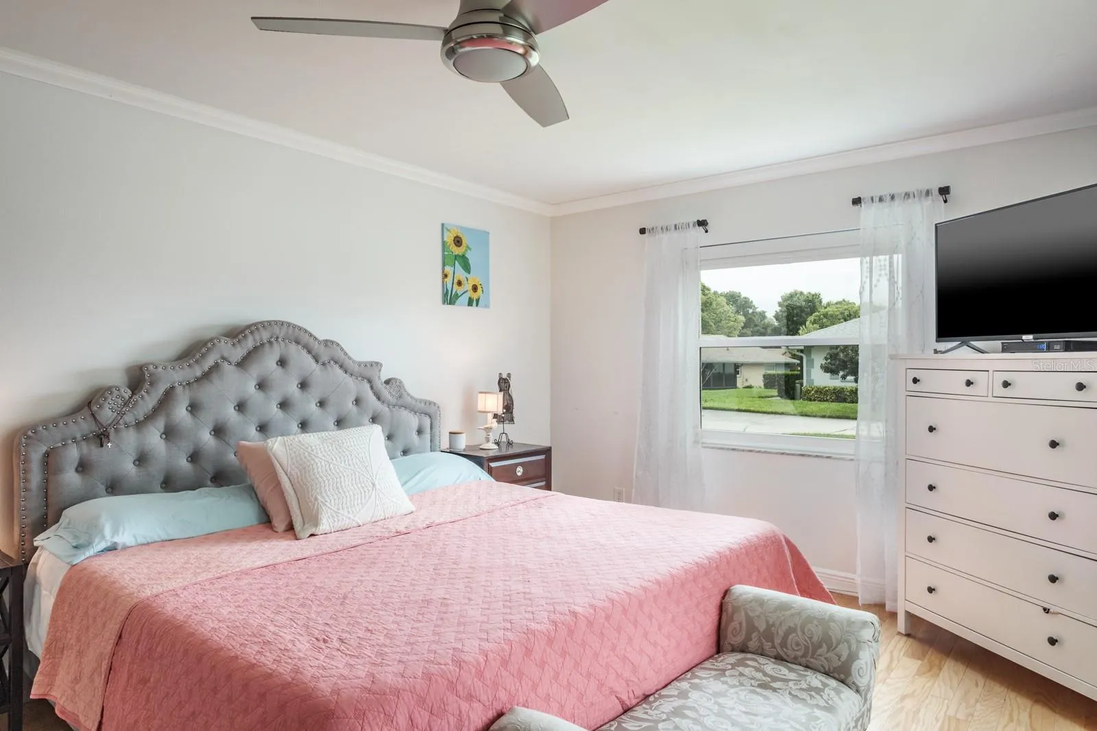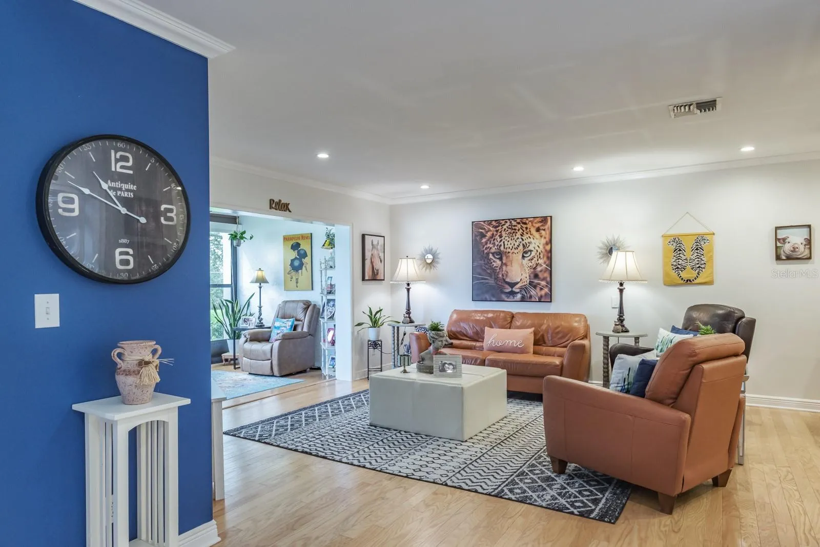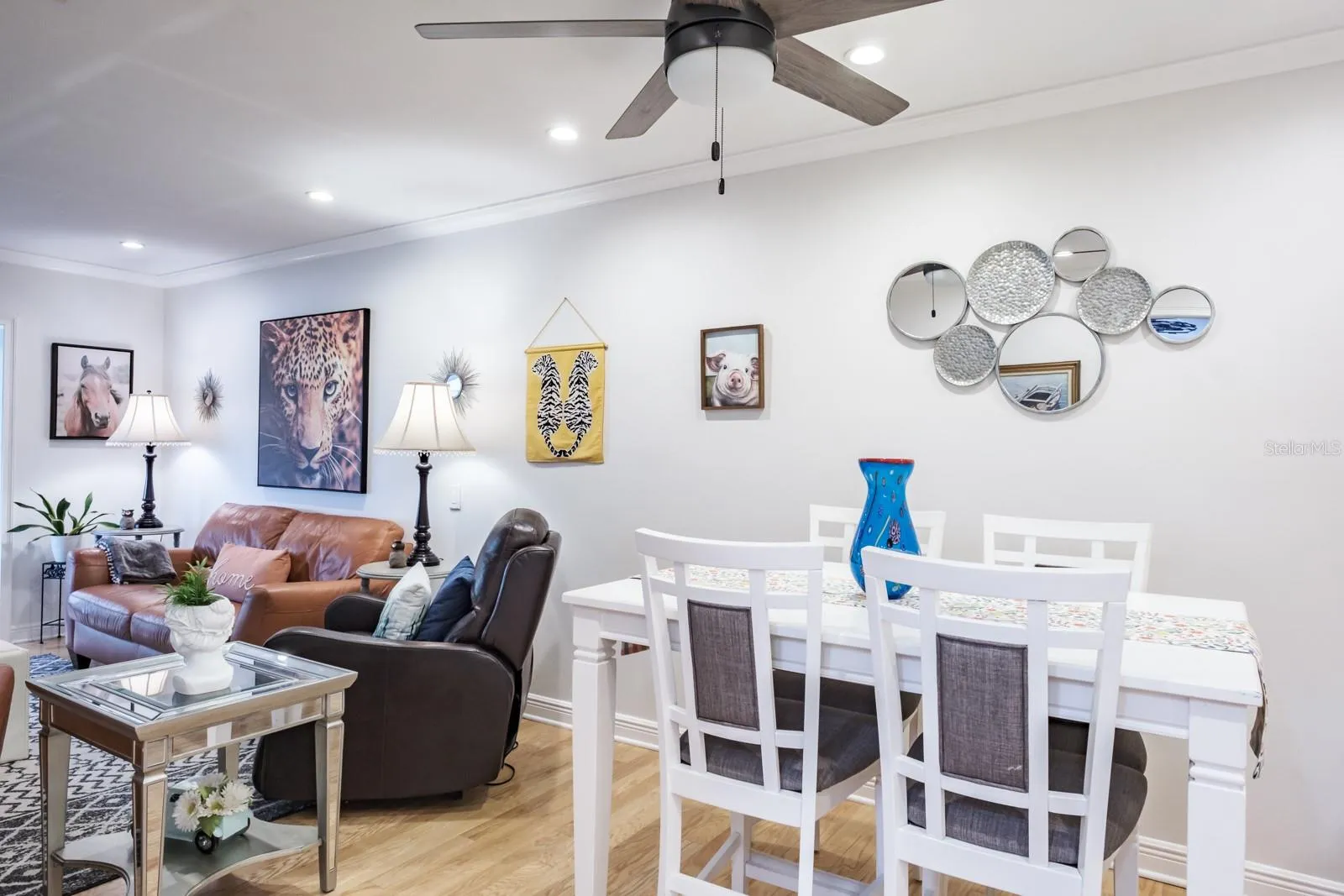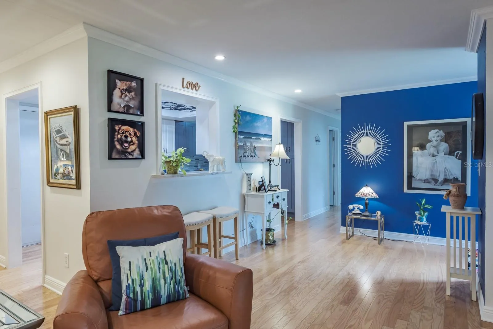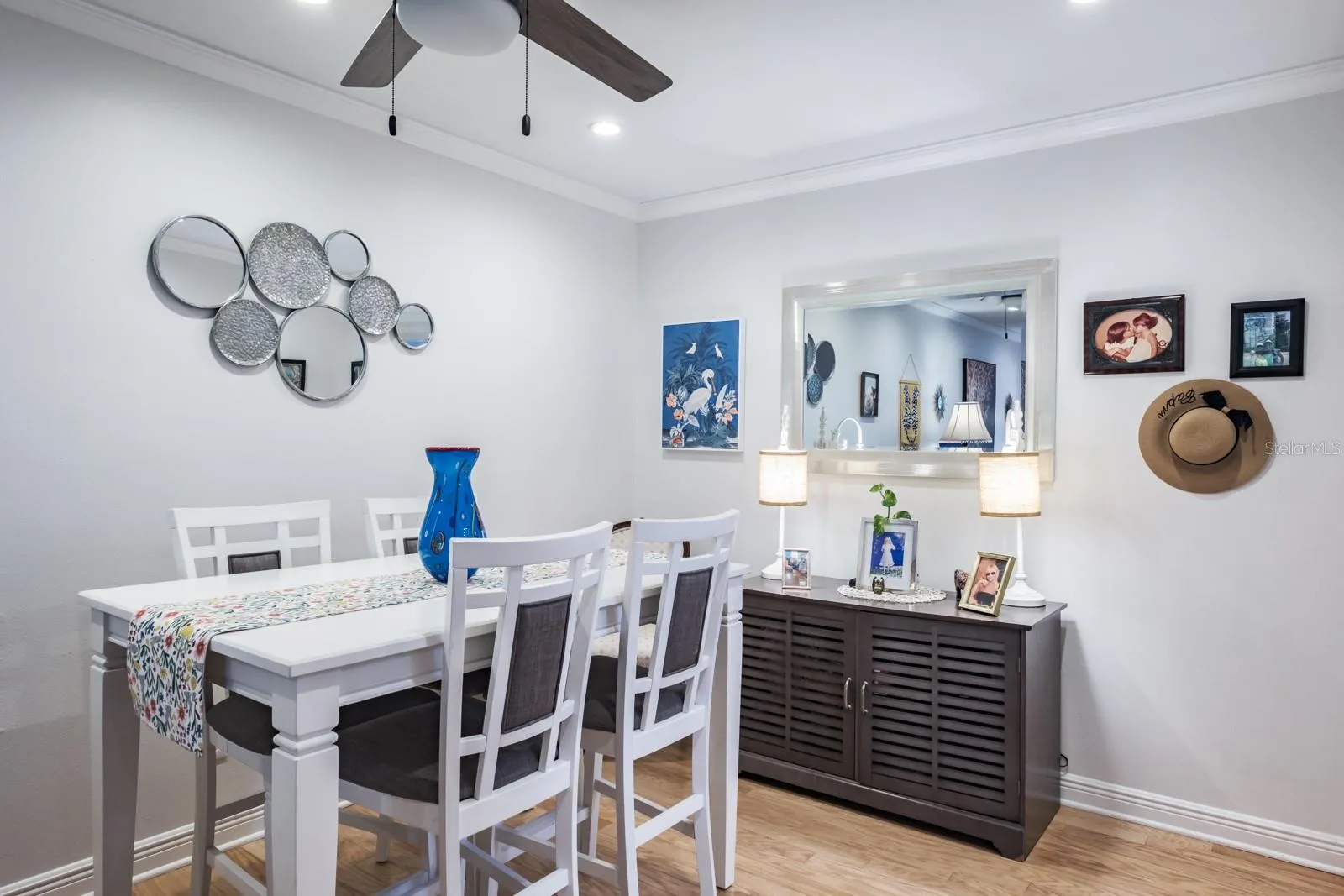 Location, Location, Location!!! Fabulous Dunedin… be prepared to be impressed!!! Pride of ownership abounds in this immaculate, updated, move-in-ready one-story villa that offers over 1,100 sq ft of living space with 2 bedrooms, 2 bathrooms and 1 car garage. Enter through the beautifully landscaped front patio to the main living space offering an open floor plan with living and dining areas ideal for entertaining and family gatherings. The space features wood flooring, crown molding and recessed lighting. The kitchen is a showstopper and culinary dream, quartz counters with grey and white wood cabinetry boasting pull-out butler drawers, lazy Suzanne and a cabinet pantry with butler drawers, tile backsplash, upgraded hardware, SS appliances including 4 door refrigerator, ceran top range, dishwasher, built-in microwave, dual undermount SS sinks all accented with upgraded designer and recessed lighting. This home offers a generous bonus with an enclosed, air-conditioned Florida Room with an abundance of natural light. Family and entertaining space is extended in this private, tranquil setting overlooking lush landscaping. Both bedrooms are located on the opposite side of the home with spacious primary bedroom offering wood flooring, crown molding, large walk-in closet and ensuite with designer vanity, undermount sink and full walk-in shower. The secondary bedroom provides wood flooring, crown molding and a generous wall closet. The conveniently located hall bath provides a single designer vanity with tub/shower combination. Additional updates include Water Heater (2023), AC (2017), Newer Electrical Panel, Newer Windows, Roof 2014, Garage Door (2021). This is truly a retirement paradise with maintenance free living in the sought after community of Scotsdale just minutes from charming downtown Dunedin and its fabulous vibe for shopping, restaurants, festivals, entertainment and parks. Near to medical and of course, the magnificent Gulf beaches are moments away! HOA fee includes community pools, tennis/pickleball courts, exterior and grounds maintenance, trash, water, cable TV and internet. True carefree Florida living!