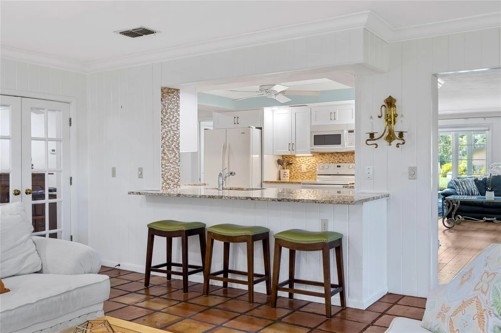 The beautifully updated kitchen boasts gorgeous granite countertops and a complementary tile backsplash. It’s open to the great room and includes a breakfast bar, ideal for quick meals. Adjacent to the kitchen, you’ll find the dining room on one side and a versatile bonus space on the other, perfect for a hobby room, playroom, or game room as it’s currently staged.