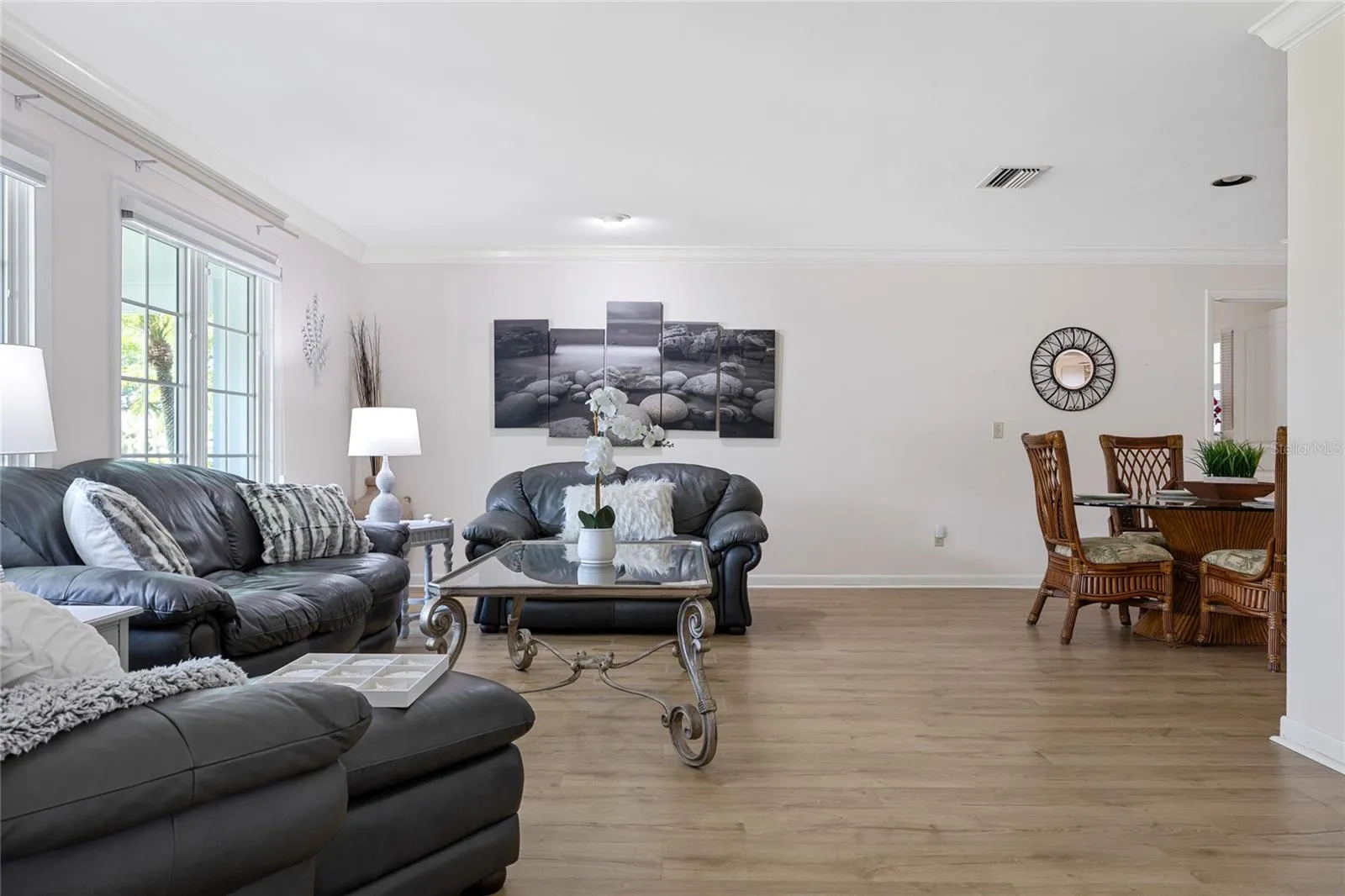 Upon arrival, you’ll be greeted by a spacious front porch, setting the tone for the warmth and charm inside. The house features a split bedroom floor plan with a formal living room and an expansive great room, perfect for entertaining and gathering with friends and family. Luxury vinyl wood-look plank and Mexican tile flooring in the main living areas make maintenance a breeze, while crown molding in most rooms adds a touch of elegance.