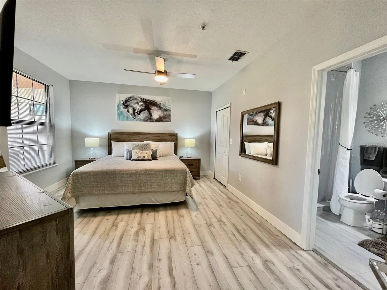 - Ceiling Fans(s), Open Floorplan, Thermostat, Walk-In Closet(s), Split Bedroom, Window Treatments, Stone Counters, Solid Wood Cabinets