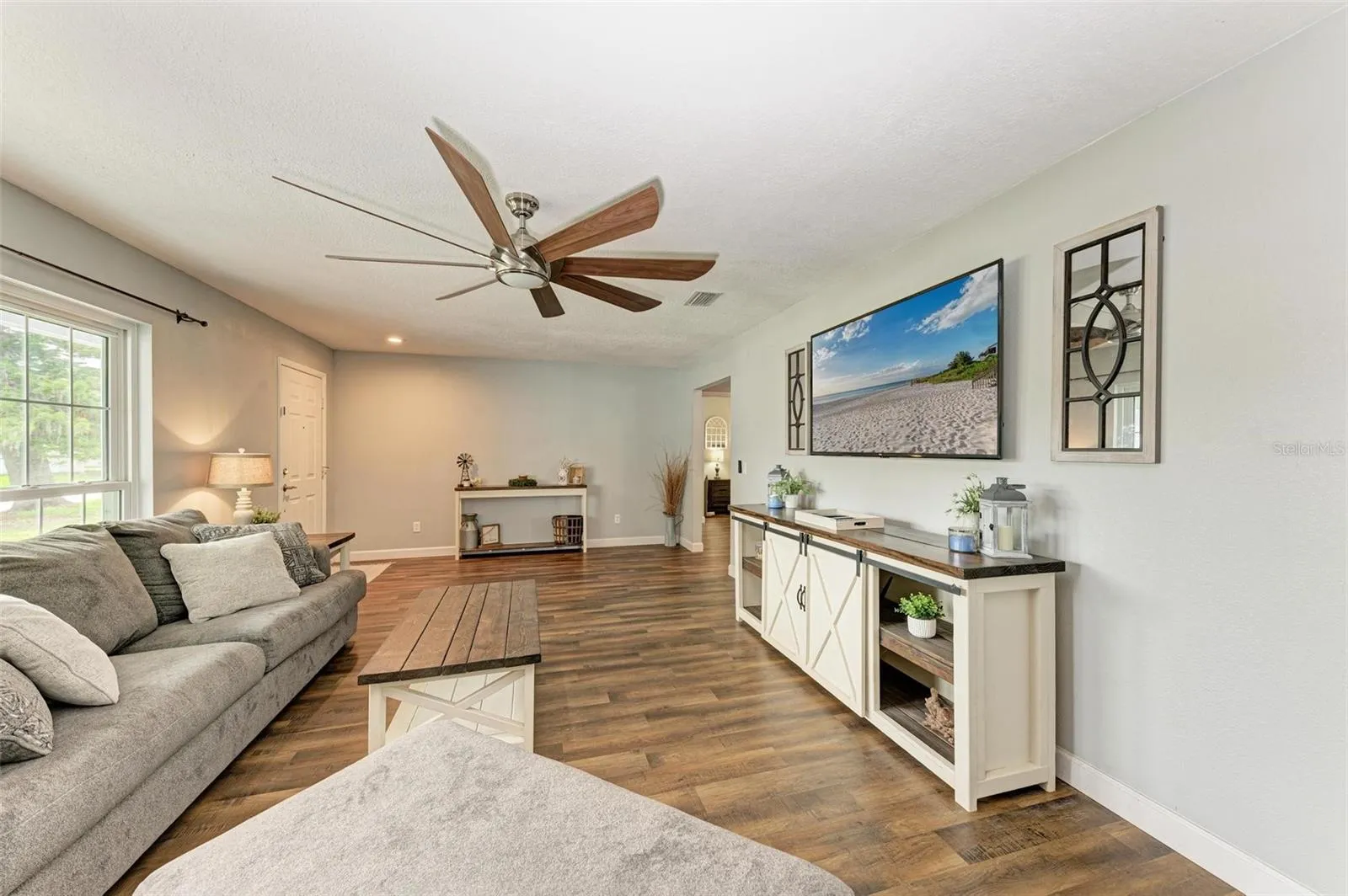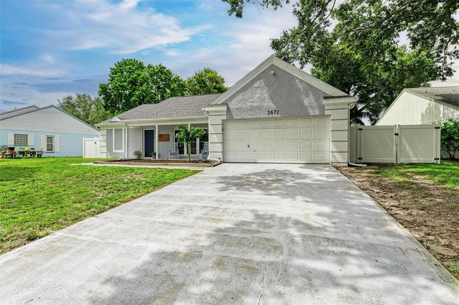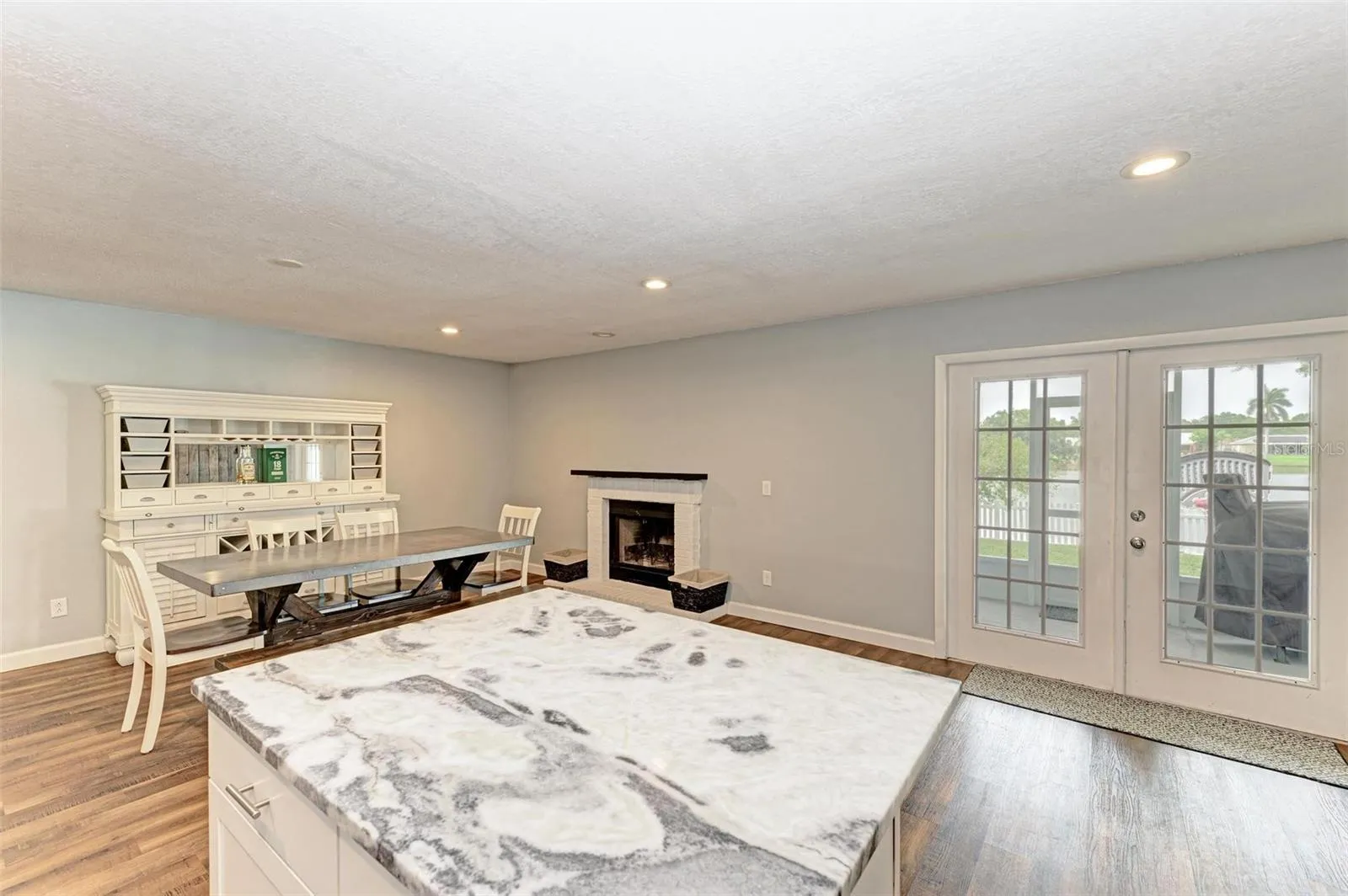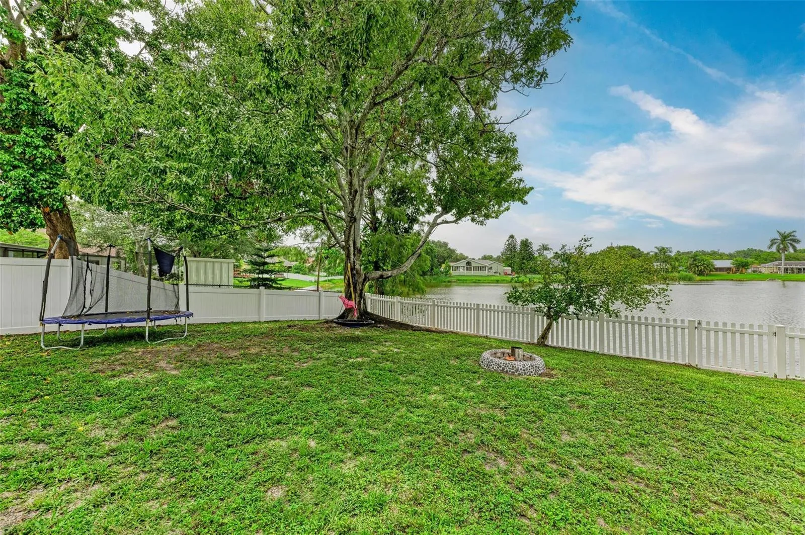 WOW. All the big ticket items have been taken care of in this stylishly updated home and it’s ready to move right in. Hurricane impact windows 2021, New roof 2023, Exterior vinyl siding, soffit and fascia 2024, hot water heater 2024, Newly installed screened patio 2024, HVAC ductwork replaced in 2020. Enjoy living in a centrally located Manatee County neighborhood with NO DEED RESTRICTIONS and NO HOA FEES. The large fenced yard also has a double wide gate to park your boat/toys, while providing a beautiful **lake view** – this is a bird watcher’s dream! The open floorplan features a split plan with Luxury Vinyl flooring throughout. The Kitchen has shaker style white cabinets, and stone countertops, a large island and stainless appliances (new refrigerator). The adjoining dining room has a real fireplace! Large walk-in closet in Master Suite and built-in closets in Bedroom 2. Interior laundry room with newer washer and dryer and built-in storage cabinets. The two car garage has pull down stairs for attic access. This one truly checks all the boxes and will not last long!