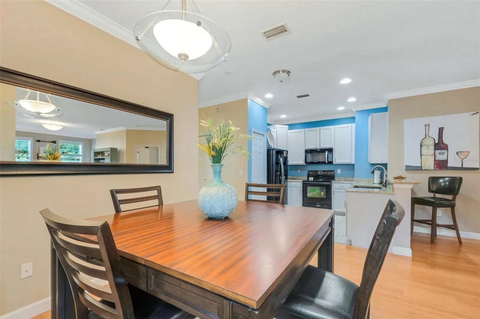 Welcome to this beautiful corner unit condo on the ground floor, nestled in the highly sought-after neighborhood of Westchase in Tampa, Florida. As you approach the front entrance, you’re greeted by a welcoming front porch, perfect for enjoying conversations with neighbors and admiring the picturesque courtyard and mature oak trees. Step inside to discover stunning bamboo flooring throughout, abundant natural light, and an inviting open floor plan. Crown molding adorns the home, adding a touch of elegance to every room. The chef-inspired kitchen is sure to impress, boasting modern appliances, ample cabinetry, and a convenient breakfast bar. With its seamless blend of functionality and style, this kitchen is perfect for both quick meals and culinary adventures. The dining room, living area, and kitchen flow seamlessly together, creating an ideal space for entertaining guests. With 10-foot ceilings, the home feels spacious and inviting. Retreat to the master bedroom, conveniently located off the living room, offering a comfortable sanctuary. The ensuite bathroom features his and her sinks and a grand rainfall glass shower, along with a spacious walk-in closet and an additional linen closet for storage. At the rear of the house, you’ll find a bright and airy second bedroom with a large wall-to-wall closet complete with built-ins. A full-piece bathroom with a shower and tub serves this bedroom and guests alike. The laundry area is conveniently located in its own space, recently converted to a stackable unit for added convenience, yet easily convertible for other needs. Don’t miss out on the opportunity to make this exceptional condo your own. Schedule a showing now before it’s gone!