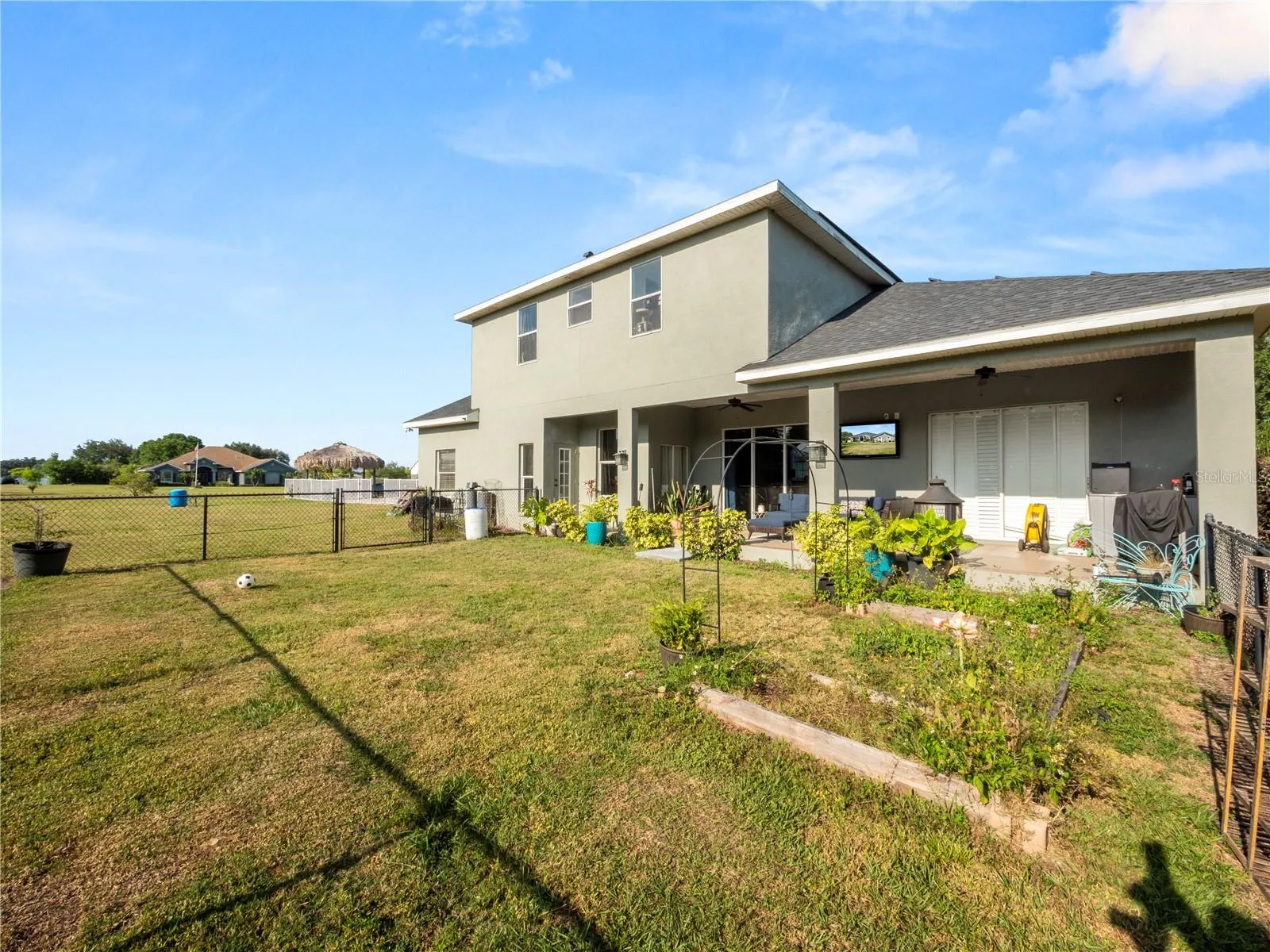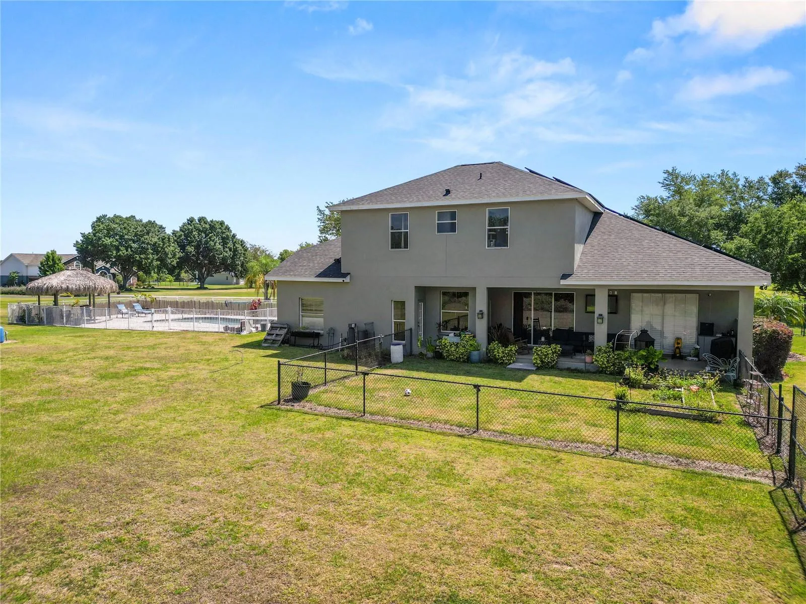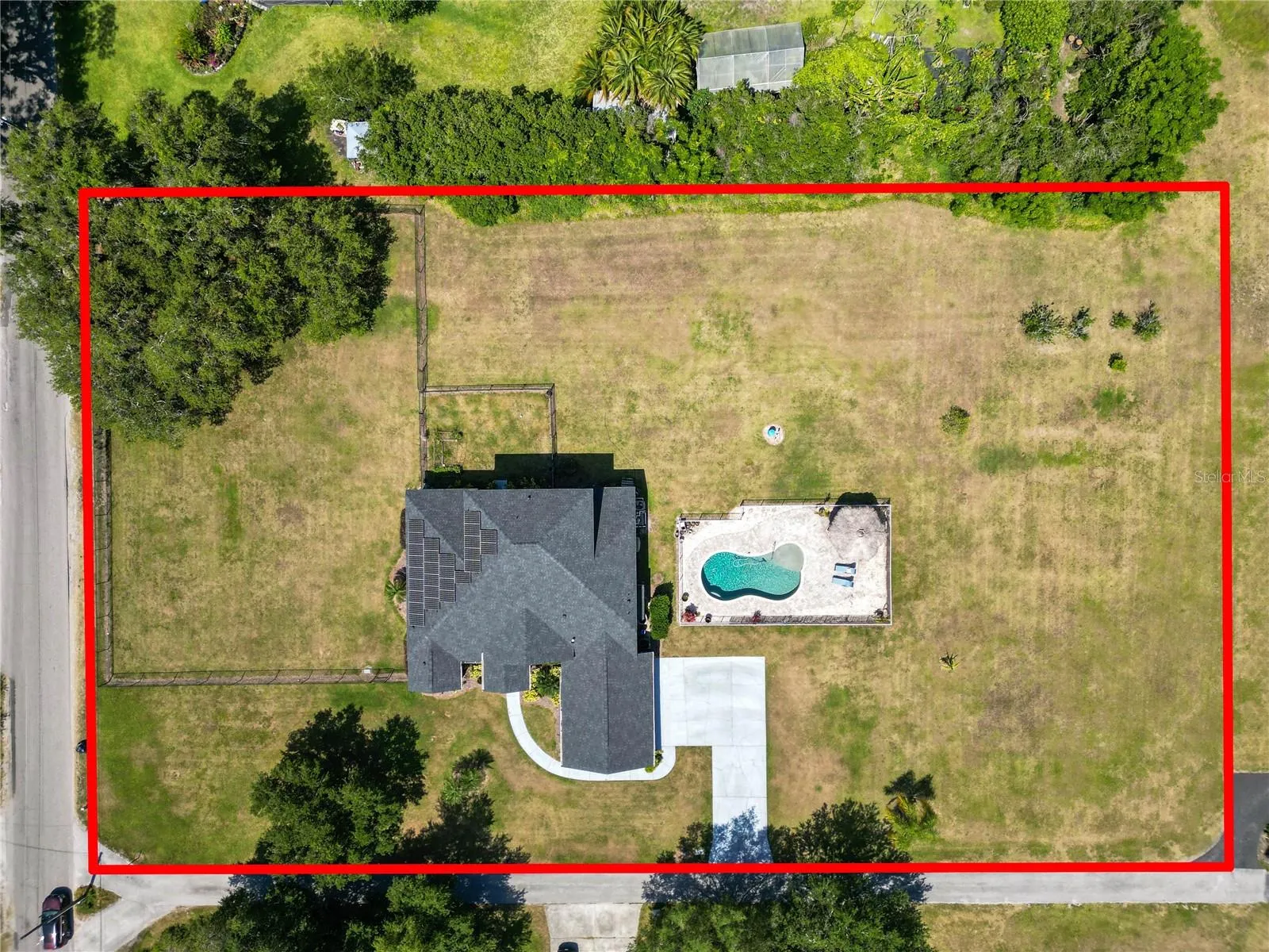 Welcome to your dream oasis nestled within the tranquil confines of a serene community! This remarkable property boasts all the elements of luxury living combined with the tranquility of a private retreat with NO HOA. Situated on a sprawling 1.2-acre partially fenced in lot, this magnificent 6-bedroom, 4-bathroom haven offers over 3700 square feet of impeccable living space. The roof was replaced in 2022 and the 2 AC units in 2017. The pool pump was also replaced in 2022 and the pool vacuum and LED pool light replaced in 2023. The home is solar powered with a battery back up system and fully paid off solar panels which keeps your electric bill very low! Upon arrival, you’ll be captivated by the lush greenery and peaceful ambiance that envelops this residence. Stepping inside, you’ll be greeted by an inviting open floor plan that seamlessly connects the various living spaces, perfect for both entertaining guests and everyday living. The heart of the home is undoubtedly the gourmet kitchen, adorned with exquisite granite countertops and a breakfast bar, ideal for casual dining or socializing while preparing culinary delights. With the dishwasher being replaced in 2022 and a new refrigerator installed in 2023. Equipped with a gas range and built-in oven, this kitchen is a chef’s paradise, offering both style and functionality. Adjacent to the kitchen, discover a separate dining area, providing a sophisticated setting for intimate dinners or festive gatherings with loved ones. Retreat to the luxurious primary bedroom suite, boasting ample space, walk-in closets, and a lavish ensuite bathroom complete with dual vanity sinks, a rejuvenating soaking tub, and a spacious walk-in shower, offering the epitome of comfort and relaxation. The first floor also features a separate den/office space, currently being used as a “glam room”, and also would make a great work from home space, 3 additional bedrooms and two full bathrooms, along with your indoor laundry room that leads to your 3 car garage! Upstairs, a generous loft area awaits, offering versatile space for a home office, media room, or play area. There is also a large storage room perfect for seasonal decorations storage. Two additional bedrooms and the 4th full bathroom, provide privacy and comfort for family members or guests. Step outside into your own private paradise, where a sparkling pool beckons on warm summer days. Surrounding the heated salt water pool is a stylish paver deck, perfect for lounging in the sun or hosting al fresco gatherings. Adjacent to the pool, a large tiki hut with fan installed awaits, providing shade and a charming ambiance for outdoor entertaining or simply unwinding with a refreshing beverage. With its spacious layout, luxurious amenities, and idyllic setting, this extraordinary pool home offers the perfect blend of comfort, style, and tranquility. Transferable Home Warranty paid in full until February 17, 2026! Don’t miss your opportunity to make this slice of paradise your own! Schedule your private tour today and experience the epitome of upscale living.