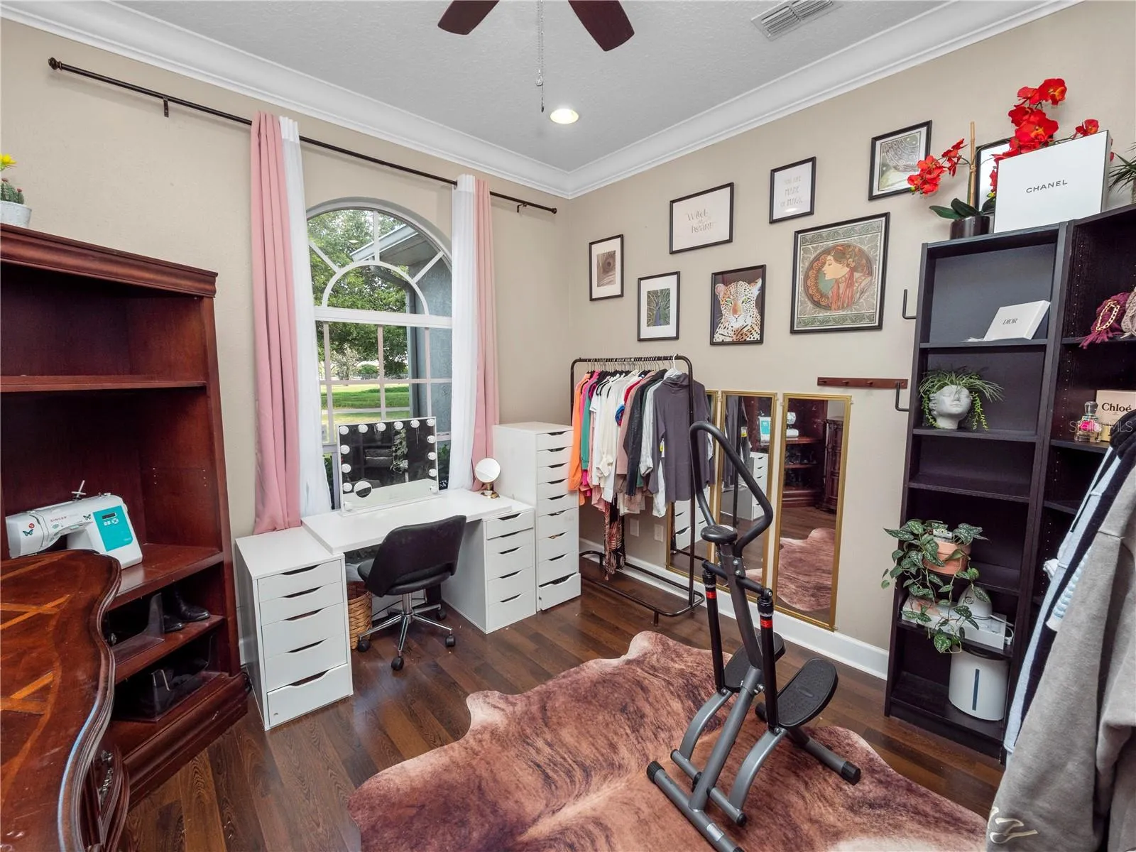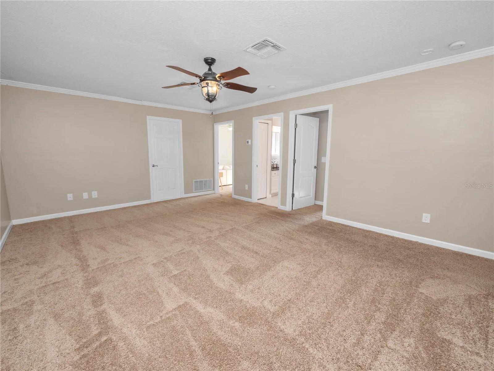 - Ceiling Fans(s), Crown Molding, Open Floorplan, Thermostat, Walk-In Closet(s), Primary Bedroom Main Floor, High Ceilings, Vaulted Ceiling(s), Solid Surface Counters