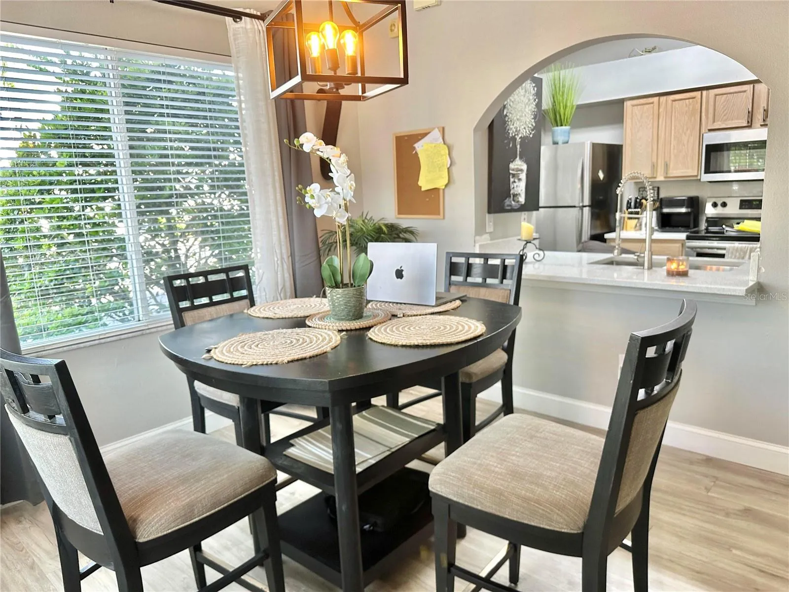 Upon entering, you are greeted by a spacious open-concept living area featuring newly installed vinyl floors, newer lighting fixtures, and large windows that flood the space with natural light. The gourmet kitchen boasts newer stainless steel appliances, white countertops, and an integrated laundry room with modern washer and dryer. A convenient half-bathroom is located in the first floor.