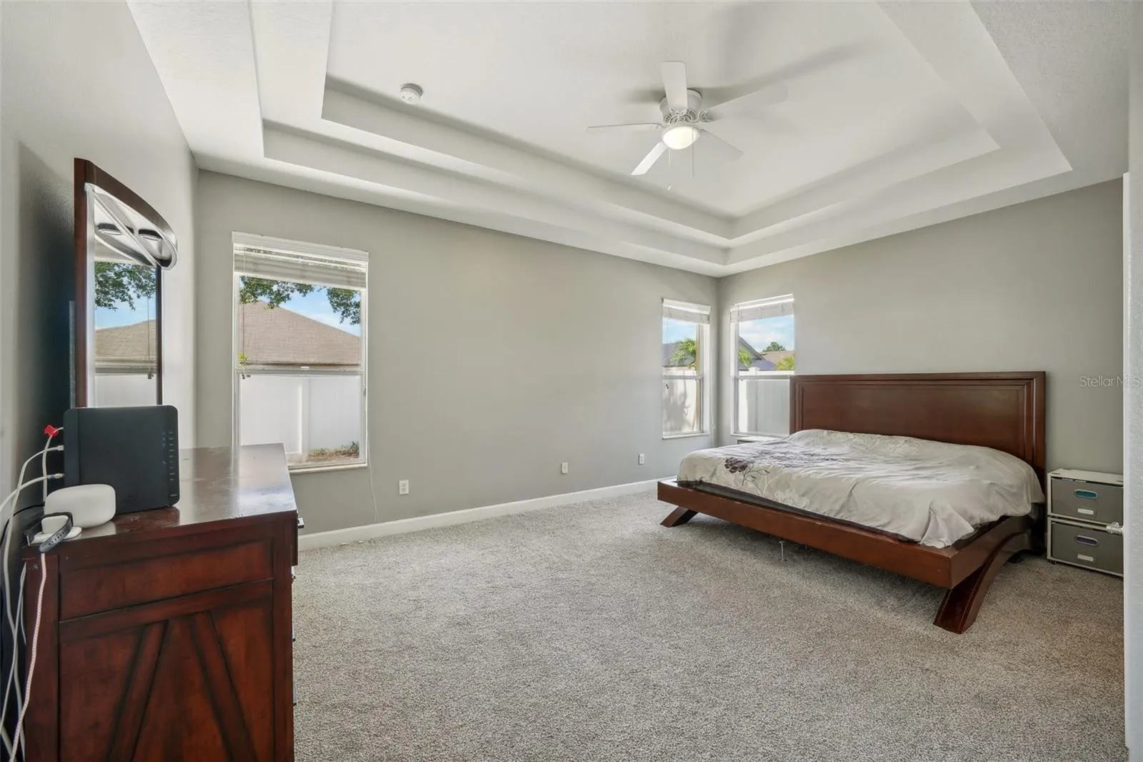 The living room features an open layout that seamlessly connects to a dedicated space for a formal dining table, combining modern design with functionality. This setup is perfect for entertaining guests or enjoying your daily meals. The flexible layout includes three bedrooms downstairs, arranged in a split bedroom floor plan that ensures privacy for all. The primary suite, situated in its own wing, offers a tranquil retreat with its tray ceiling and luxurious finishes. Upstairs, a private retreat awaits, complete with a loft bedroom and bathroom – perfect for guests, a home office, or a cozy getaway space.