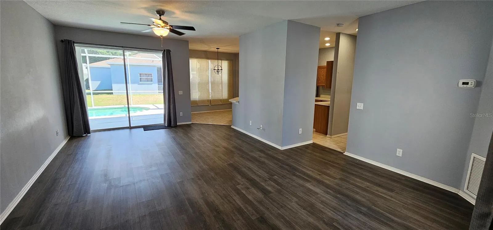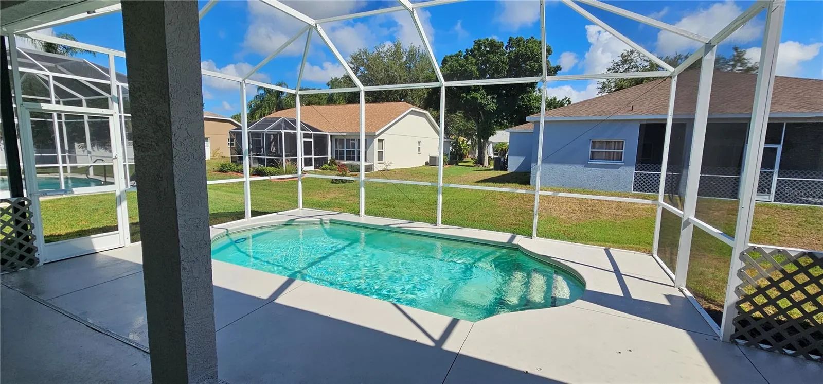 Welcome to this spacious single single family pool home for annual lease and available now. One small dog is allowed. The split floor plan with 3 bedrooms, 2 bathrooms features new luxury vinyl plank flooring throughout and the beautiful pool with covered lanai and screened in pool cage to enjoy the outdoors. The kitchen provides Corian countertops, bar seating and eat-in dining area. The master bedroom is large and provides an en-suite bath with dual sinks and walk in shower. Separate dining area just off the living area is also provided. Washer and dryer are included and located in dedicated utility room. NO SMOKING OR VAPING ALLOWED. Ground maintenance, pool service and pest control is included in rent. Community boat ramp and community park is just minutes away. Ideally located near lots of shopping, dining, grocery and entertainment. Any size pet is allowed with $300 refundable pet deposit. Required funds: first months rent and security deposit and pet deposit if applicable. Advanced rent is being waived for qualified applicants. Commercial vehicles must be parked in garage.