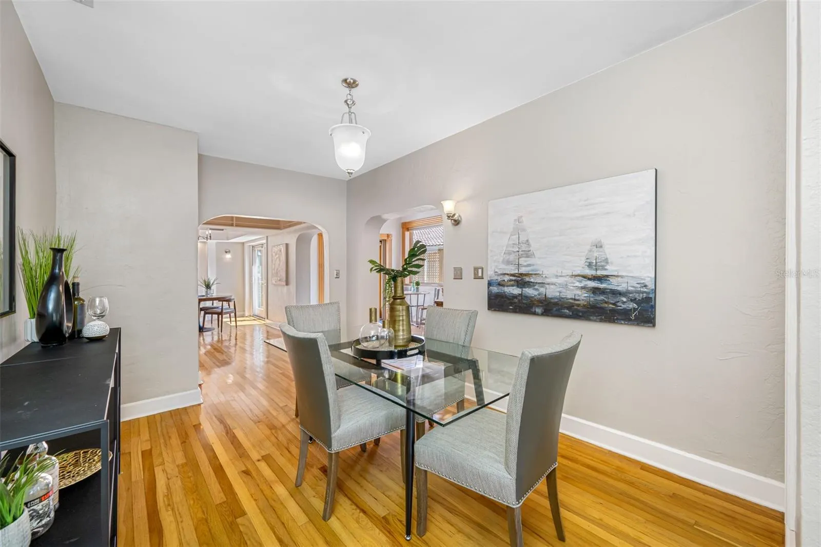 Discover the allure of this enchanting residence situated in the heart of Historic Granada Terrace in the sought-after Old Northeast neighborhood. Nestled on a meticulously landscaped lot, this block home exudes pride of ownership with its impeccably maintained exterior and interior spaces. Spanning approximately 2,300 square feet, this property boasts three bedrooms, three full bathrooms, a one-car garage with a parking pad, alley access, Anderson windows, a tankless water heater, ample storage space, and much more. Upon approaching the home, you’ll be greeted by its charming curb appeal and a delightful brick walkway leading to the front entrance. Stepping inside, you’ll immediately notice the beautifully preserved original oak flooring, creating a warm and inviting ambiance. The living room showcases many windows that offer captivating views of one of Granada Terrace’s picturesque park circles, with glimpses of the waterfront in the distance. Located at the rear of the house, the separate family room provides an ideal space for entertaining guests. The gourmet kitchen is a true chef’s dream, featuring an eat-in area, a movable granite island, a wet bar, granite countertops, and a high-end appliance package that includes a Dacor oven, Thermador gas top stove with a griddle and grill, Bosch dishwasher, and a Sub Zero refrigerator. The backyard showcases lovely yet low-maintenance landscaping, a custom outdoor shower, and a wood deck that is perfect for hosting gatherings with family and friends. Additionally, this property is just steps away from the Coffee Pot waterfront, providing easy access to outdoor recreational activities. Conveniently located near vibrant Downtown St. Petersburg, shops, dining establishments, museums, the St. Pete Pier, Renaissance Vinoy Resort, and much more, this home offers a desirable lifestyle with endless entertainment options. Don’t miss the opportunity to make this charming residence your home.