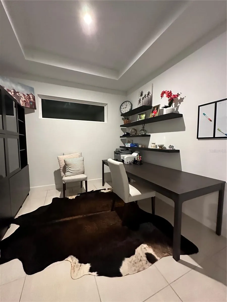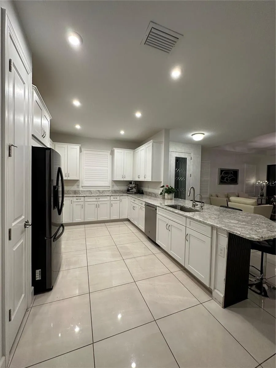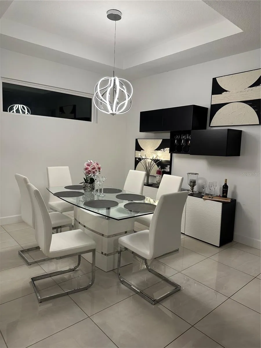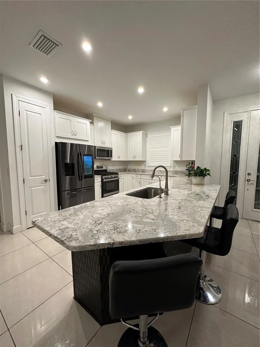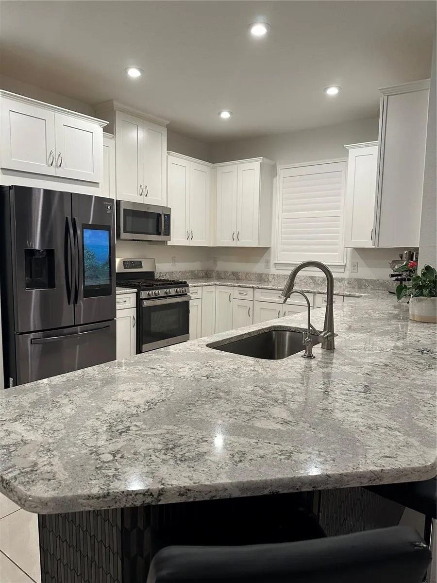The spacious open-concept living area features tray ceilings throughout and an abundance of natural light, creating a warm and inviting atmosphere. The well-appointed kitchen features modern stainless steel appliances, quartz counters, and a convenient breakfast bar, perfect for culinary enthusiasts and entertaining guests.
