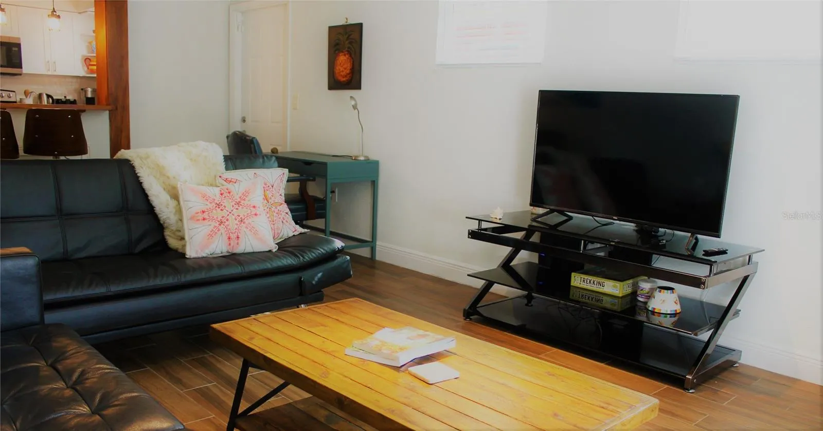 Fully furnished and all utilities included with flexible lease length options, welcome to “La Casita Solar”, a healthy and clean energy rental: solar panels and high-end water/air purification systems in place. Located just off of ALT 19 “Edgewater Drive” equidistant between downtown Clearwater and Dunedin. Backyard awaits, replete with banana trees, sea breeze, and chirping birds.. Two block walk to the intracoastal for sunsets, 12 minute drive to world famous Clearwater Beach!! Front French Doors open up into “open concept: living room, dining room table, and small office desk. Dining room flows into kitchen, which then passes thru to: laundry room, bathroom, bedroom, and then flows thru to backyard lounge chairs, coffee table, and pergola, thru the back door on the master suite. Private front/back door entry accessed via keyless number code pad. Tenants have a completely private apartment. Back yard space is common area for both apartment tenants to enjoy all amenities in back yard: pergola, lounge furniture, outdoor covered dining table, coffee table/chairs, gas grill, etc. High speed Spectrum Internet and local channels: 2 x smart T.V.’s. Dedicated desk space. Natural light throughout. Stainless steel appliances w/ dishwasher and in-unit washer/dryer.